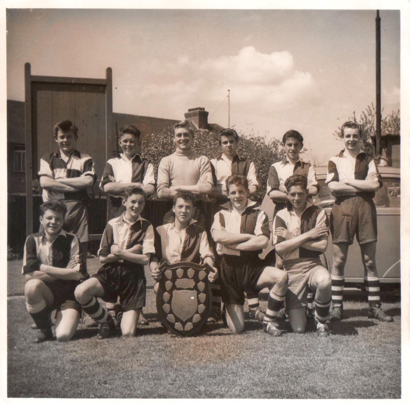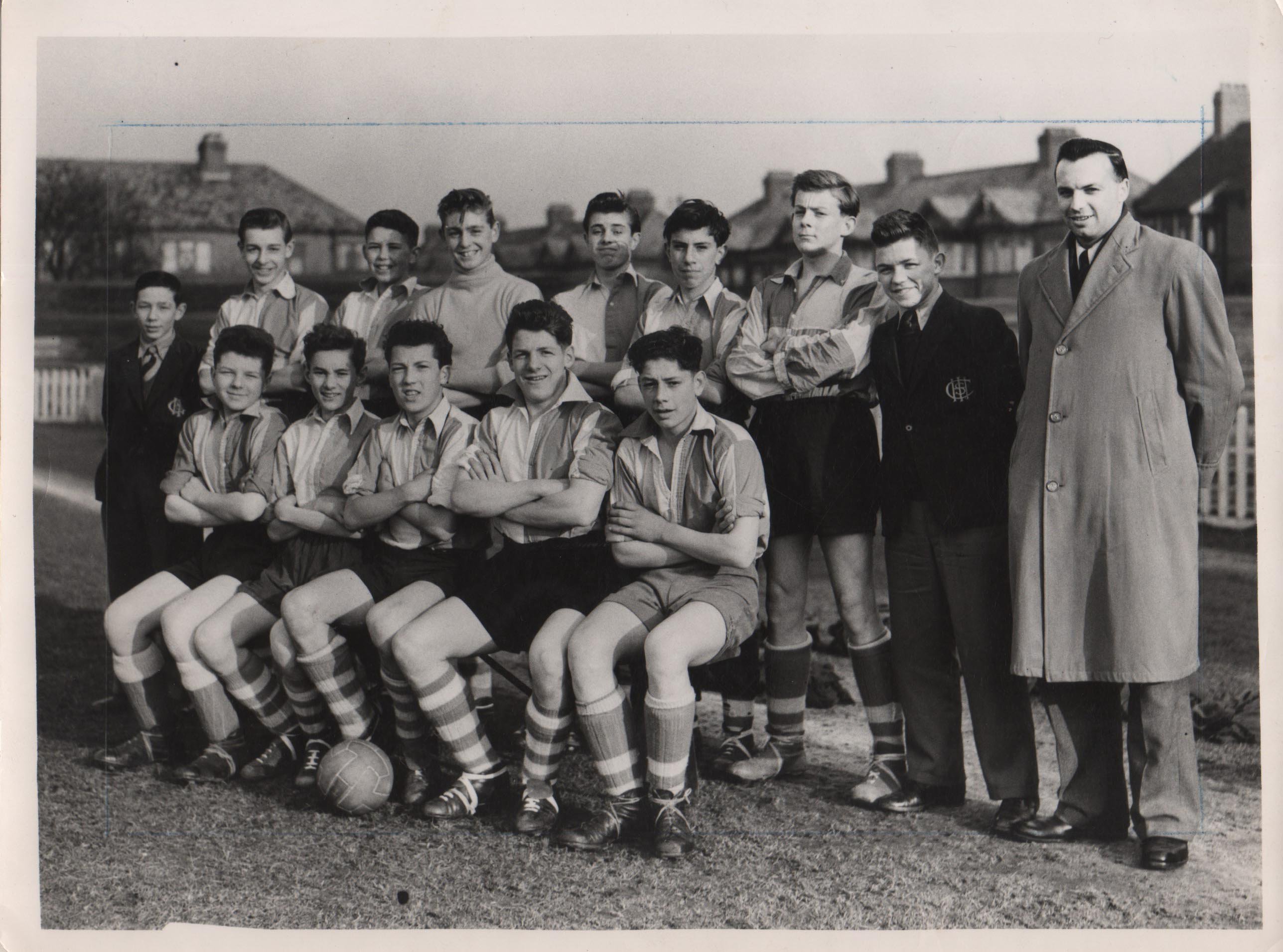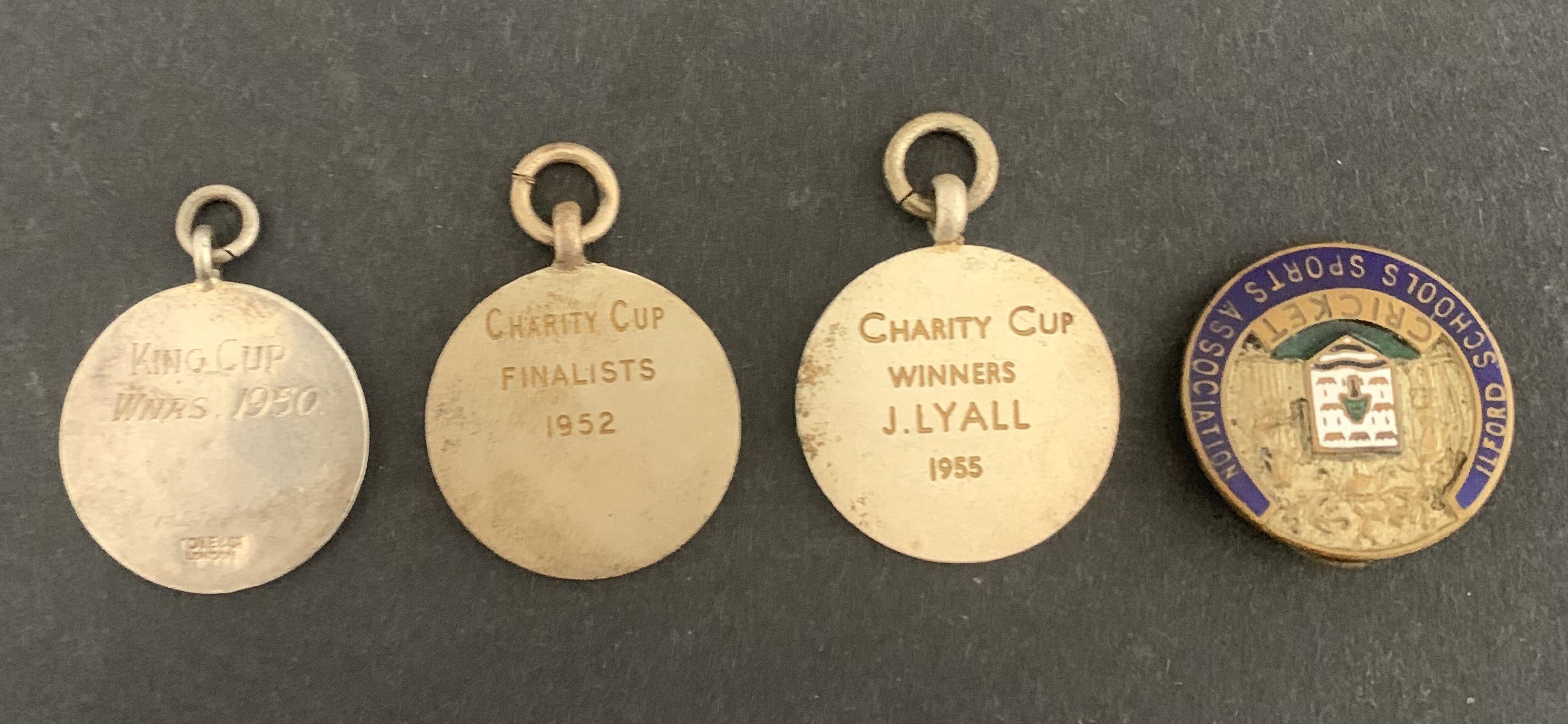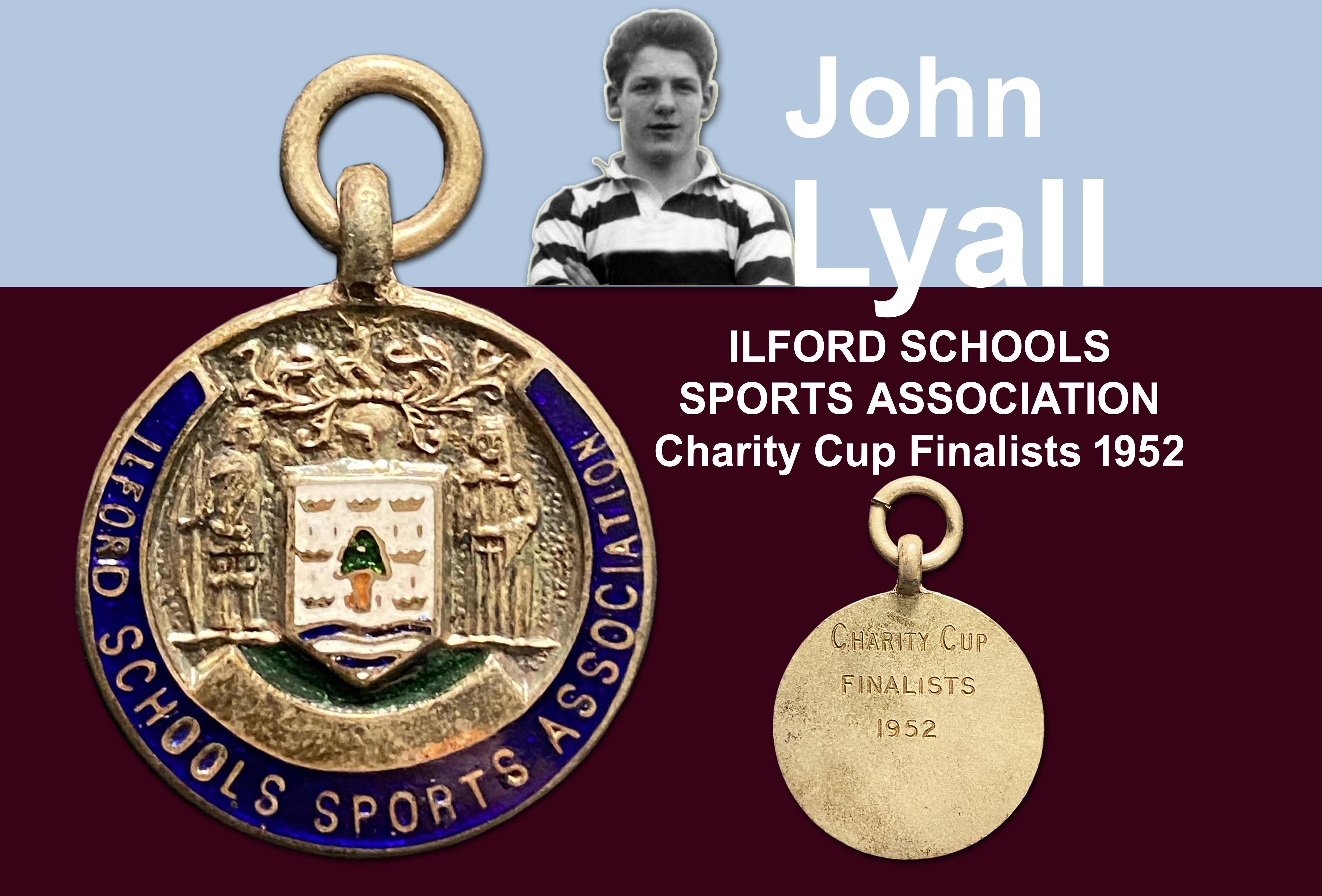 John Lyalls Ilford Schools Sports Medals: From Ilford High school there is a one mile medal and Discus and Pole Vault medals plus photographs of him v Beale school and his team with trophies in 54/55. From the Ilford Sports Association there are medals for 1950 Kings Cup winners, 1952 Charity Cup finalists, 1954 2 photos of Lyall in the cricket team and a 1955 Charity Cup winners medal.
