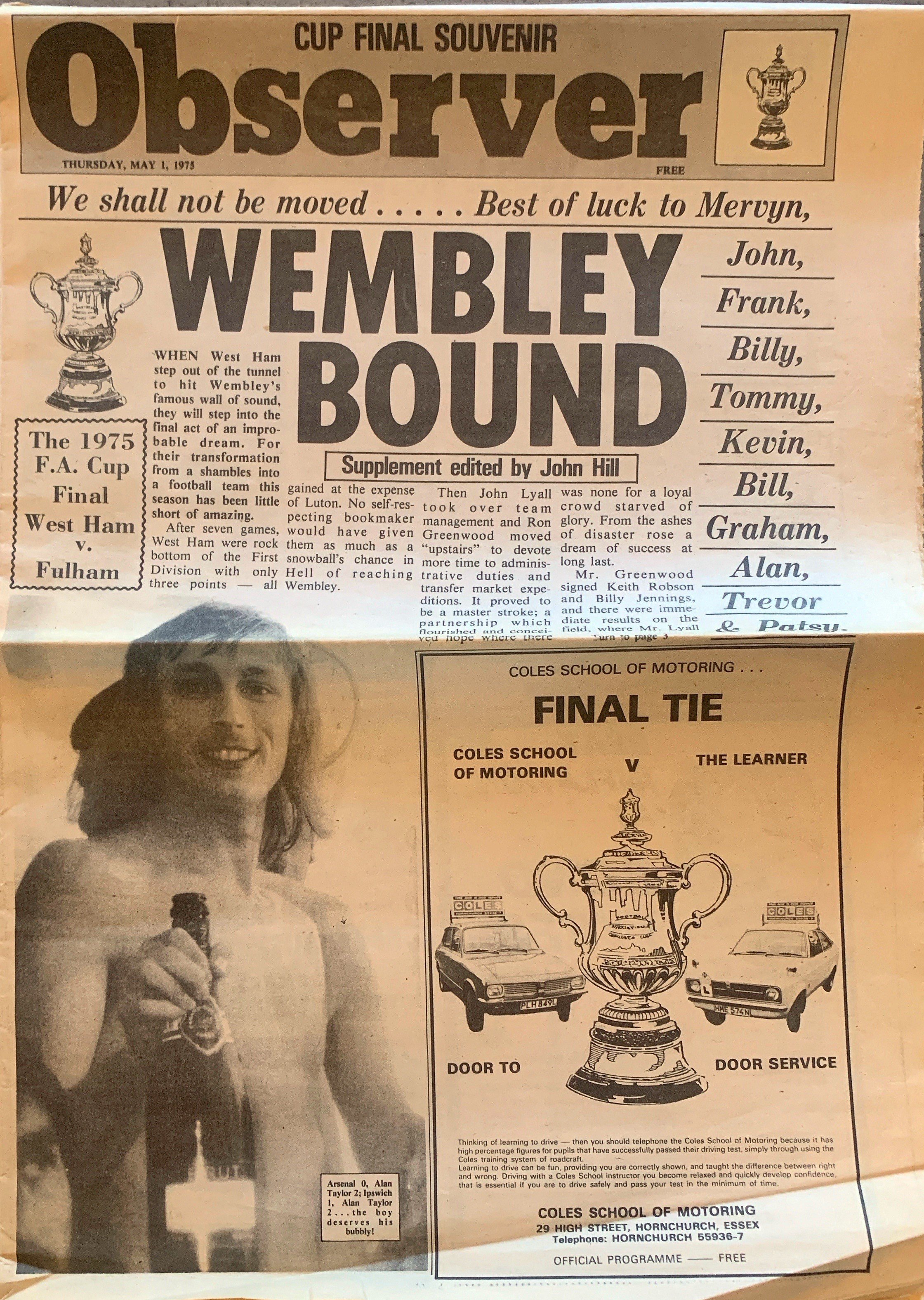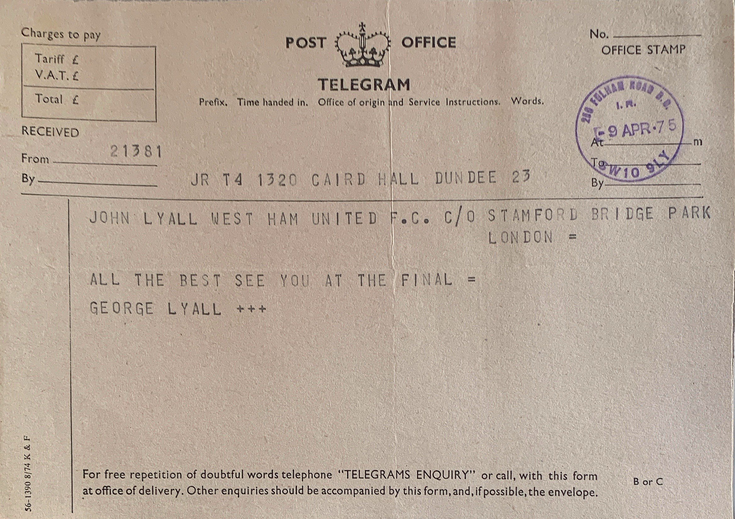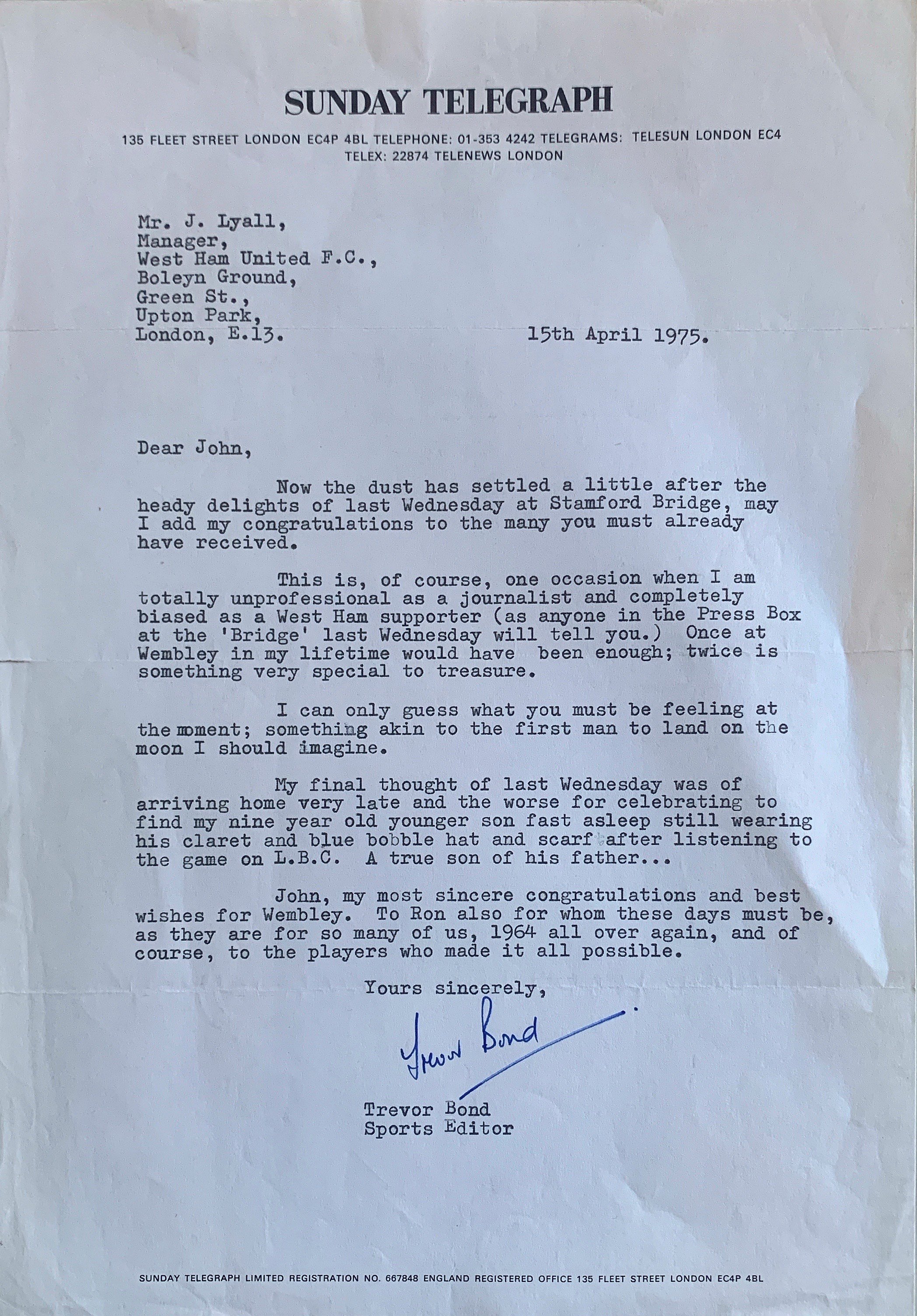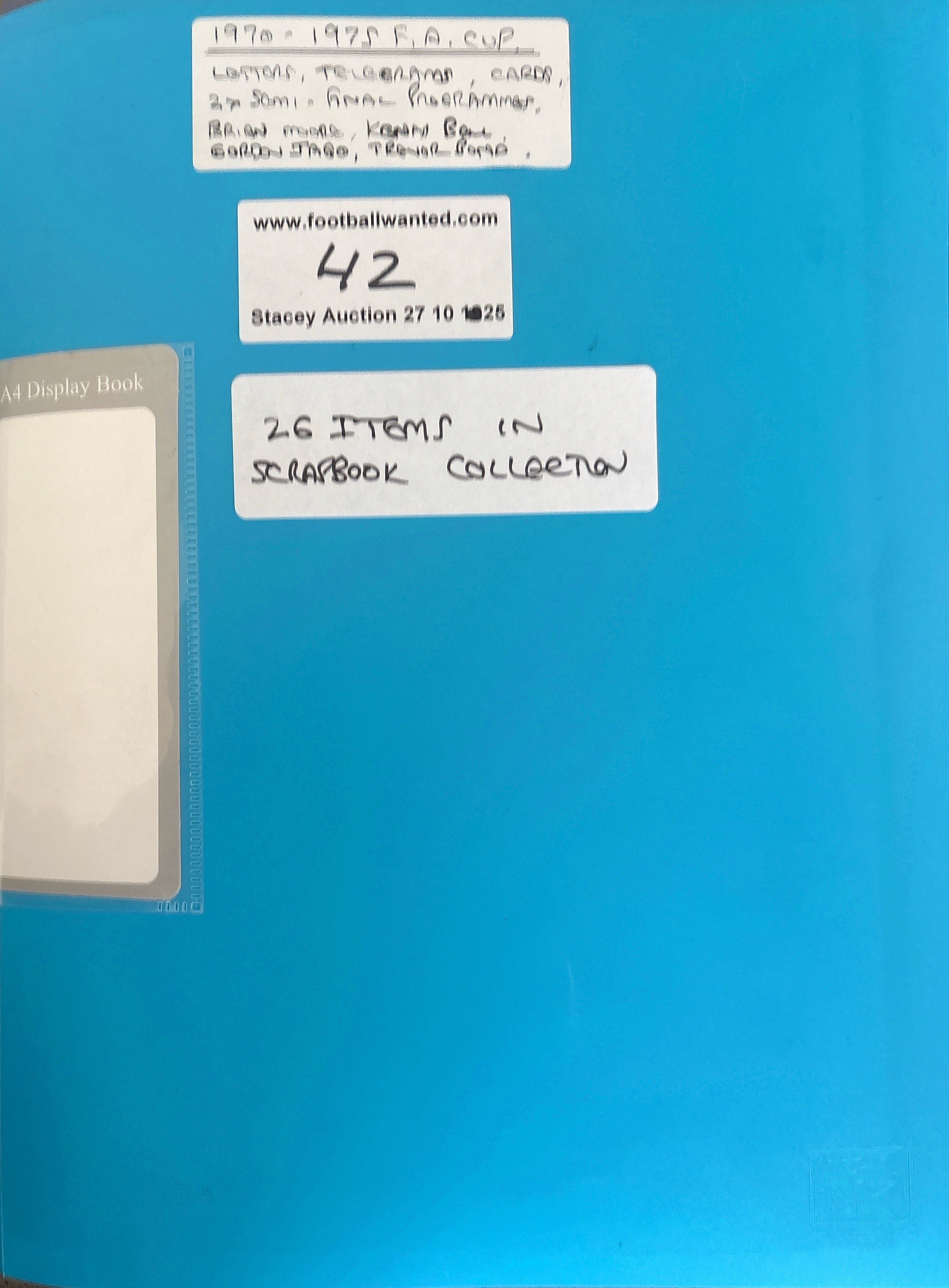 John Lyalls Family West Ham Football Scrapbook extracted into a pocket folder. Compiled by his wife Yvonne from the time Lyall was appointed Greenwoods right hand man from 1970 up to the 1975 FA Cup Final. Unsigned copies of both 1975 FA Cup Semi Finals it also includes letters, telegrams and cards from many including Brian Moore, Gordon Jago, Luton Town, Sunday Telegraph, and Kenny Ball. Also, C/W two Newspaper 1975 FA Cup Final Souvenir editions and a letter from the author Max Marquis with a cup final ticket stub attached. There are 25 individual pieces in this unique one-off collection that is a piece of West Ham history.