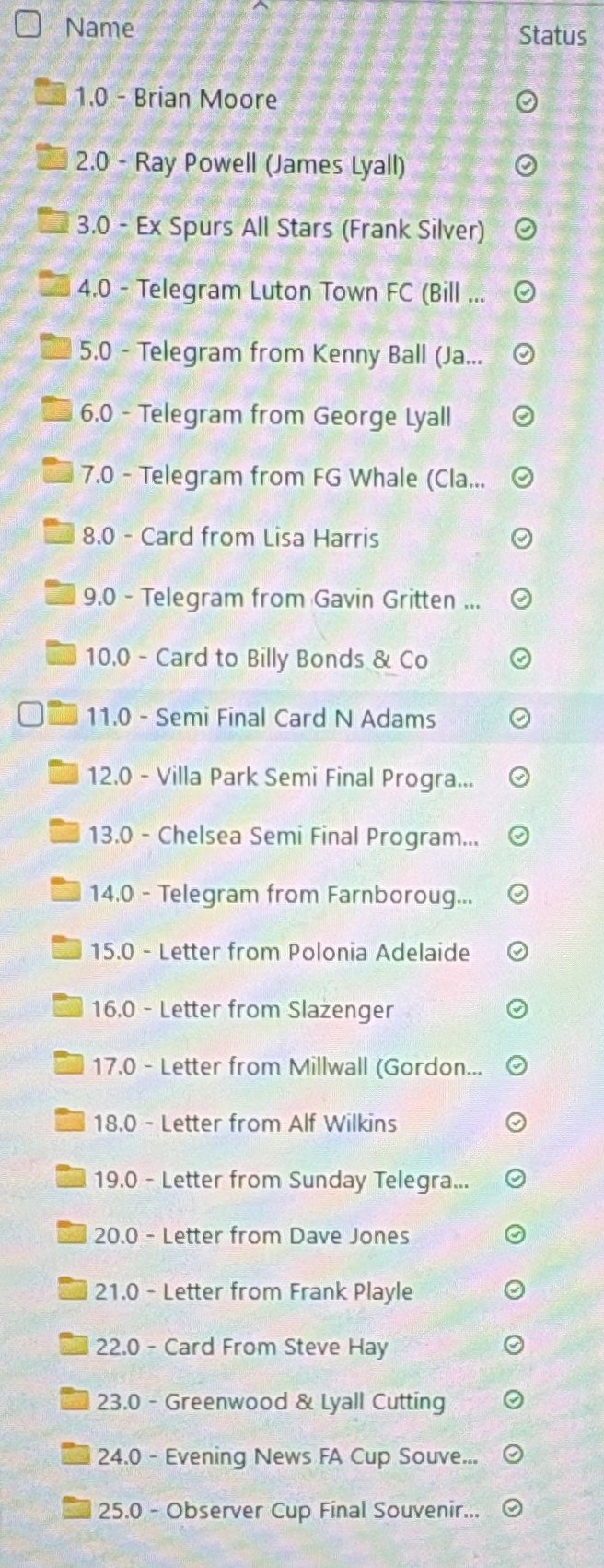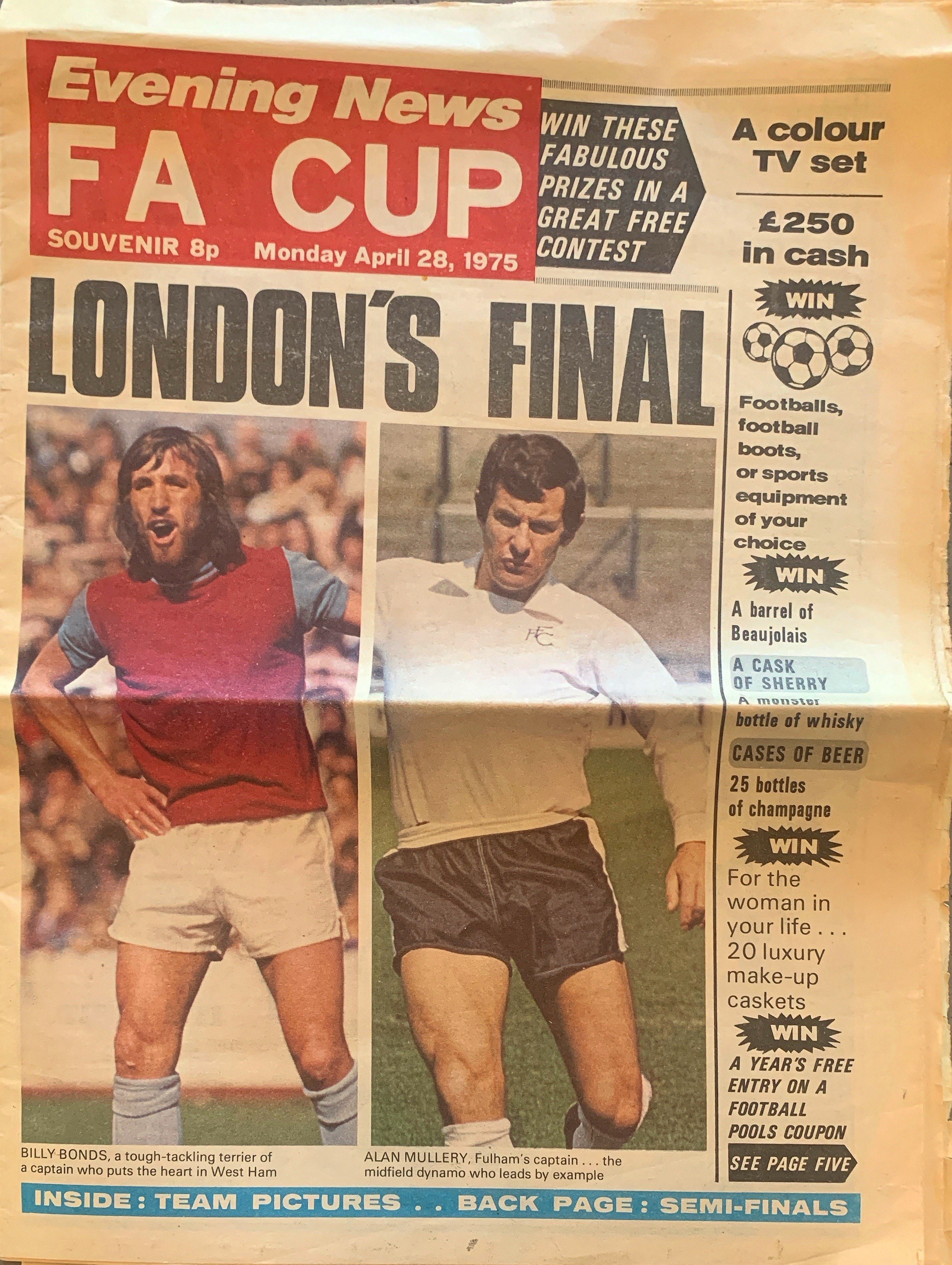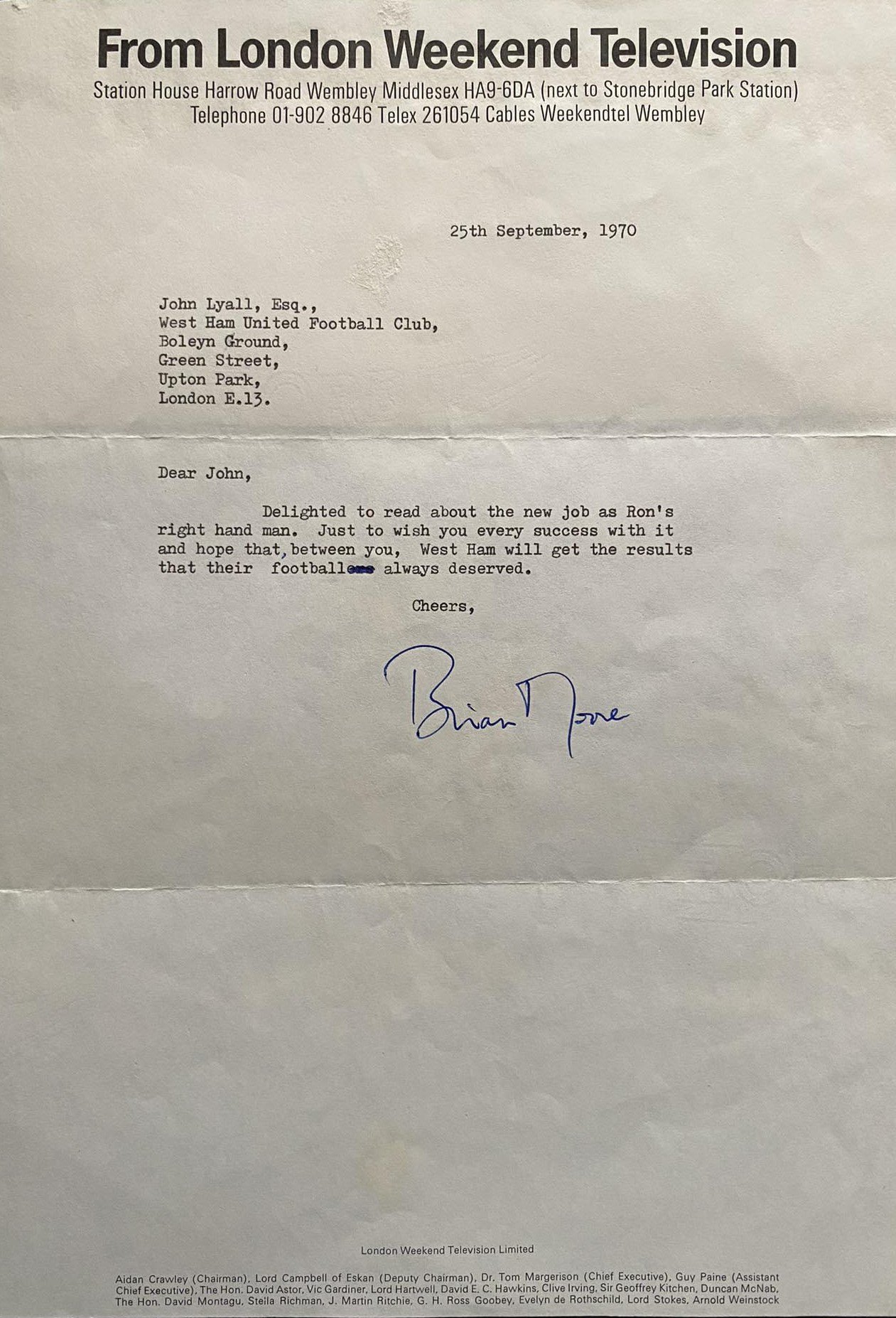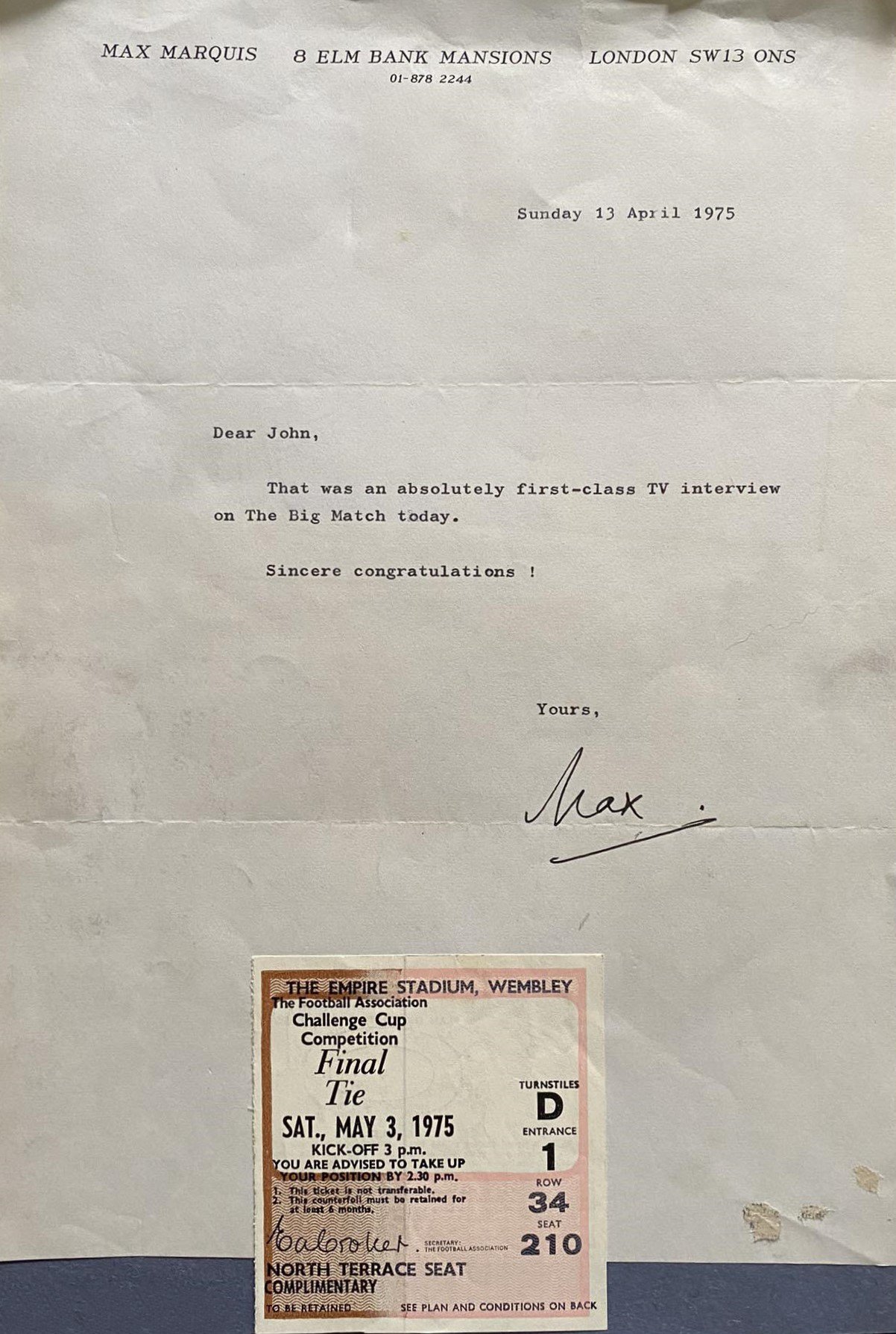 John Lyalls Family West Ham Football Scrapbook extracted into a pocket folder. Compiled by his wife Yvonne from the time Lyall was appointed Greenwoods right hand man from 1970 up to the 1975 FA Cup Final. Unsigned copies of both 1975 FA Cup Semi Finals it also includes letters, telegrams and cards from many including Brian Moore, Gordon Jago, Luton Town, Sunday Telegraph, and Kenny Ball. Also, C/W two Newspaper 1975 FA Cup Final Souvenir editions and a letter from the author Max Marquis with a cup final ticket stub attached. There are 25 individual pieces in this unique one-off collection that is a piece of West Ham history.