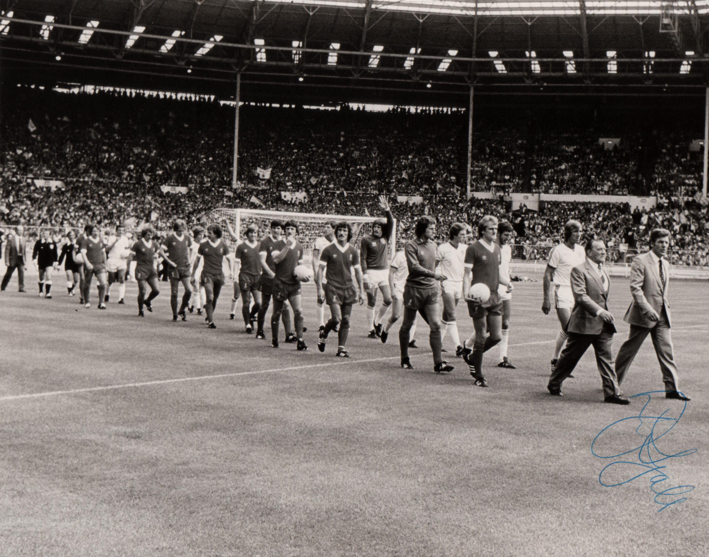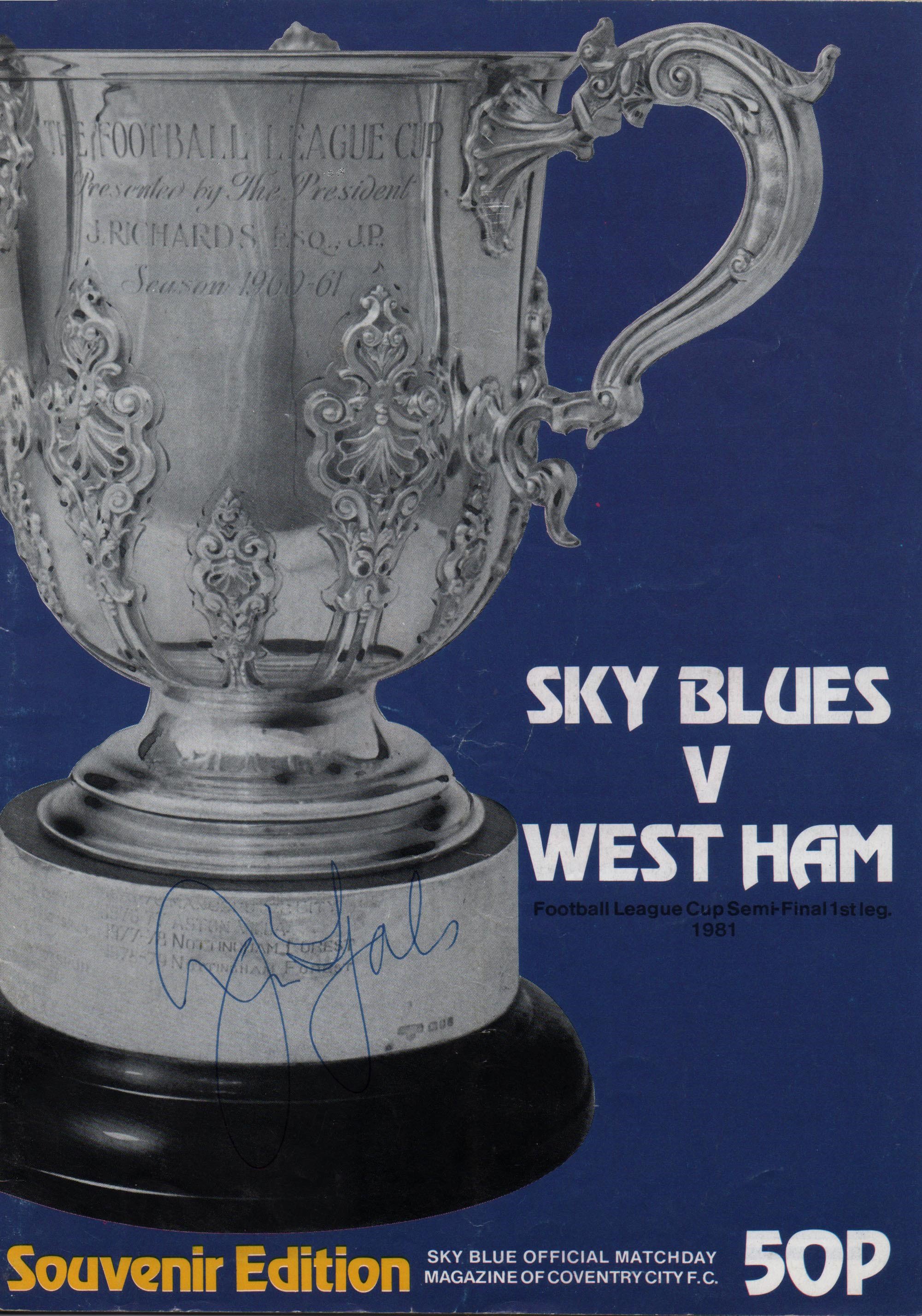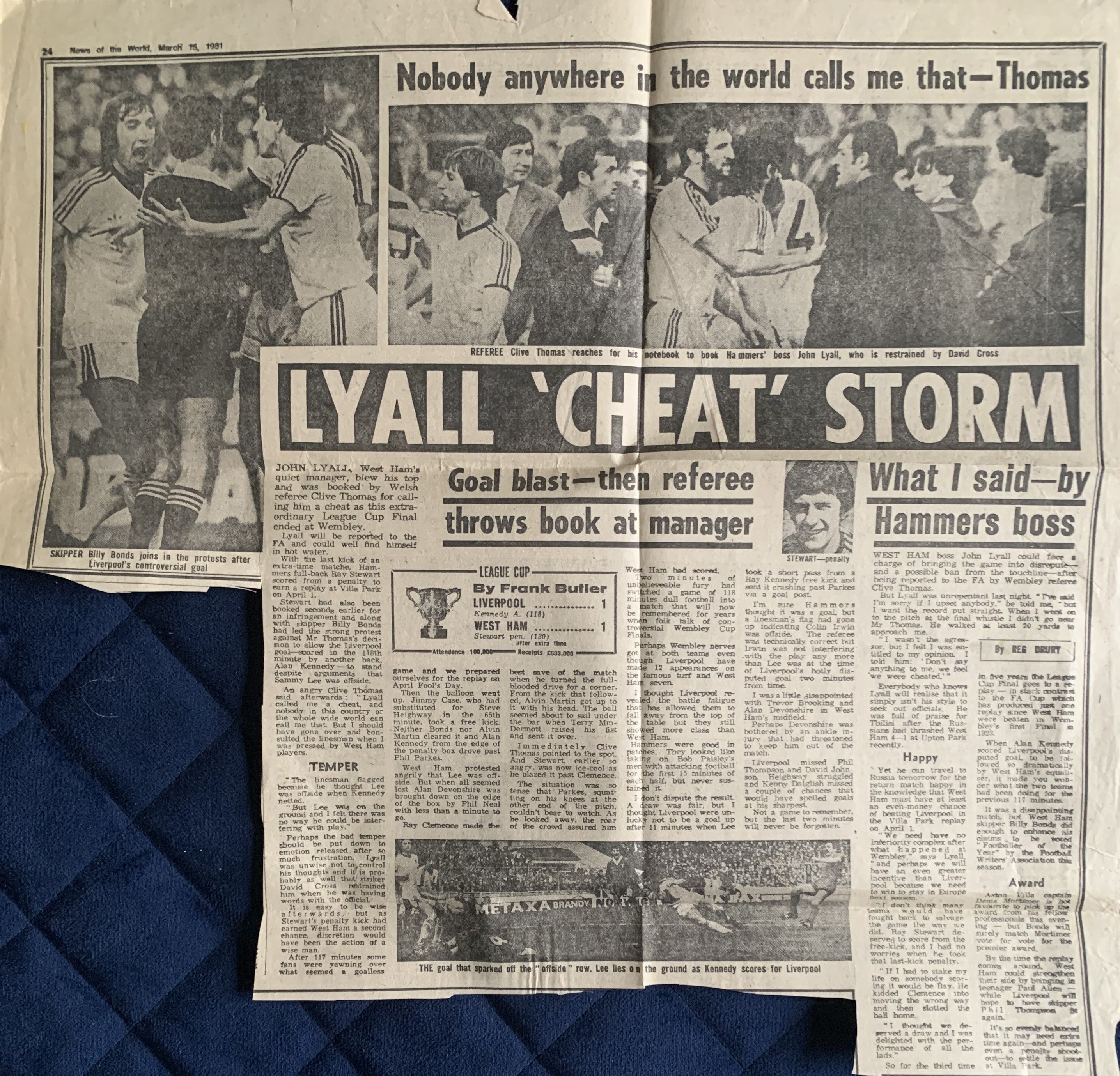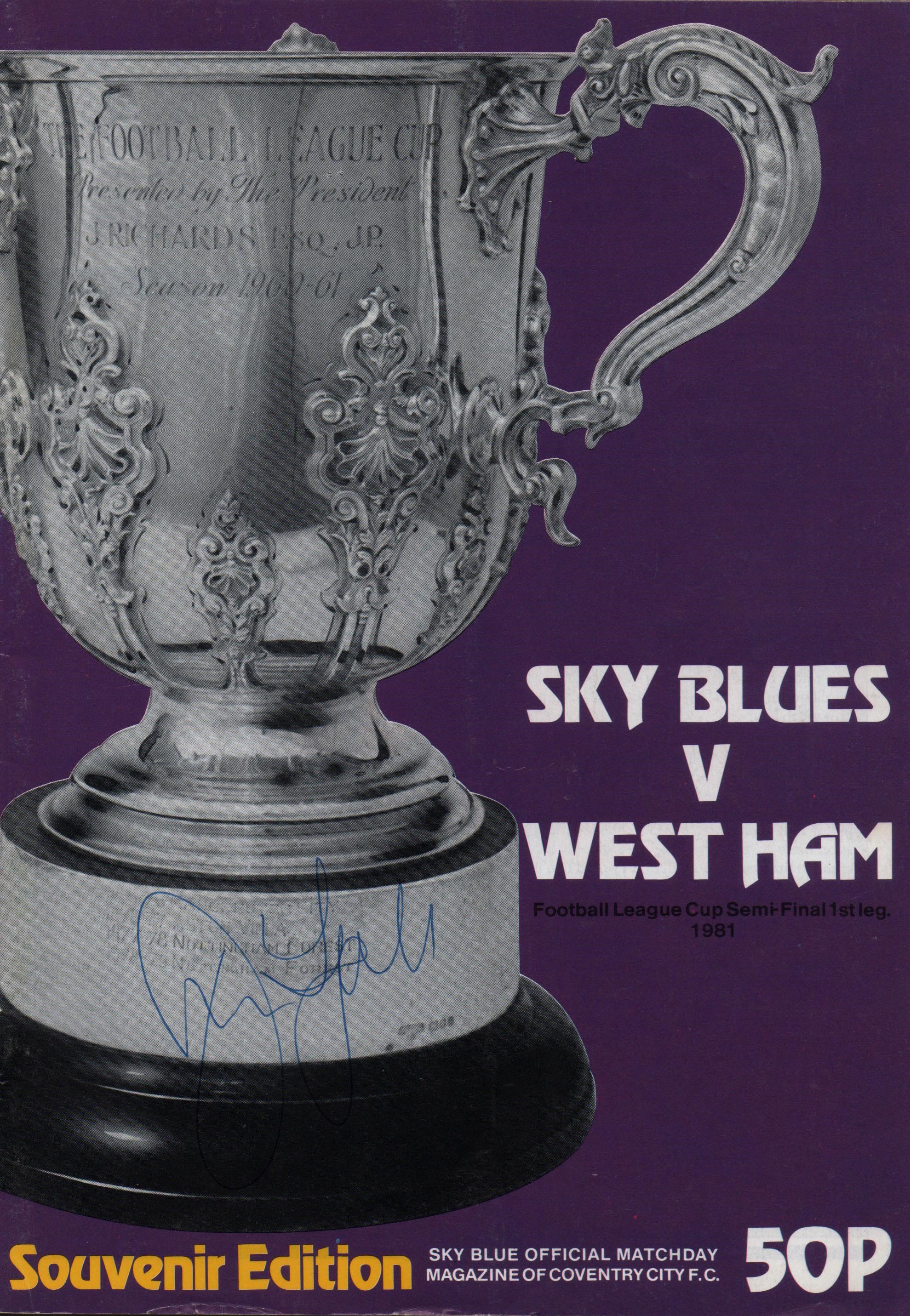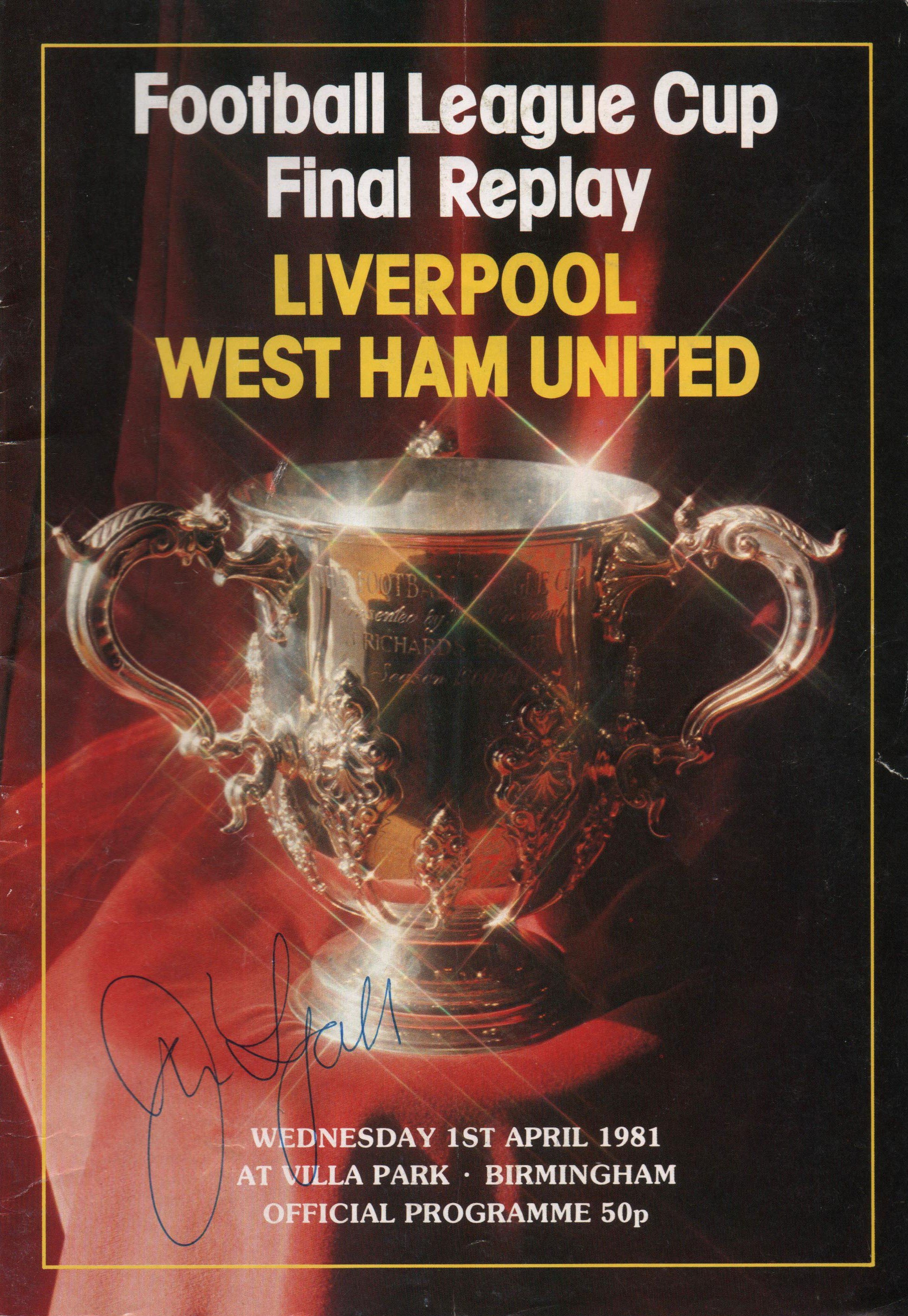 John Lyalls 1981 Rare League Cup Final Football Momentos: Semi final programme at Coventry. Both the standard blue colour and the mysterious purple version. Photo of Lyall and Liverpool manager Paisley leading the teams out signed by Lyall. Newspaper cuttings kept by his wife relating to the poor refereeing of Clive Thomas.