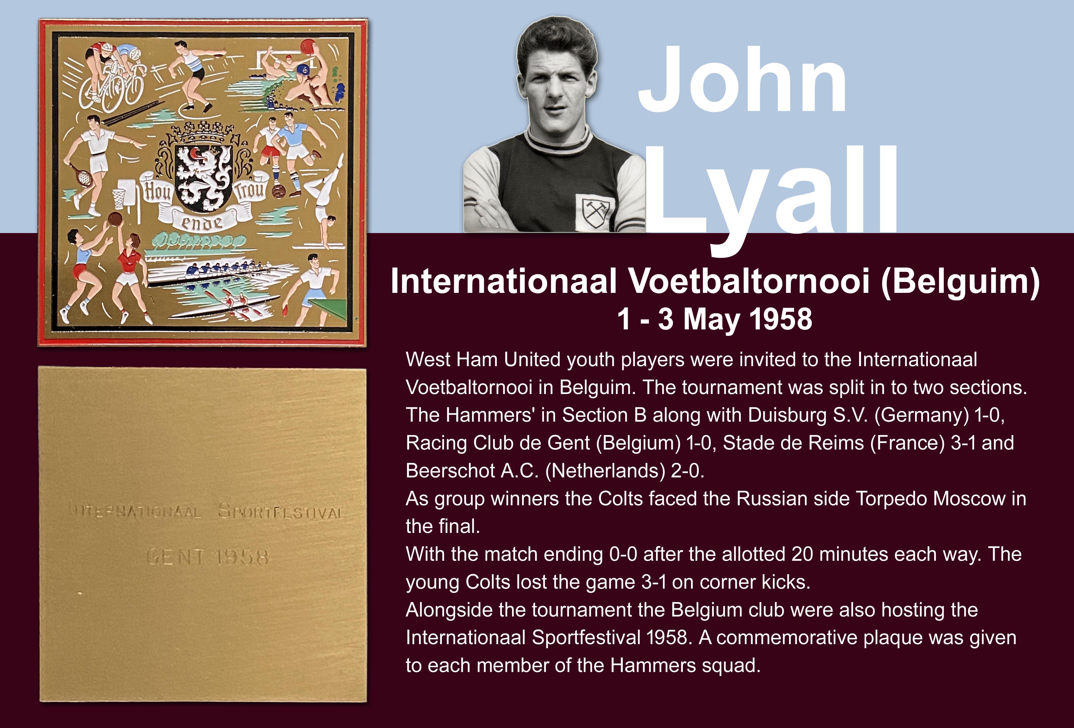 John Lyalls 1958 West Ham Youth Tournament Boxed Plaque: Front of box has the words International Sport Festival Gent 1958. Attractive plaque inside awarded to all West Ham players. They got through to the final and drew with Torpedo Moscow in the final with the game decided in the Russian teams favour based on corner kicks.
