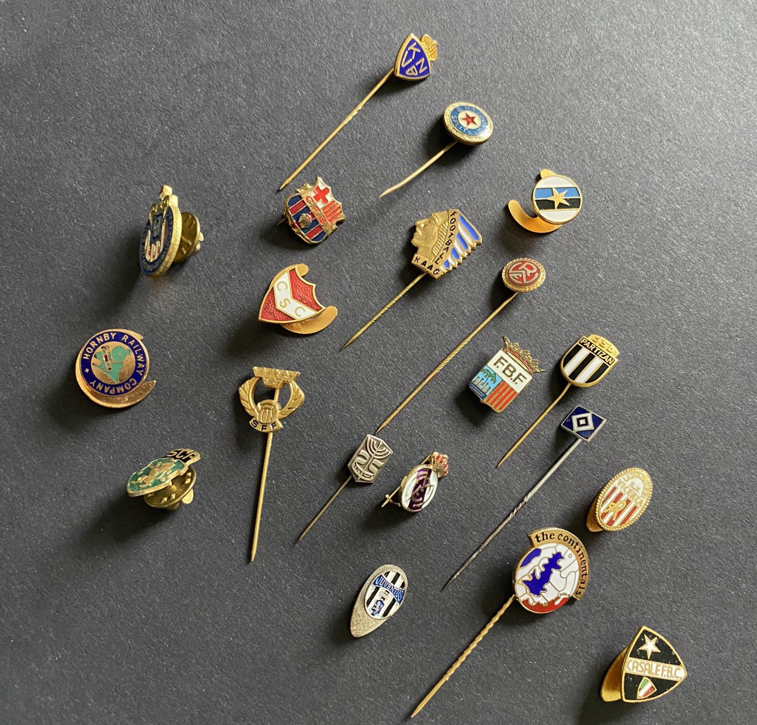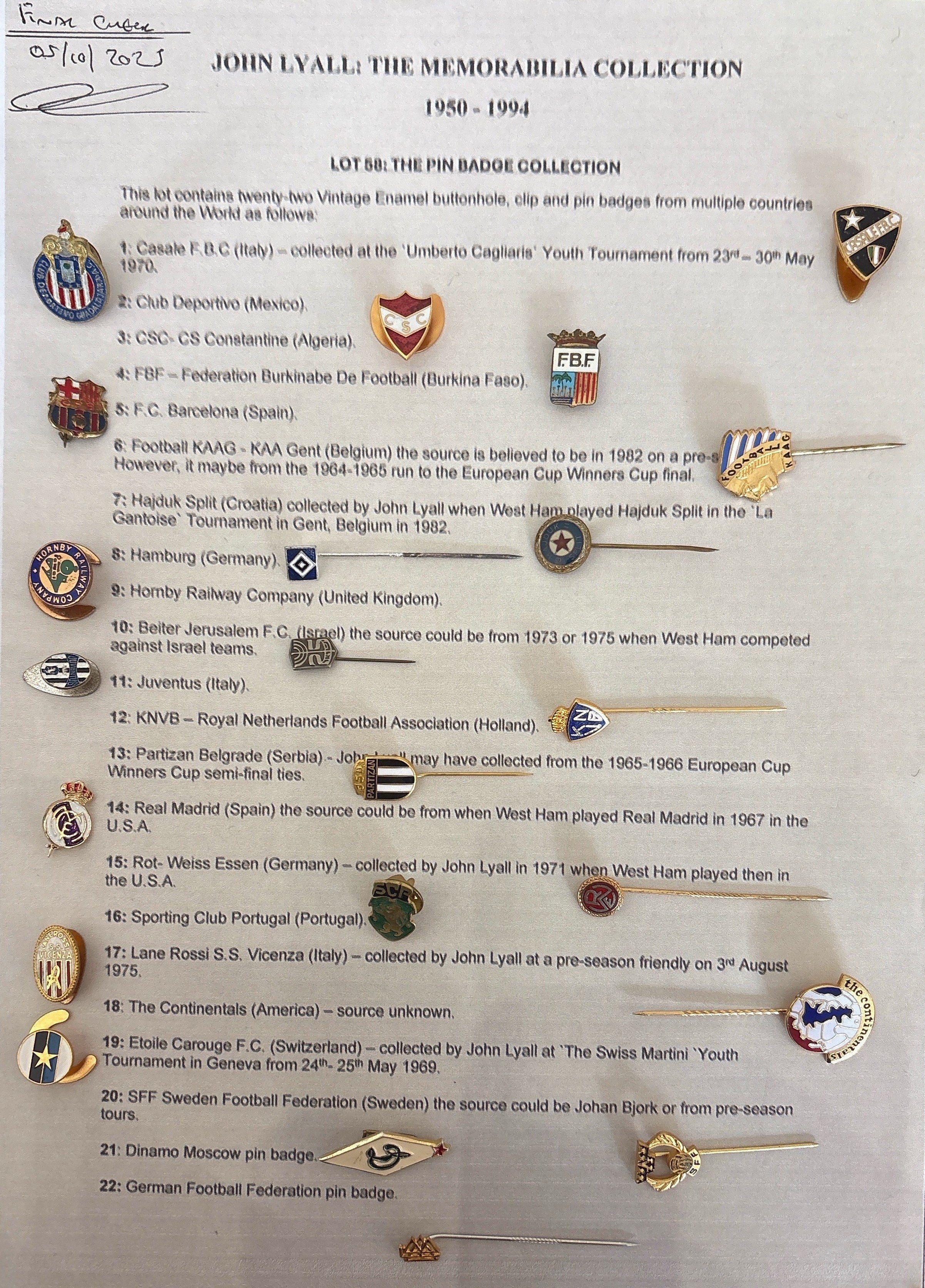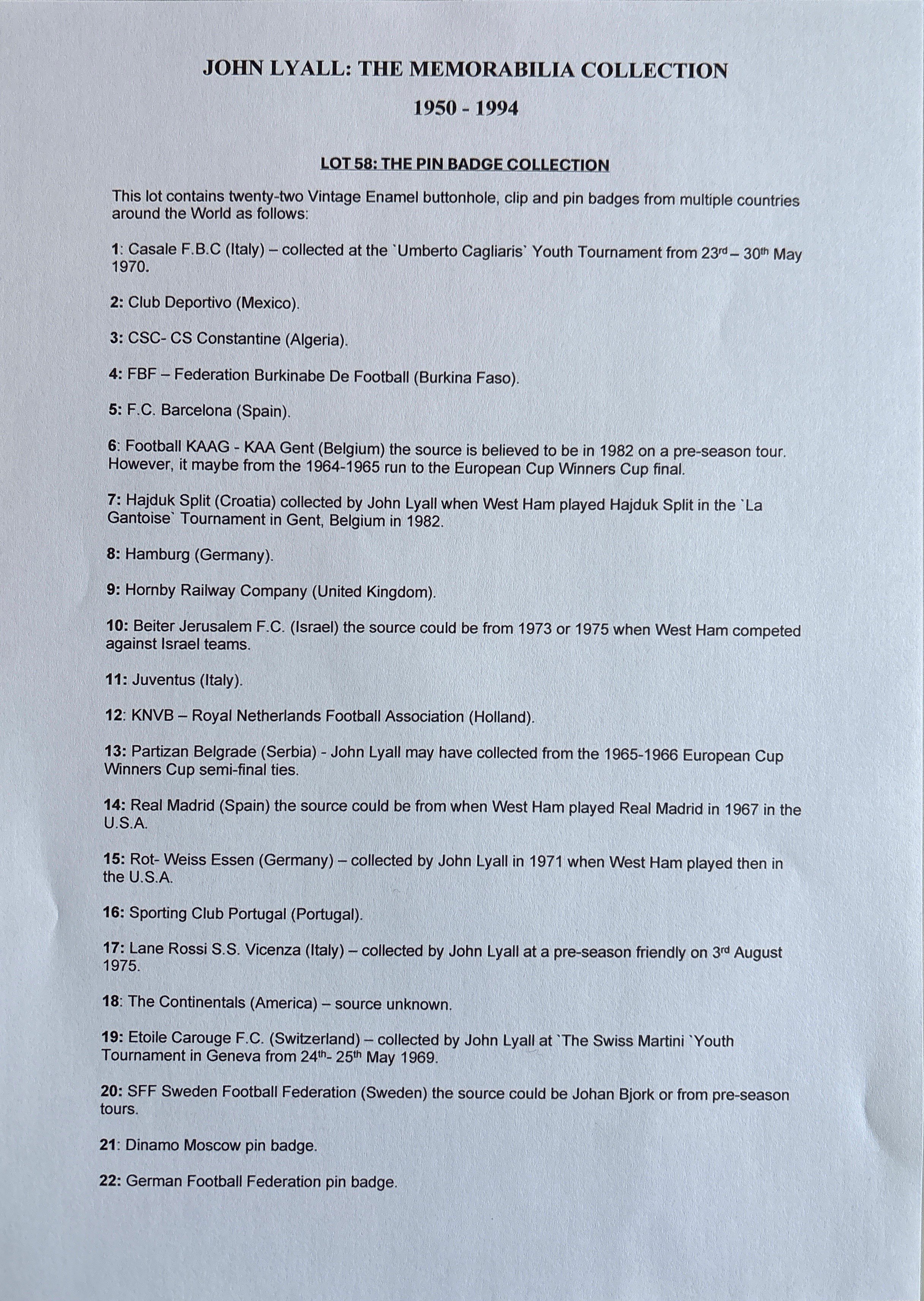 John Lyalls Football Career Pin Badges: Lyall was handed these badges by opponents mainly and include Beiter Jerusalem of Israel who they played in the mid 70s. The family have listed the badges and they have guessed in some cases where they were obtained (see online pictures). (22)