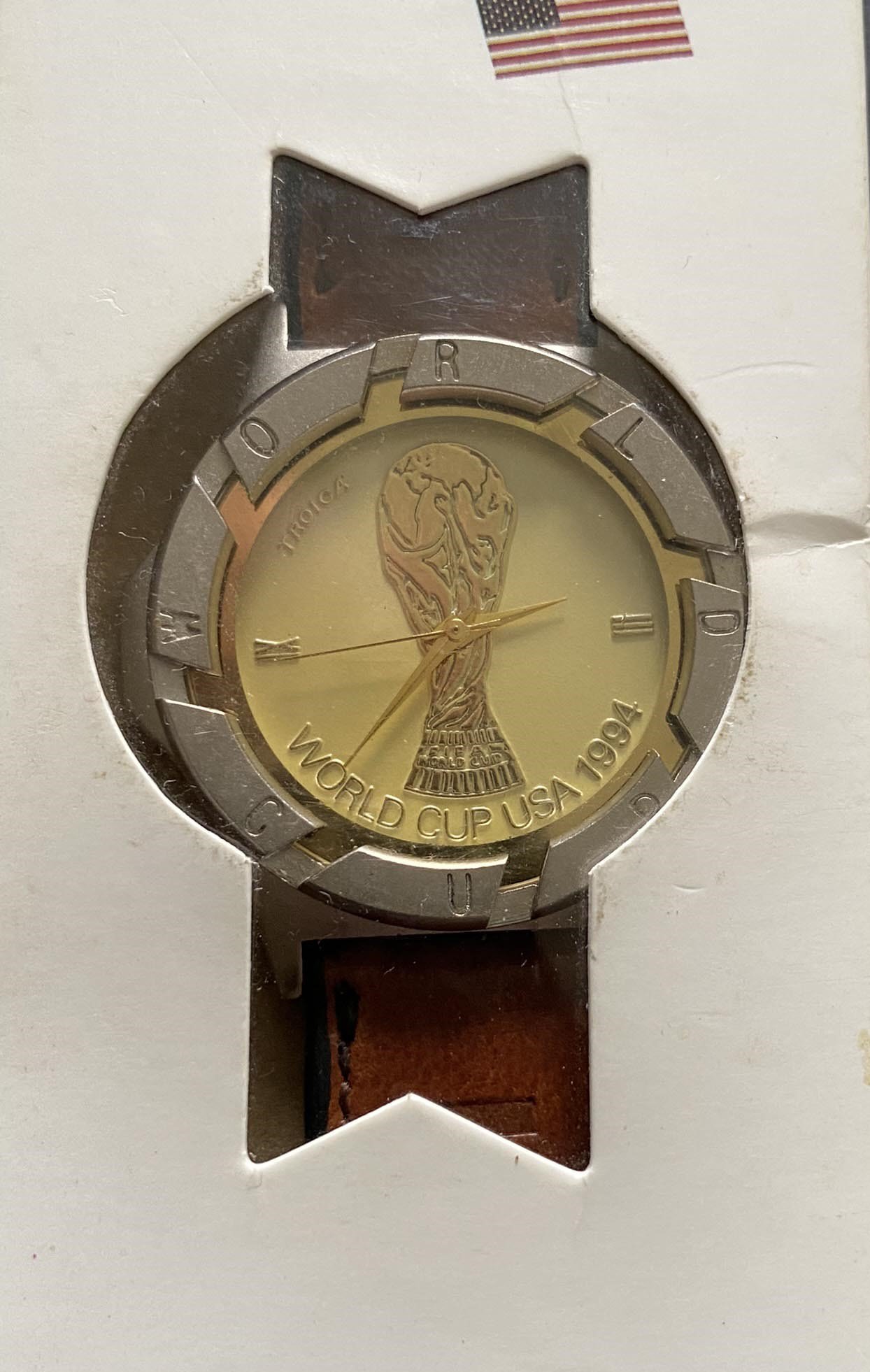 1994 World Cup Football Wrist Watch: Gifted to Lyall by Boncho Genchev of Ipswich and Bulgaria and thought to be player issued as this style does not appear to be commercially available. Stunning watch made by Troika has World Cup engraved to edge and World Cup USA 1994 with trophy to face.