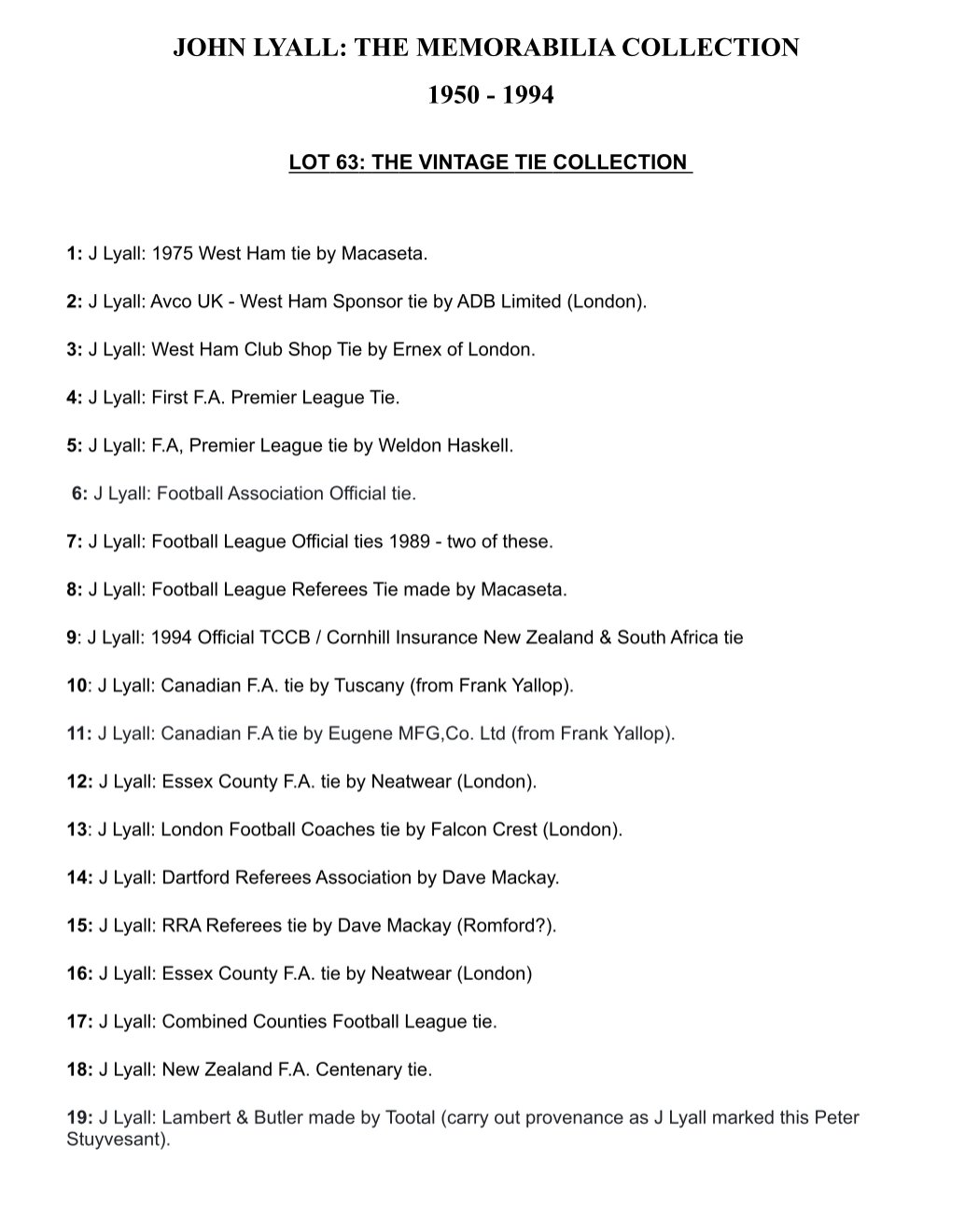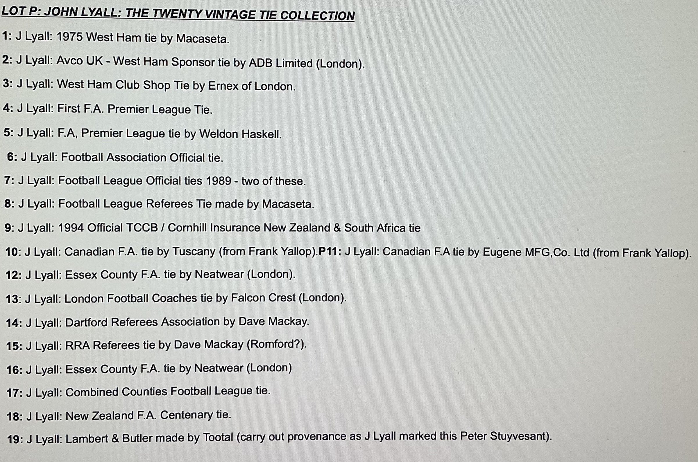 John Lyalls Football Tie Collection: Picked up in his career to include Football League Premier League Referees Associations Essex County Canadian and New Zealand FA and more. List of ties pictured online. (19)