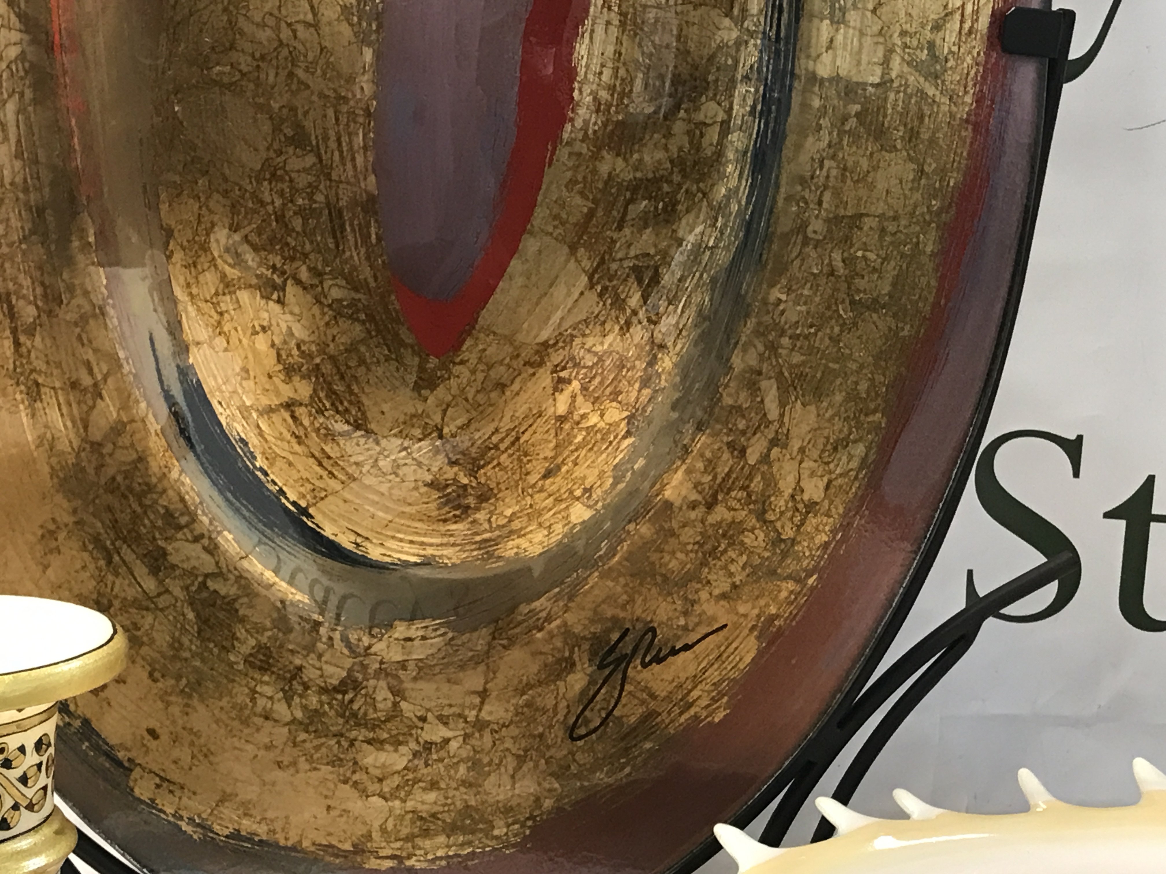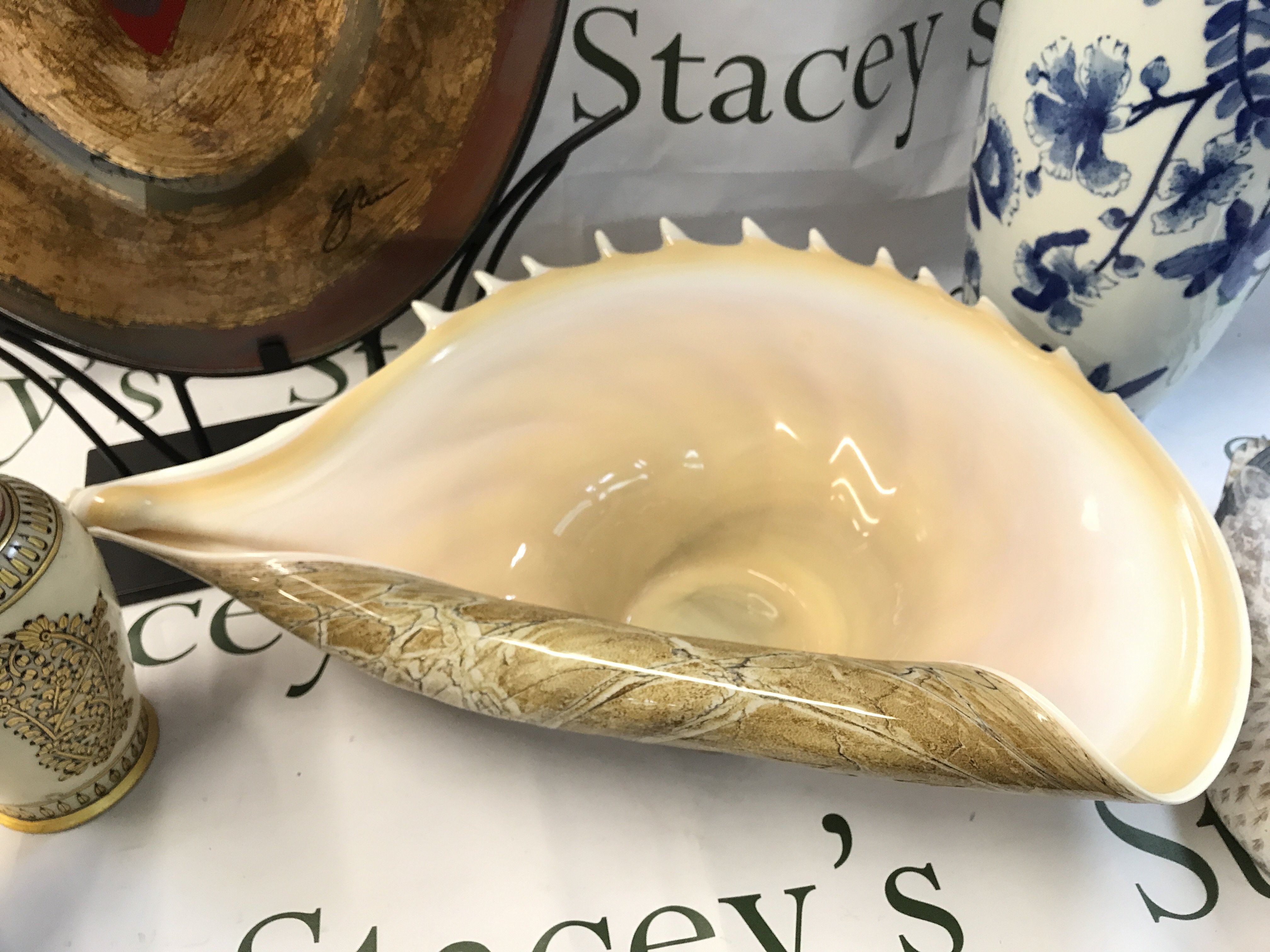 Art glass conch shell dish , signed art glass dish, pair of vases, duck figure , blue and white vase. This lot cannot be posted
