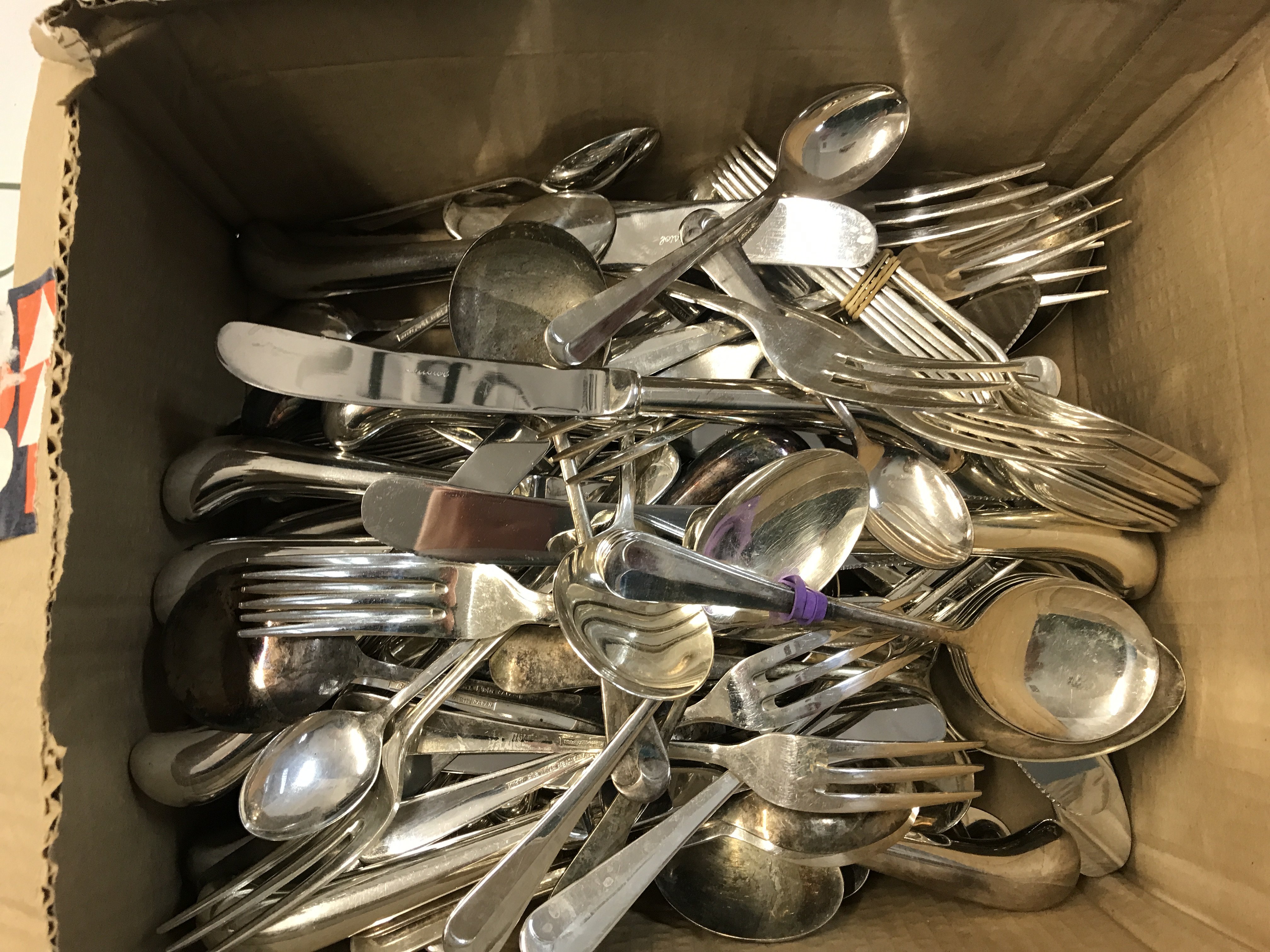 A collection of cutlery including spoons, forks, knives etc. postage category b