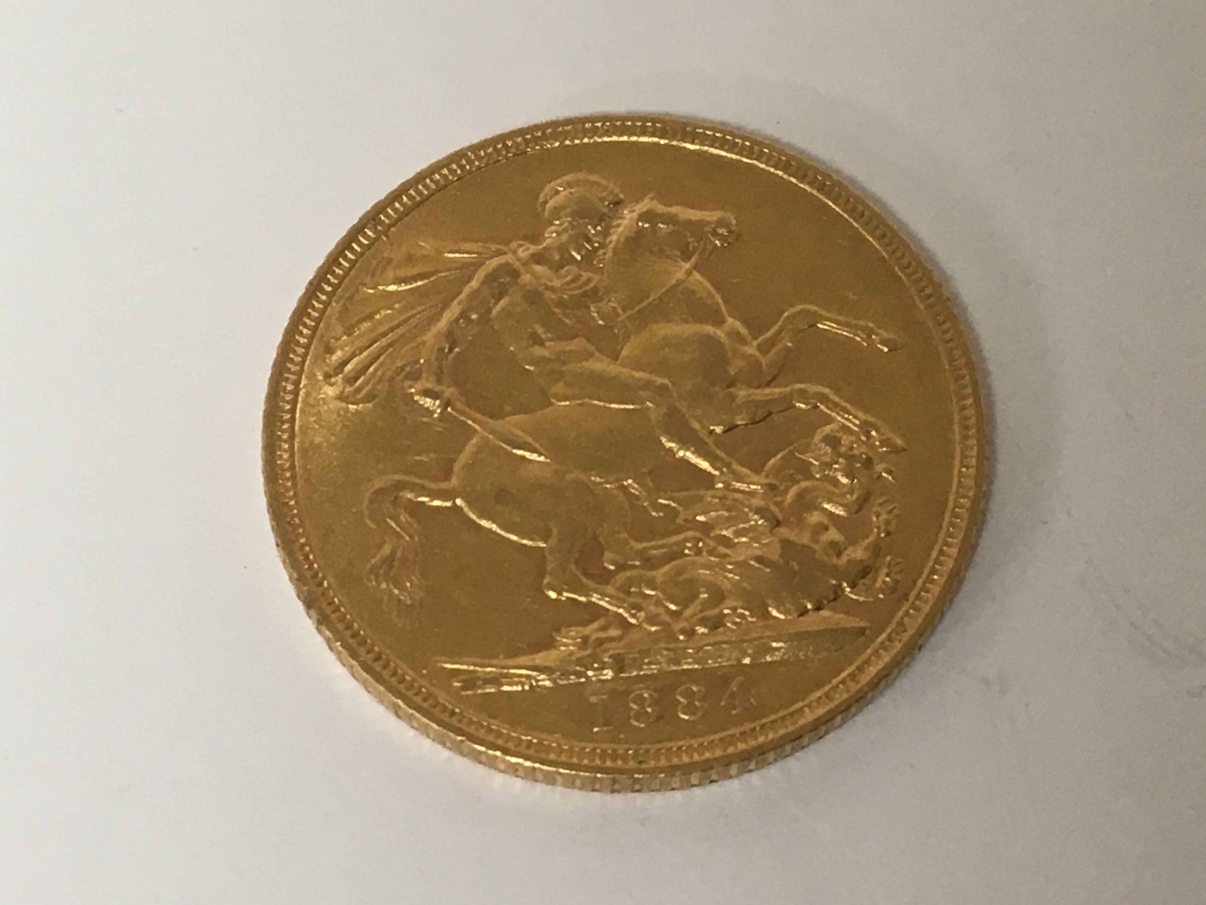 A Victorian 1884 gold sovereign with a young side profile portrait of Queen Victoria.