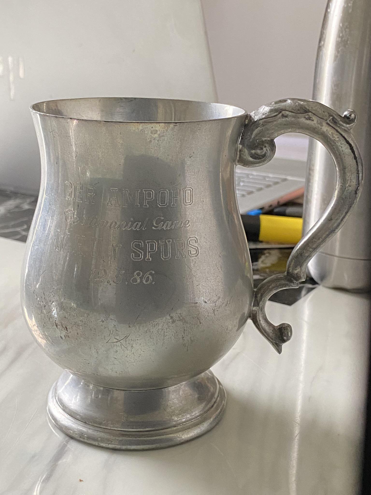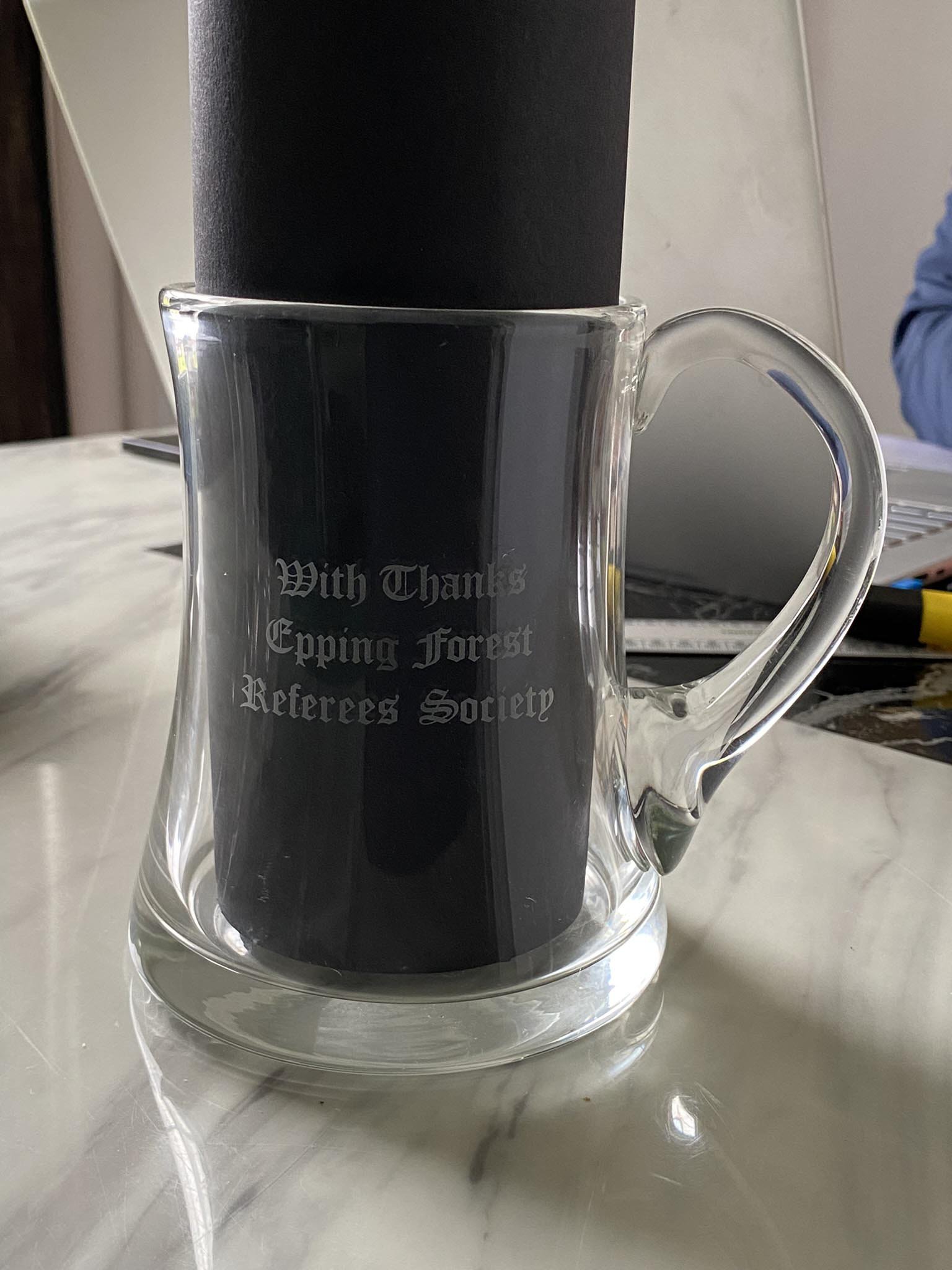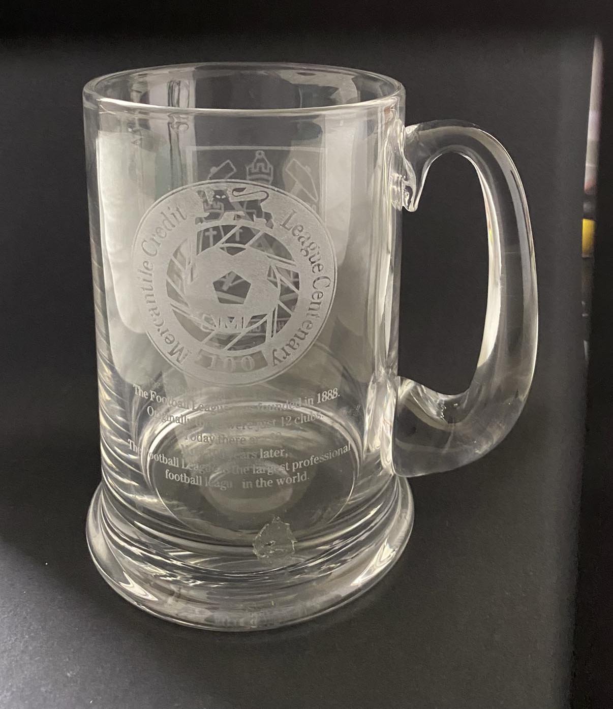 John Lyalls Football Tankards: 84/85 West Ham v Tottenham (Ampofo test) tankard plus glass tankards for 1988 Mercantile Credit and Epping Forest Referees Society where he gave a talk.