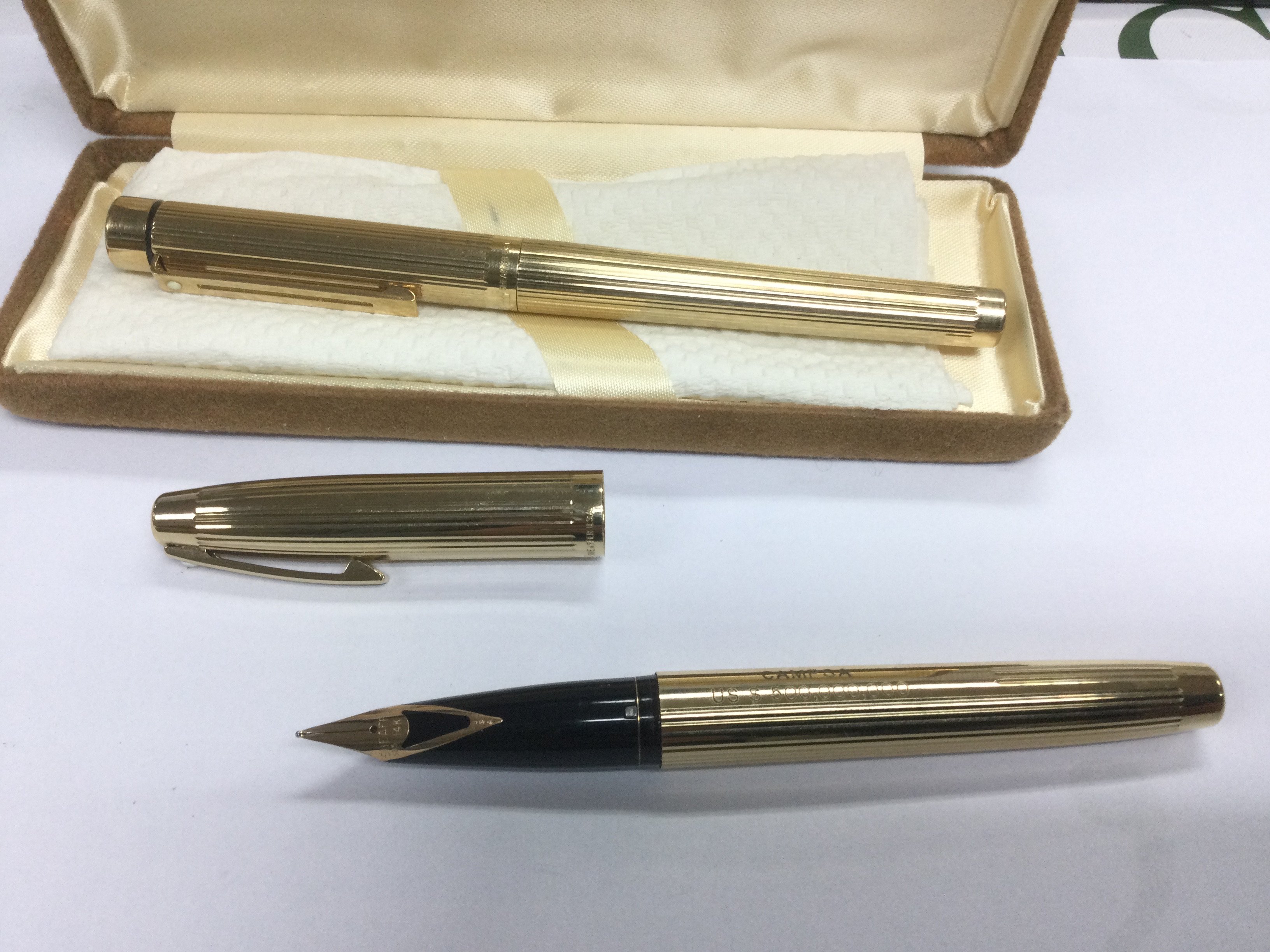 A collection of pens comprising two 14k gold nib Sheaffer fountain pens plus some Cross and Parker examples. Shipping category B.