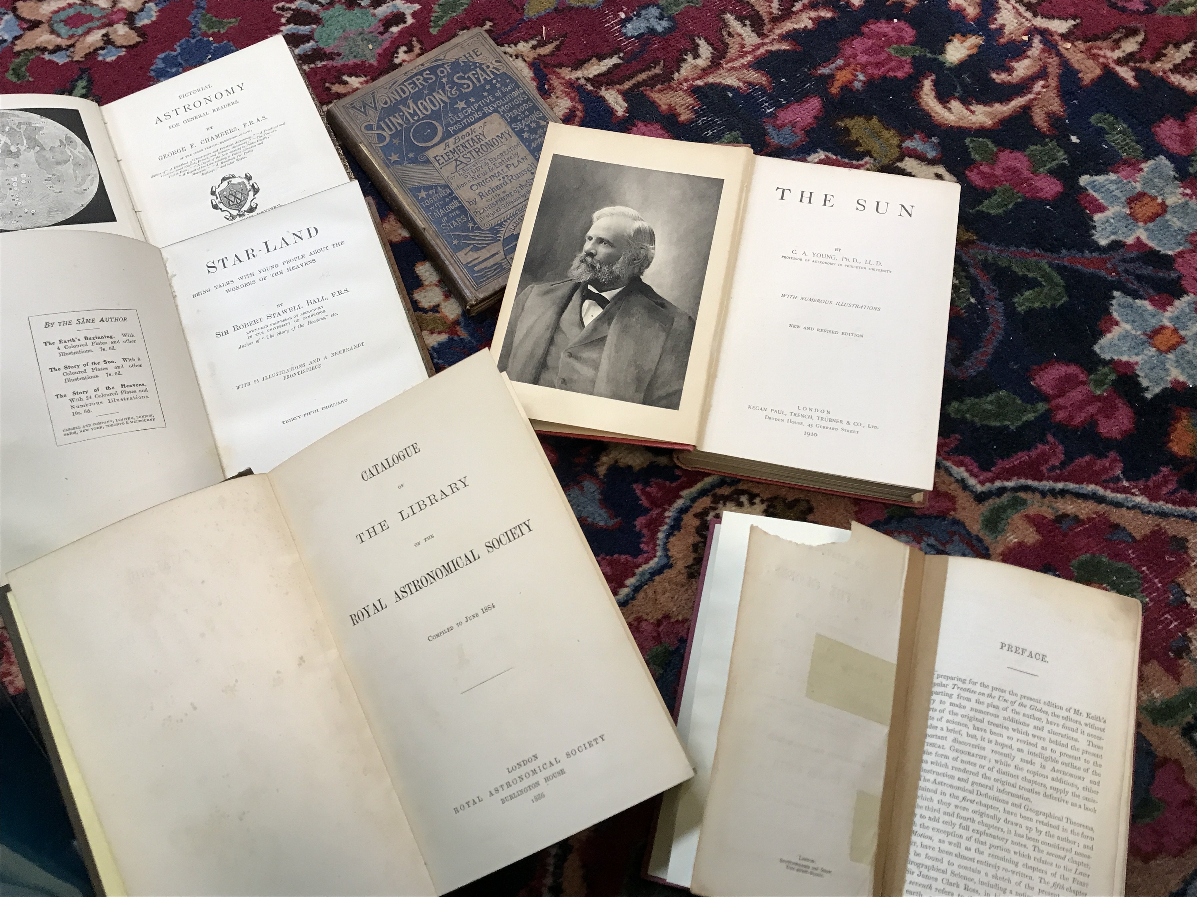 A Collection of vintage leather bound astronomy books including Pictorial Astronomy by George F. Chambers 1893, Star Land by Robert Stawell Ball, The Earths Beginning by Robert S. Ball, Tutor to Astronomy & Geography by Joseph Moxon circa 1671, Popular lectures on Astronomy by Rev L Tomlinson, New treatise of the se of the globes by Thomas Keith, Wonders of the sun moon and stars by Richard Russell, Popular Science volume seven and other books. Postage category C