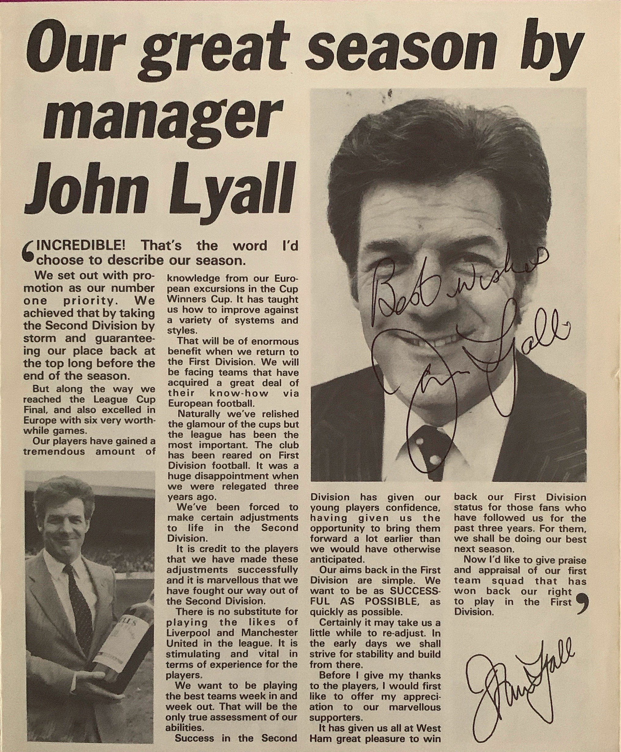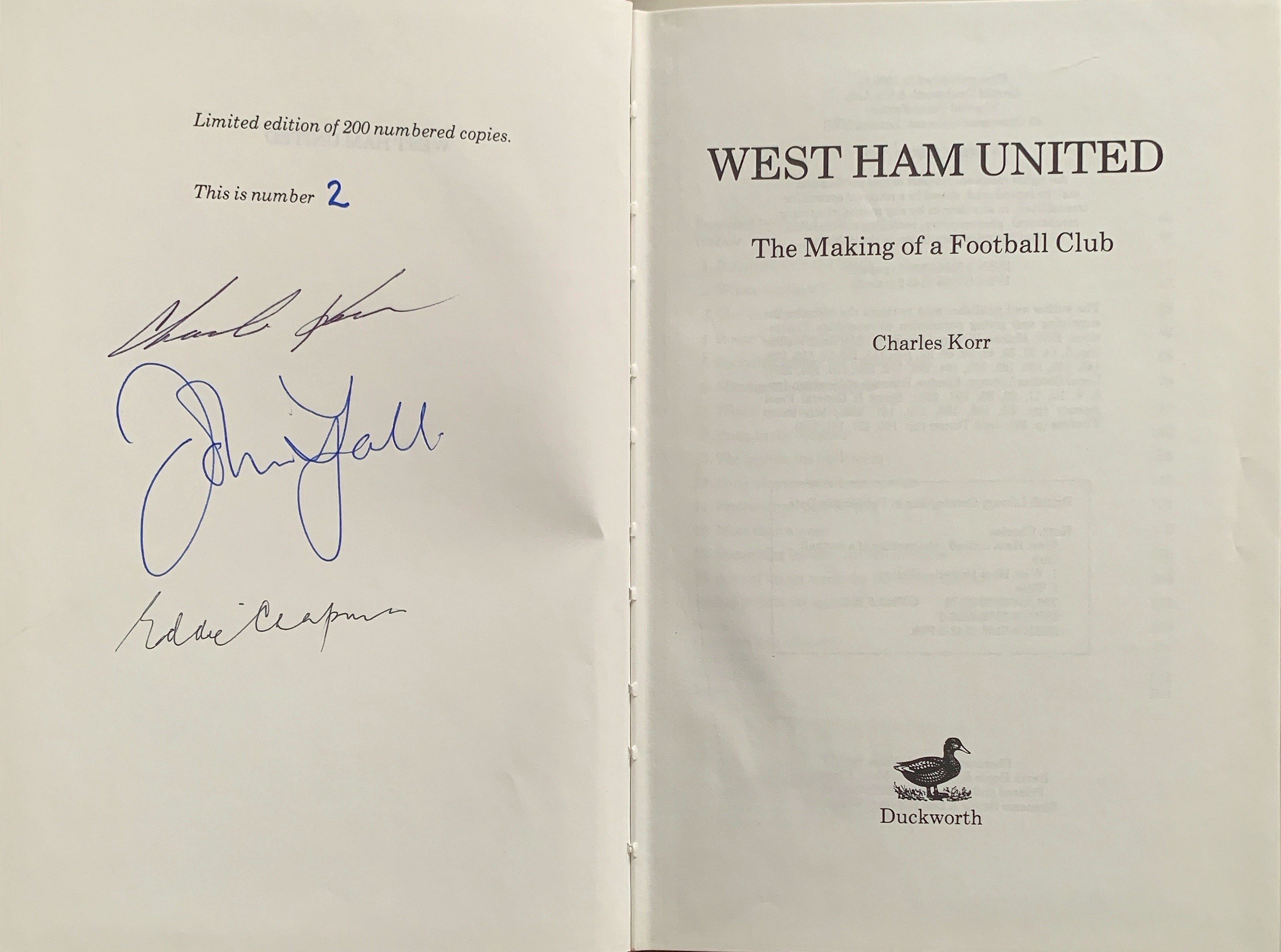 John Lyalls Signed West Ham Book Collection: 6 annuals and yearbooks from the early 80s all signed by Lyall. C/W Champions Back To Division One also signed and some others either signed by author or where Lyall has written the foreword. Charles Korr book is number 2/200 and is signed by the author Lyall and Eddie Chapman. (14)