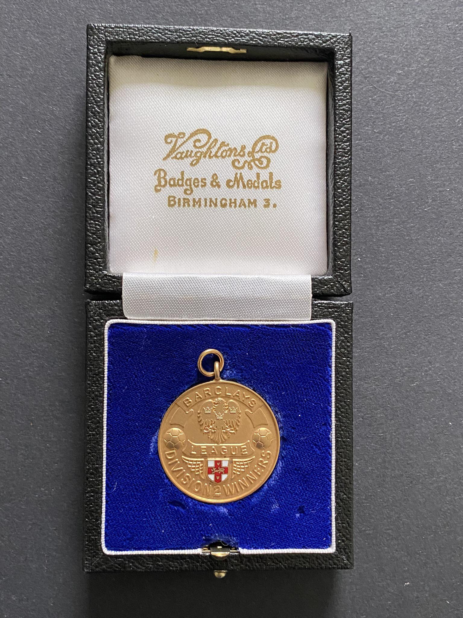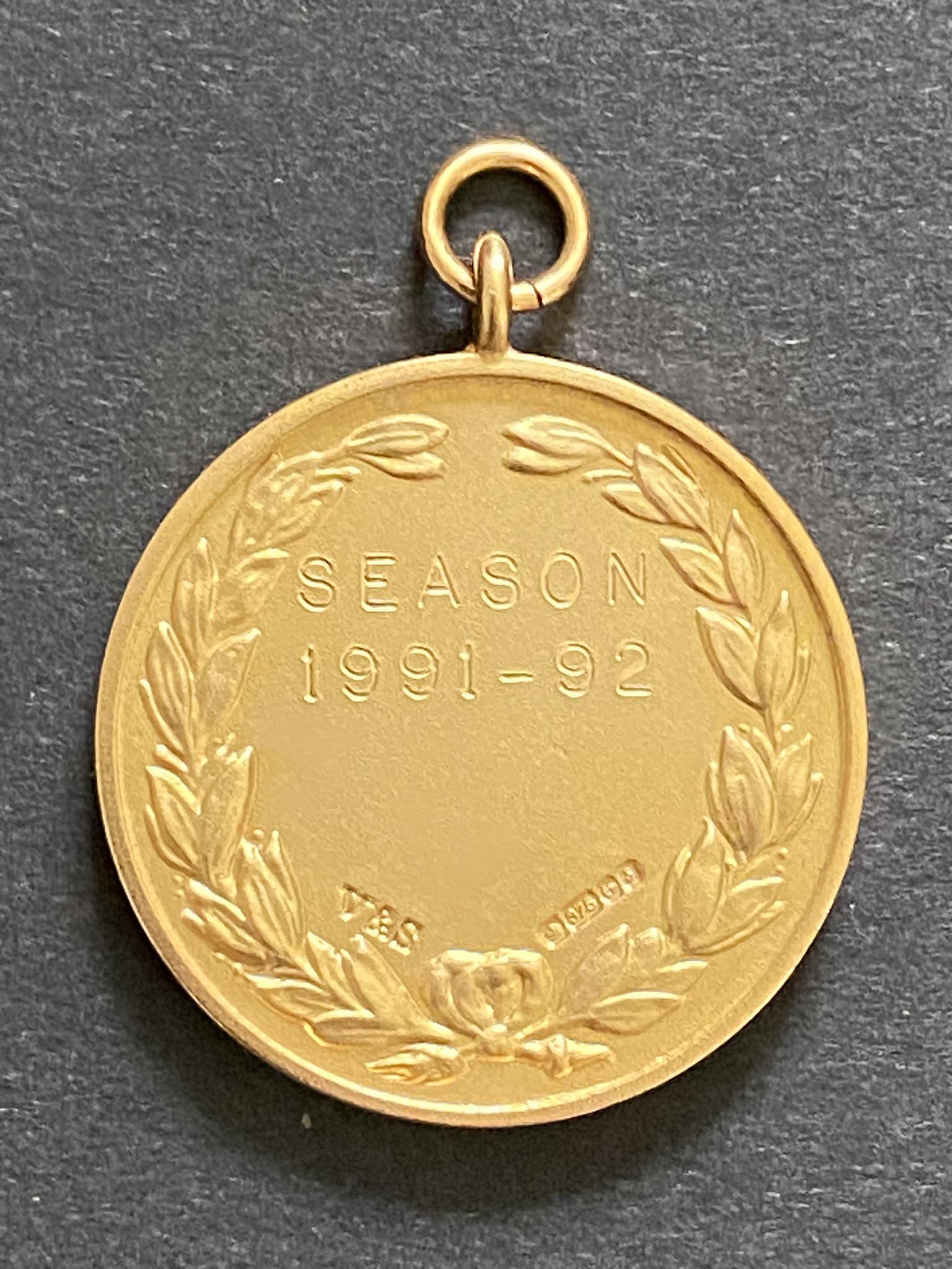 John Lyalls Ipswich Town 91/92 League Division Two Winners Medal: 9ct gold Vaughtons + Sons medal in original box awarded to manager John Lyall. Front reads Barclays League Division Two Winners the reverse stating Season 1991-92. Last ever season of the Football League after 93 seasons where these lovely gold medals were awarded. Ipswich were to start the season in the first season of the Premier League. This is the same medal as the players received. COA from family.