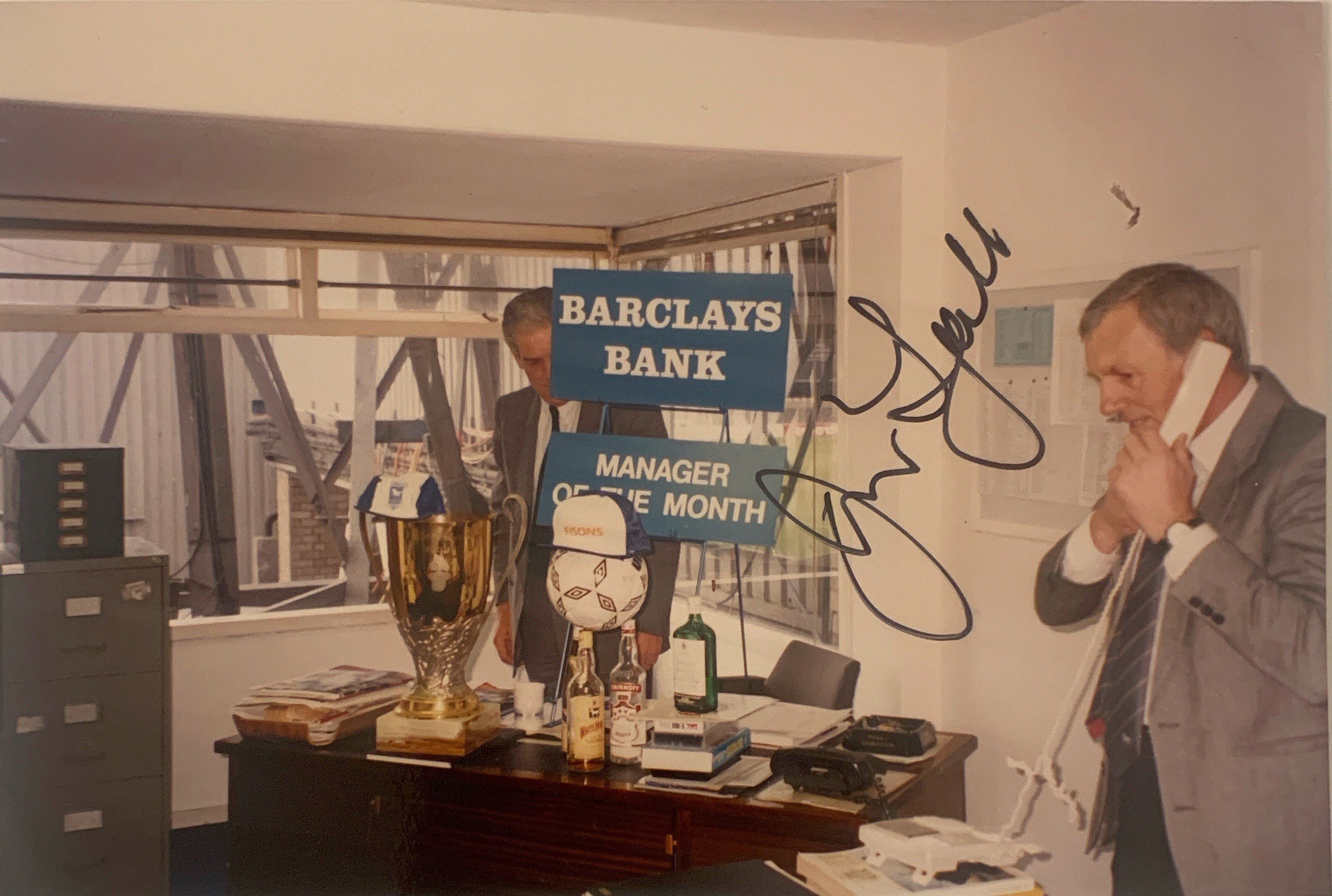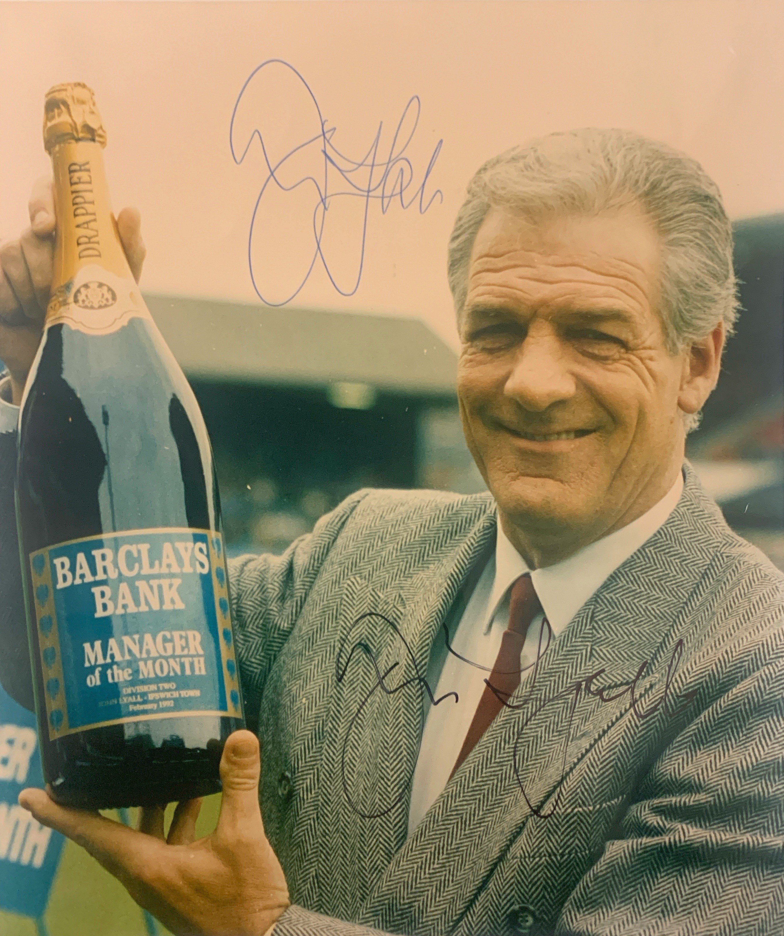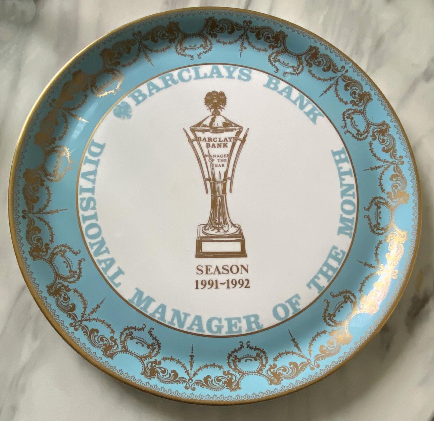 John Lyall Ipswich Town 91/92 Manager Of The Month Award: Aynesley China plate which states Barclays Bank Divisional Manager Of The Month. This was awarded for February 1992 in the season that Ipswich won league division 2. Photo included of Lyall with champagne and another in his office both signed by him. (Champagne not present)