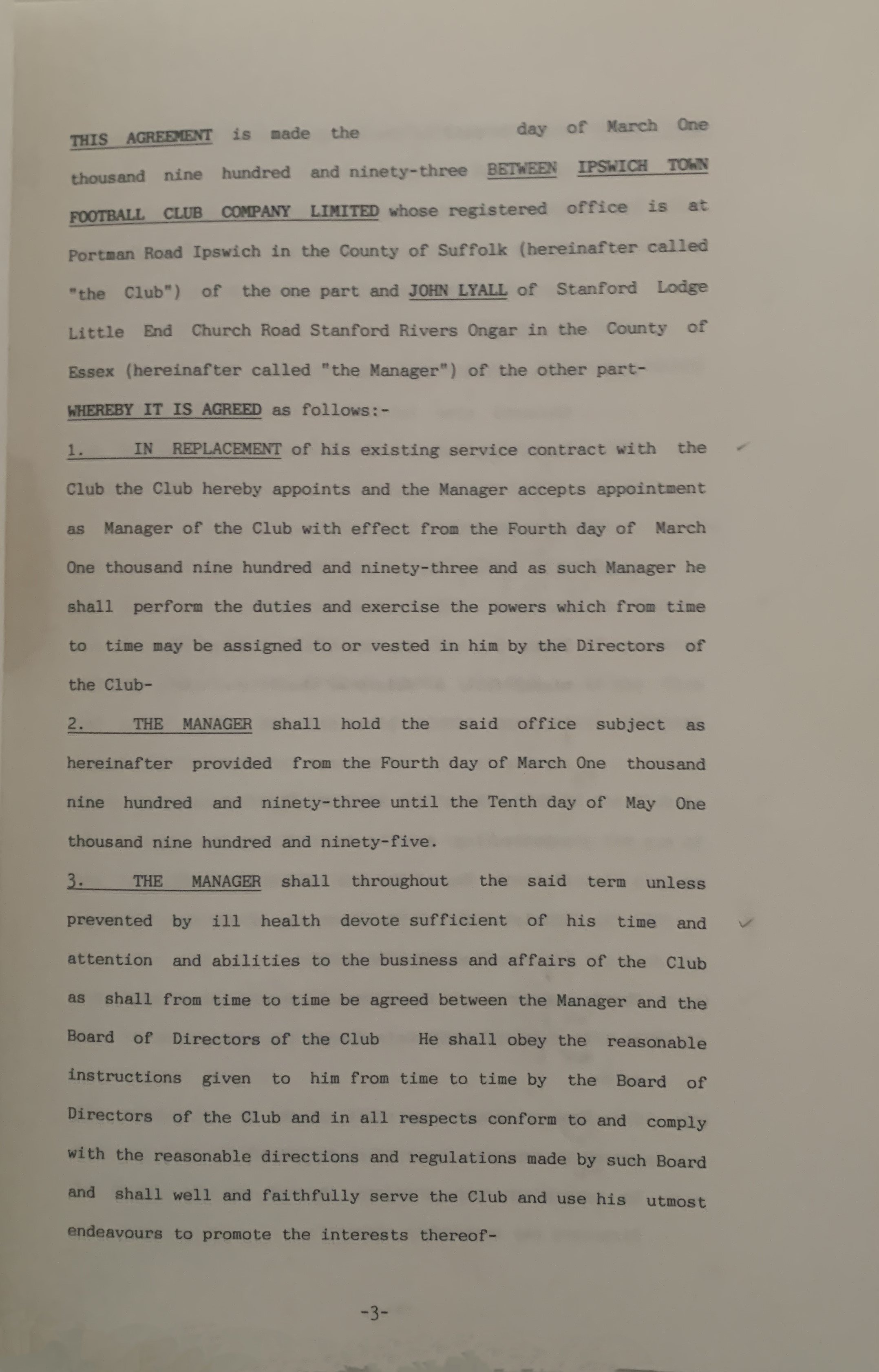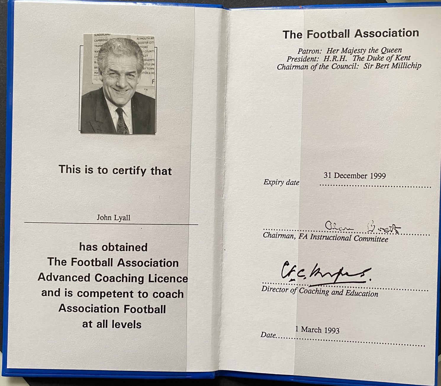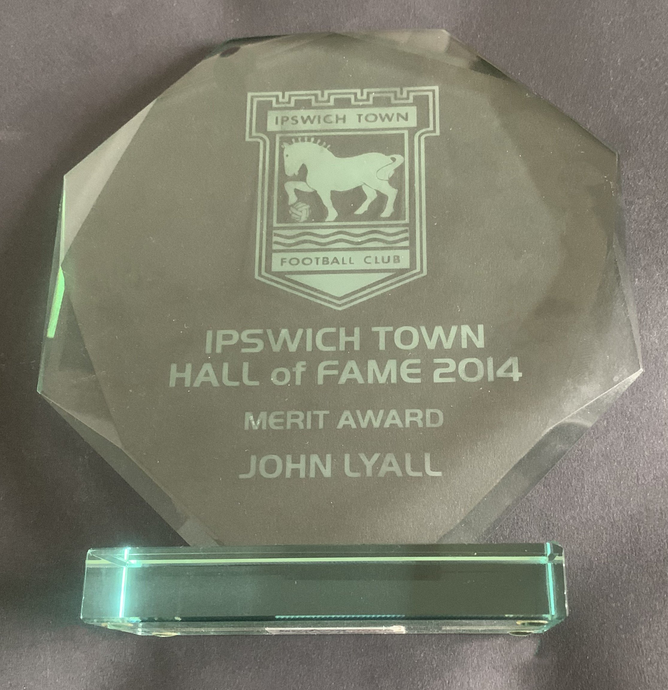 John Lyalls Ipswich Town Hall Of Fame Award + Contract: Hall of Fame merit awarded posthumously in 2014 by Ipswich Town. C/W his contract issued in 1993 which is described as his Managers Service Agreement paying 100k per annum. This lot comes with Johns coaching badge which runs from 1993 to 1999. (3)