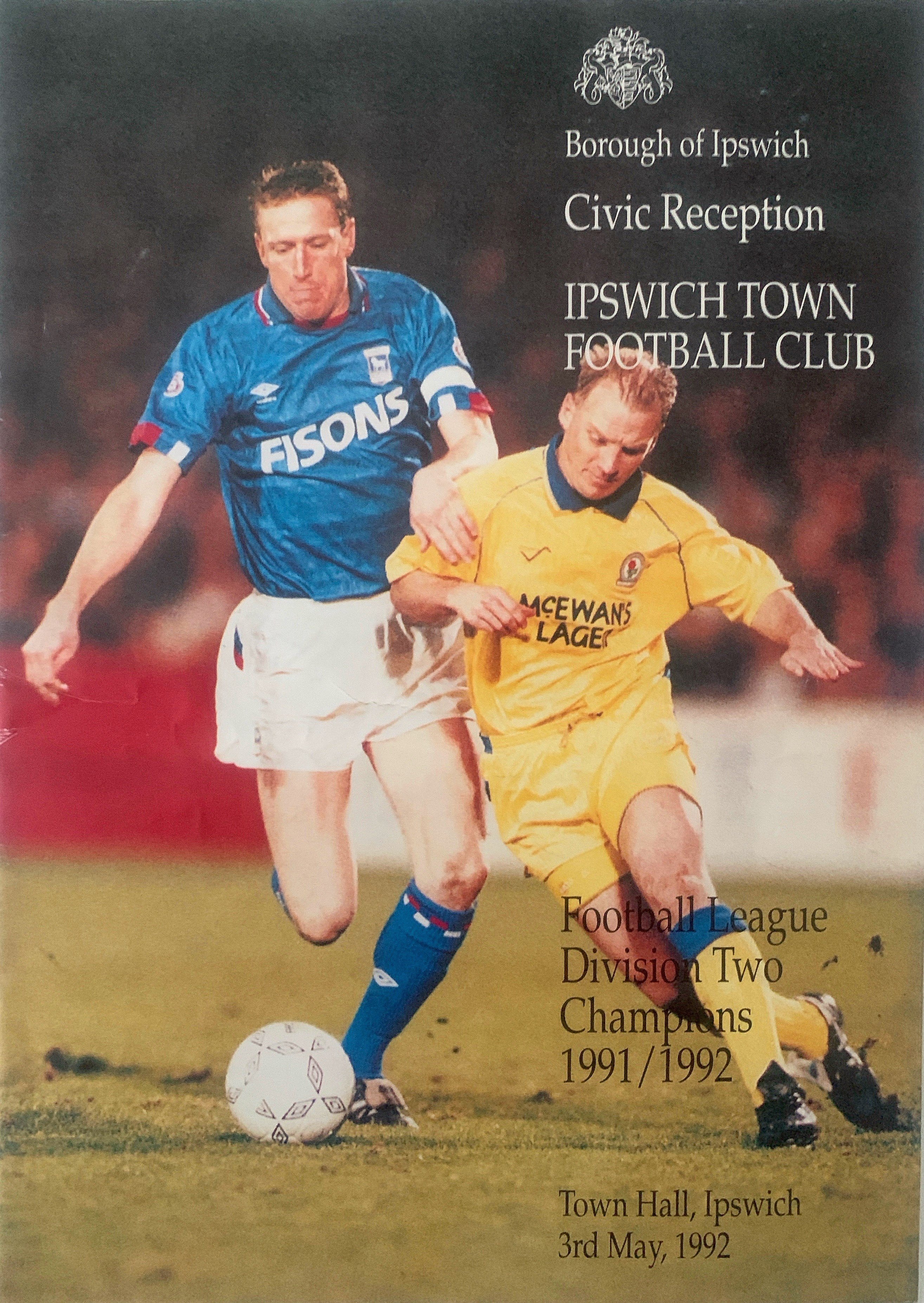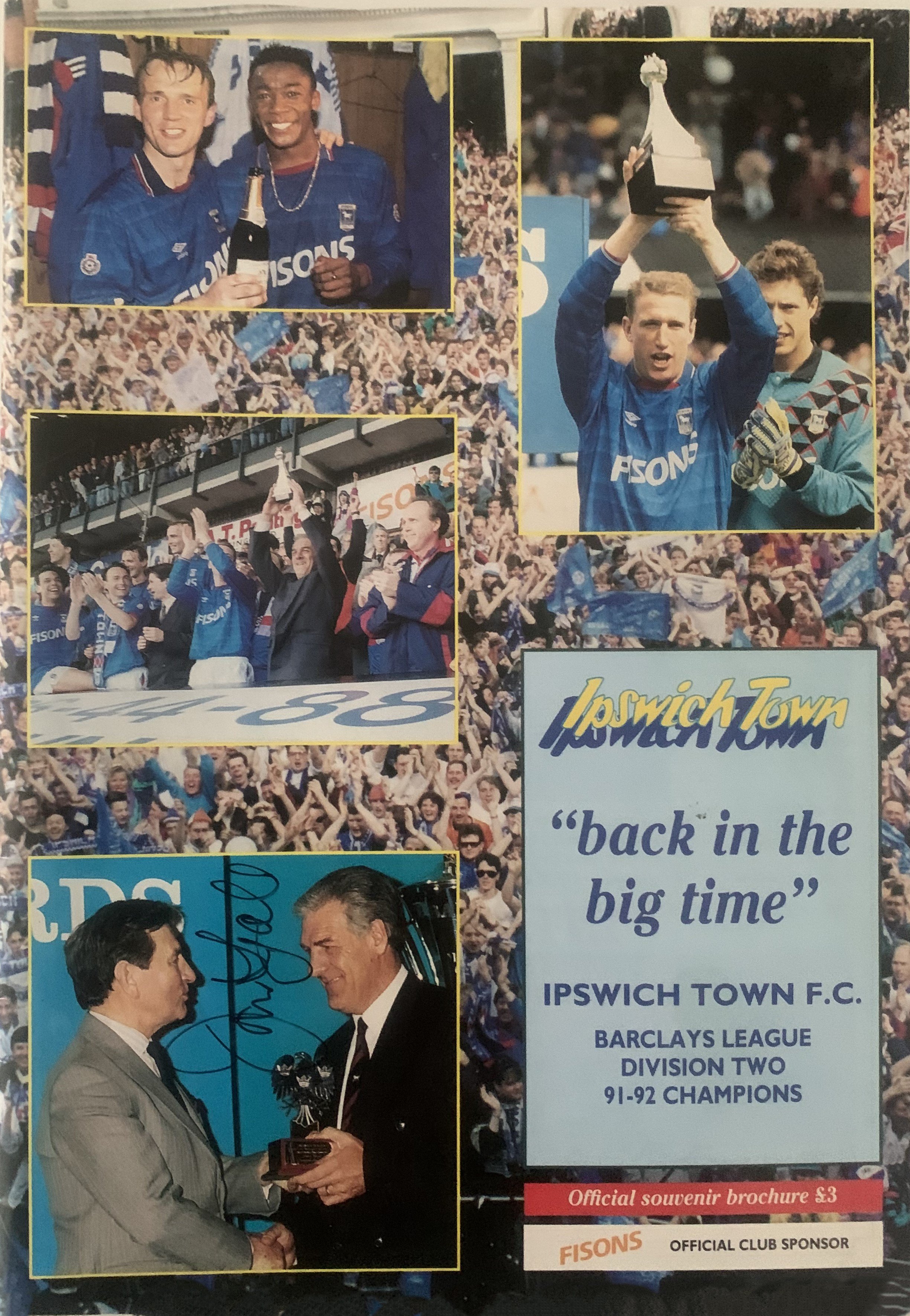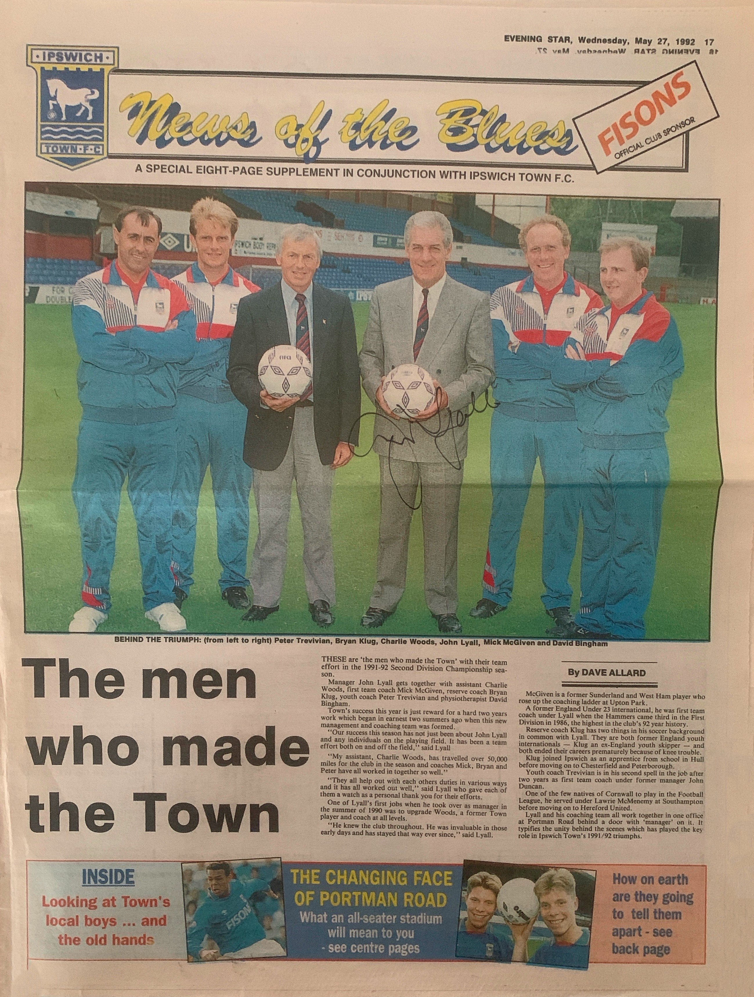 John Lyalls Ipswich Town Football Memorabilia: Includes letters from Martin Cearns and Eddie Chapman from West Hams board congratulating him on his appointment. Signed photos including last match of the season v Brighton with trophy in 1992. Civic reception from Town Hall also signed by Lyall. There are family congratulations cards, ties and other items with his signature including books. Tribute programme from 22 4 2006 which was given to the family which is multi signed. Nice lot.