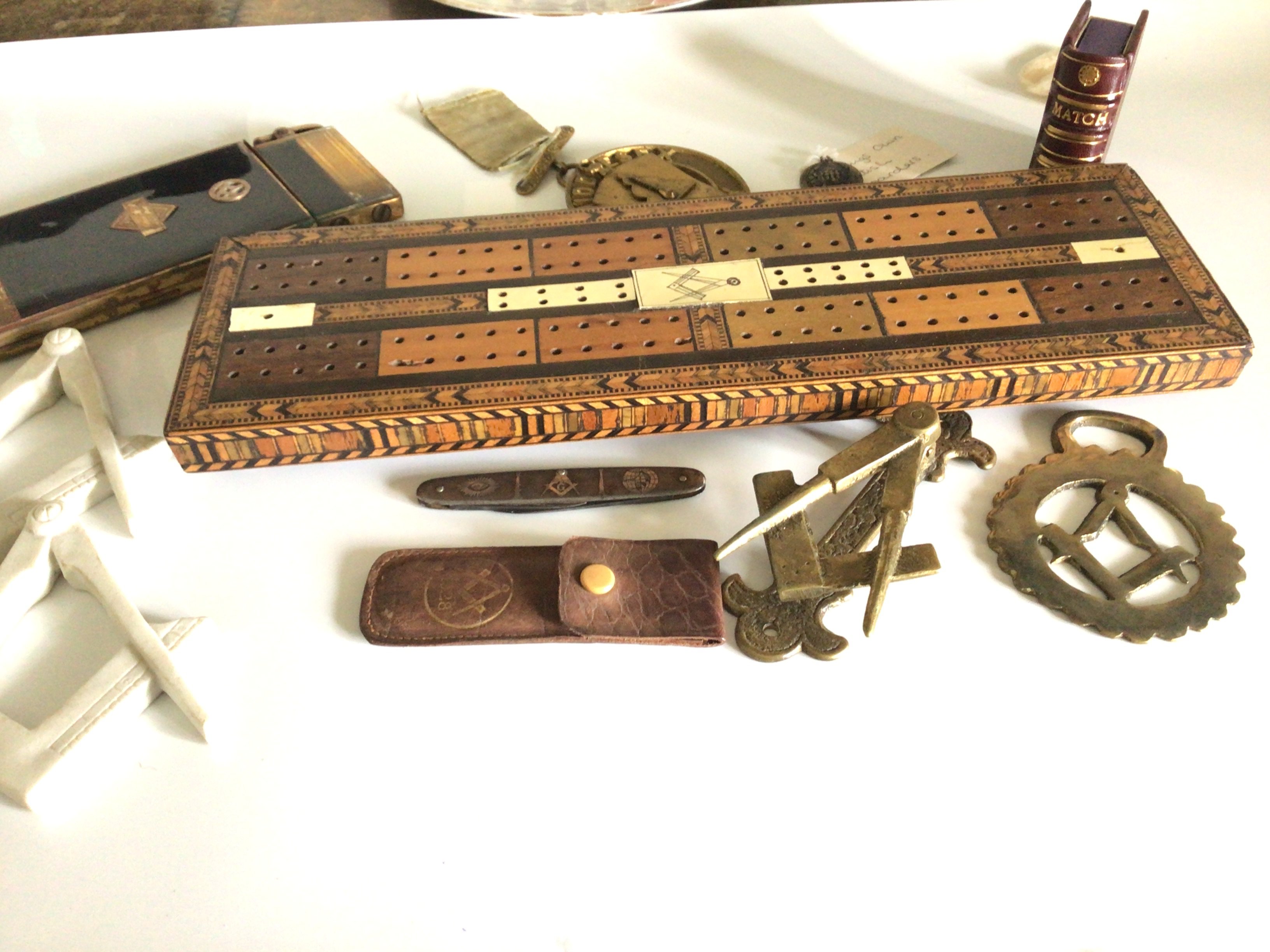 A Masonic inlaid cribbage board a large cigarette box and lighter a pen knife door knocker and other assorted items