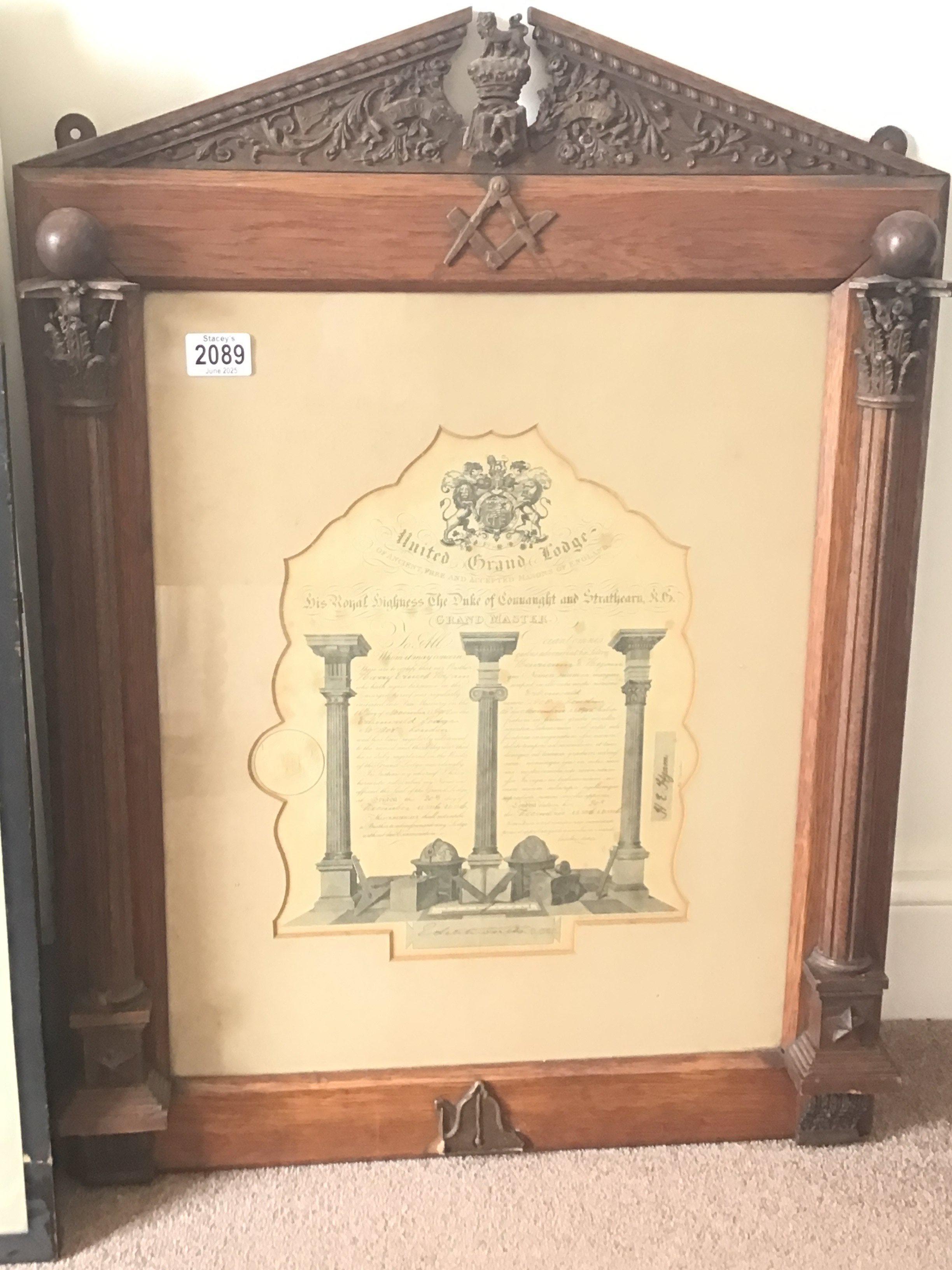 A carved Oak Masonic certificate frame with raised Corinthian columns and other Vintage Masonic prints and pictures.