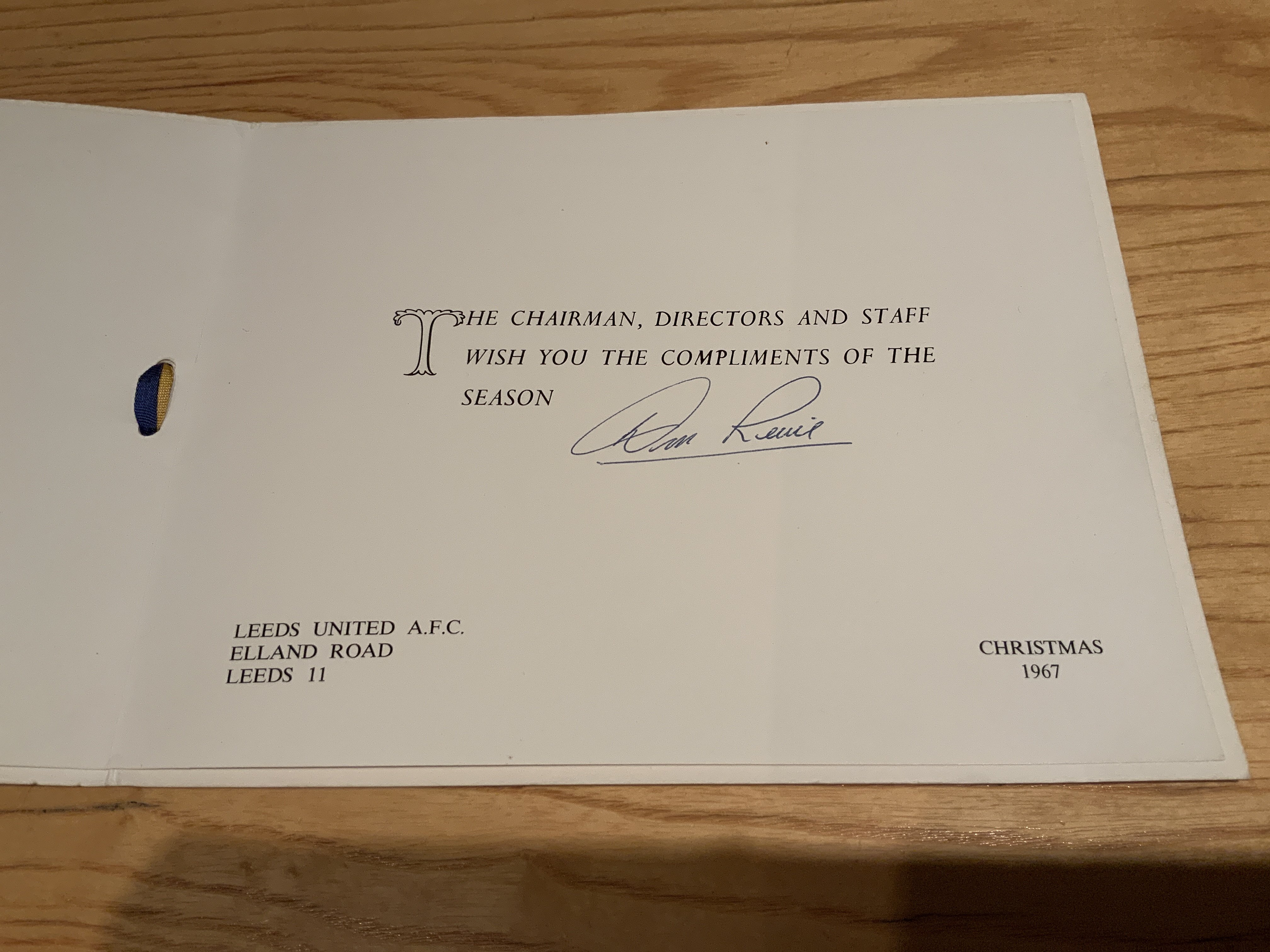 Don Revie Leeds United Signed Christmas Card: Leeds United with yellow and blue tassels from the Chaitman Directors and staff at Christmas 1967. Signed without dedication by Don Revie. COA from reputable source.