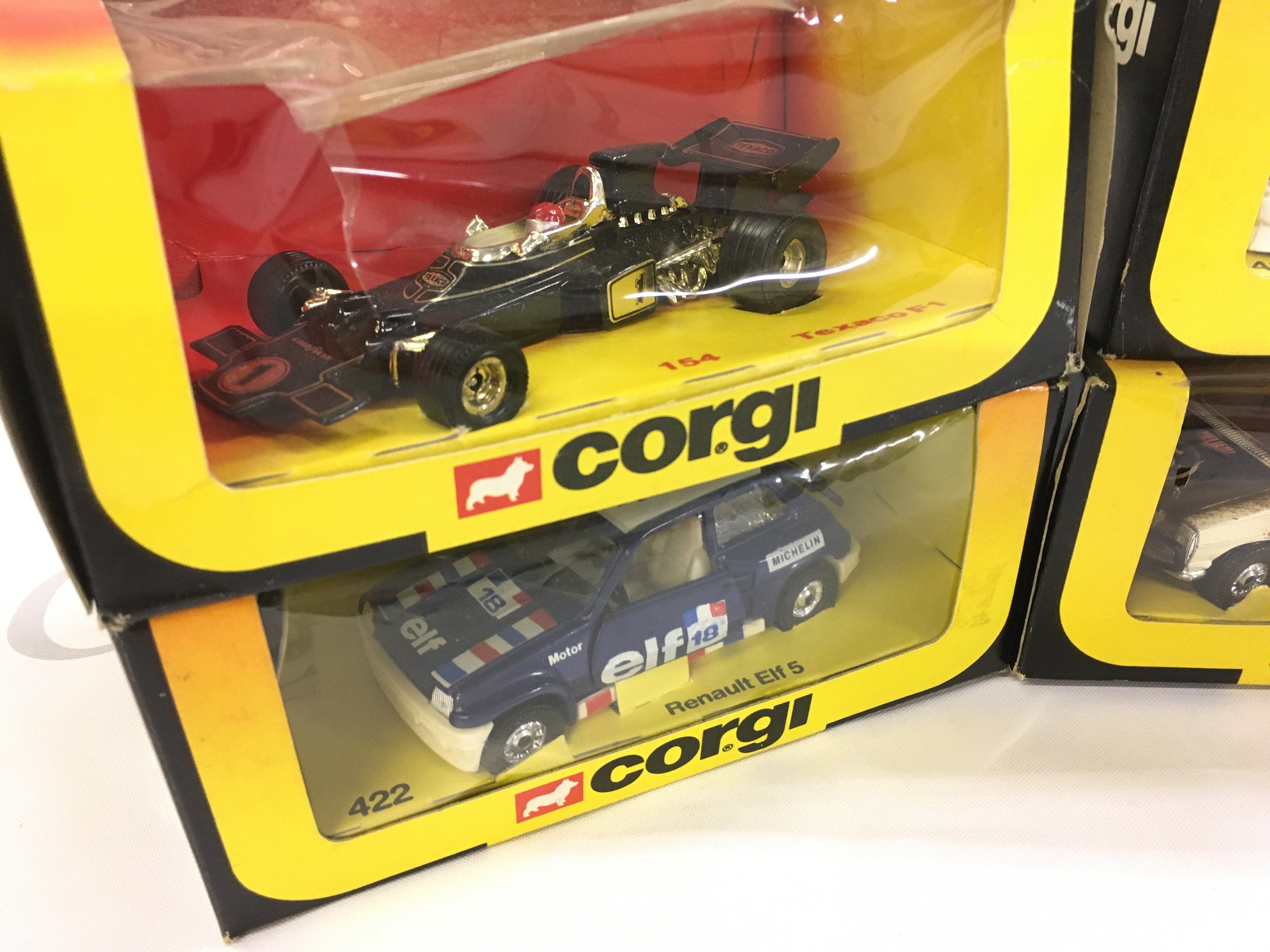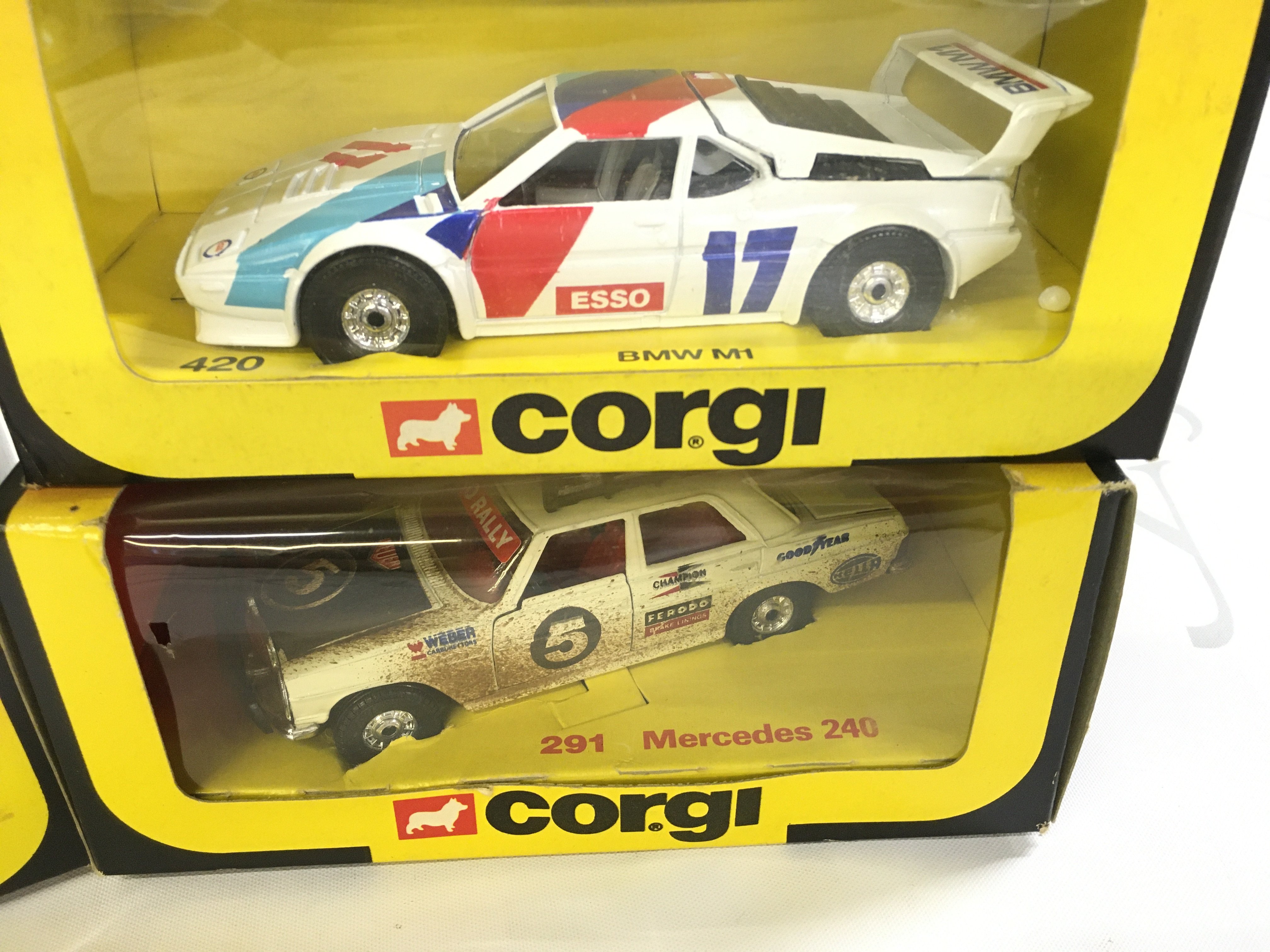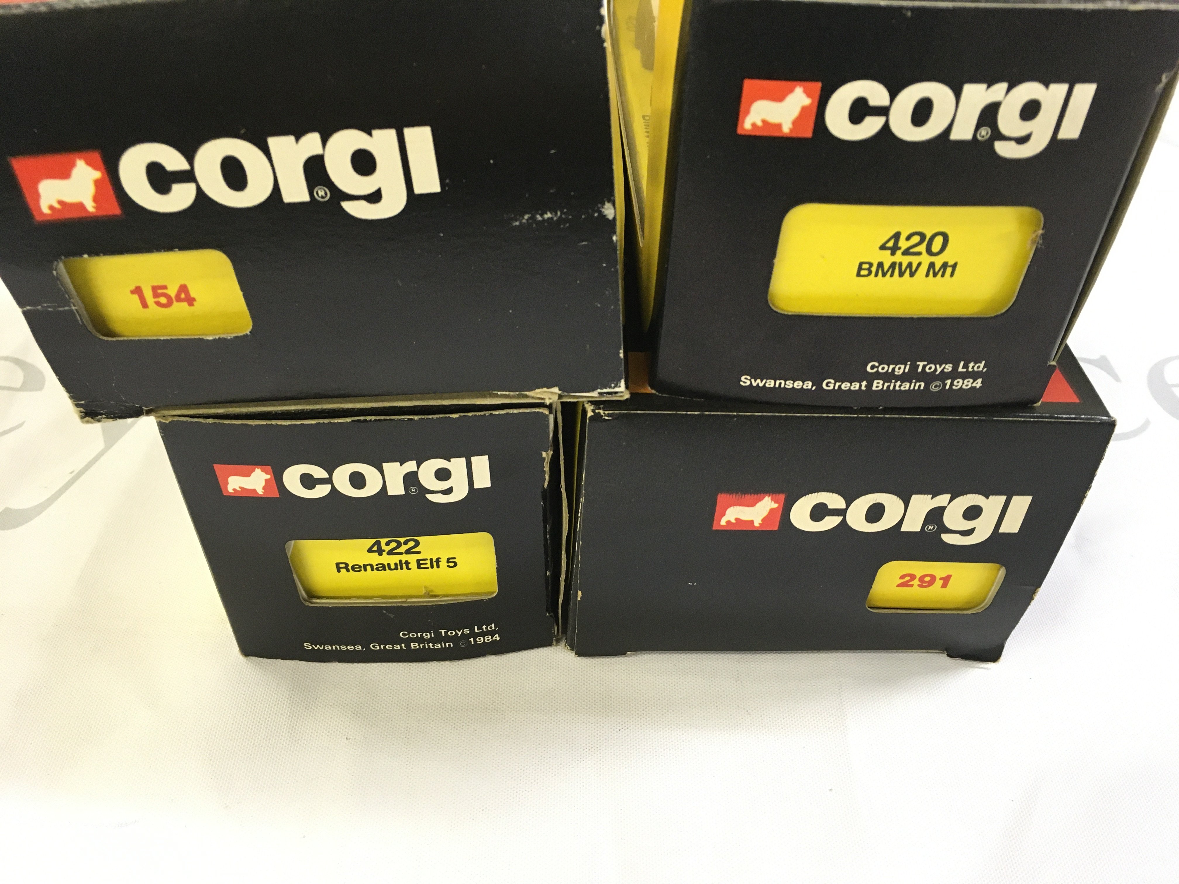 4 Boxed Corgi Diecast Including Texaco F1 #154. A Renault Elf 5 #422. A BMW M1 #420 And A Mercedes 240 #291.
