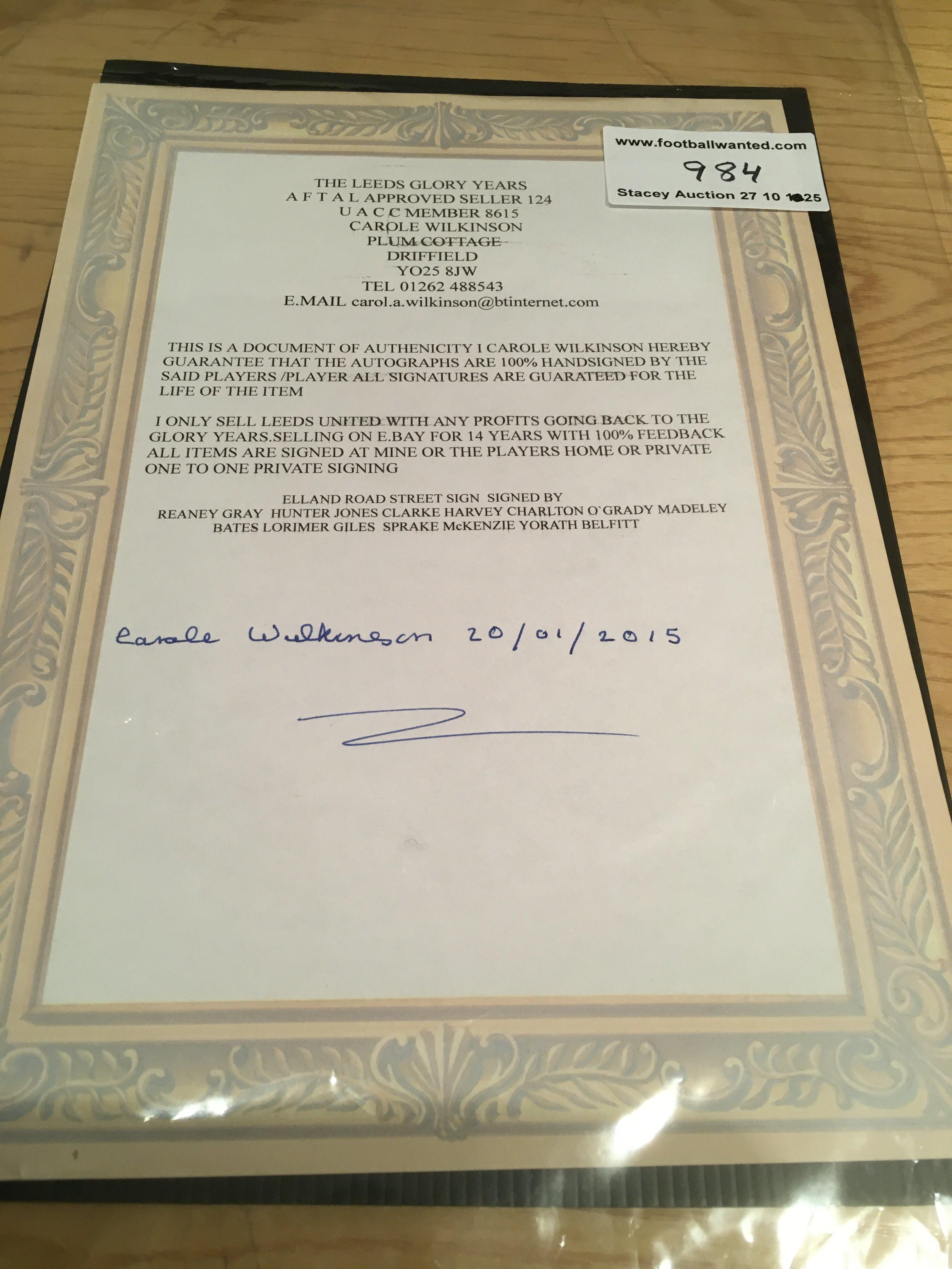 1970s Leeds United Signed Elland Road Sign: Replica 13 inch road sign signed by legends Reaney Gray Hunter Jones Clarke Harvey Charlton OGrady Madeley Bates Lorimer Giles Sprake McKenzie Yorath and Belfitt. Coa from reputable source.