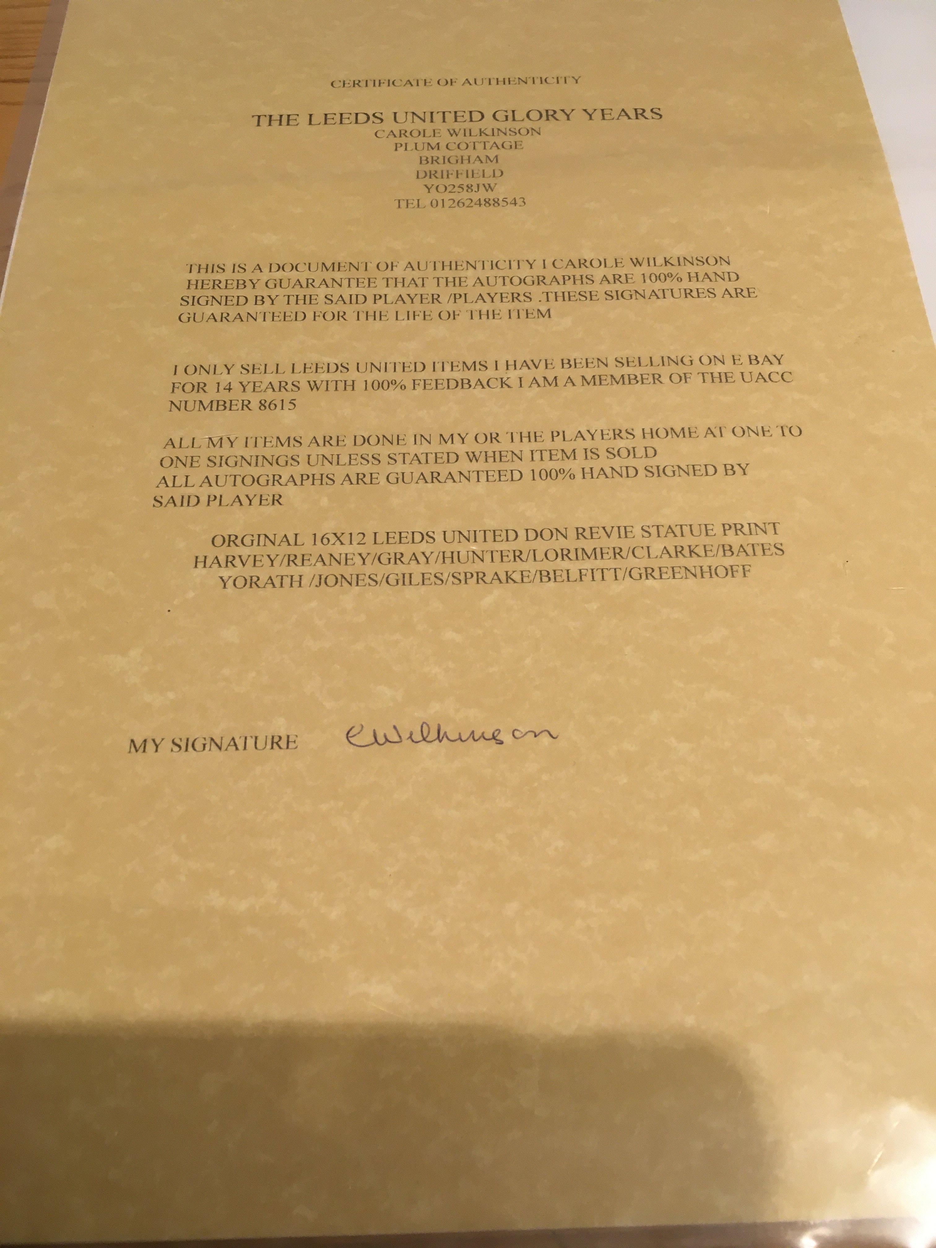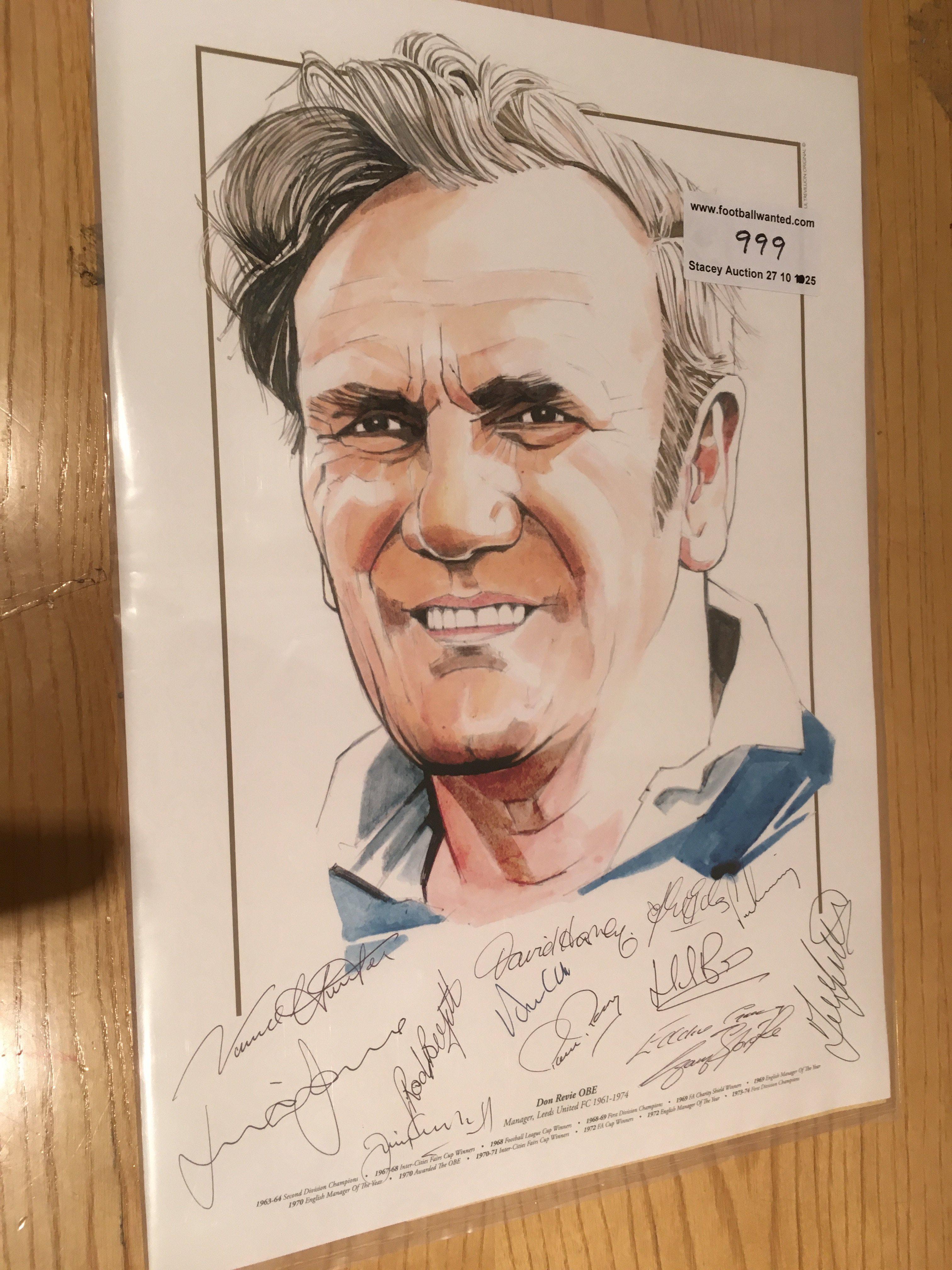Don Revie Leeds United 1970s Squad Signed Football Print: Stunning 42 x 32cm print of Don Revie with his achievements printed to lower border. Hand signed by his successful players in the 70s. Autographs include Harvey Reaney Gray Hunter Lorimer Clarke Bates Yorath Jones Giles Sprake Belfitt and Greenhoff. Coa from reputable source.