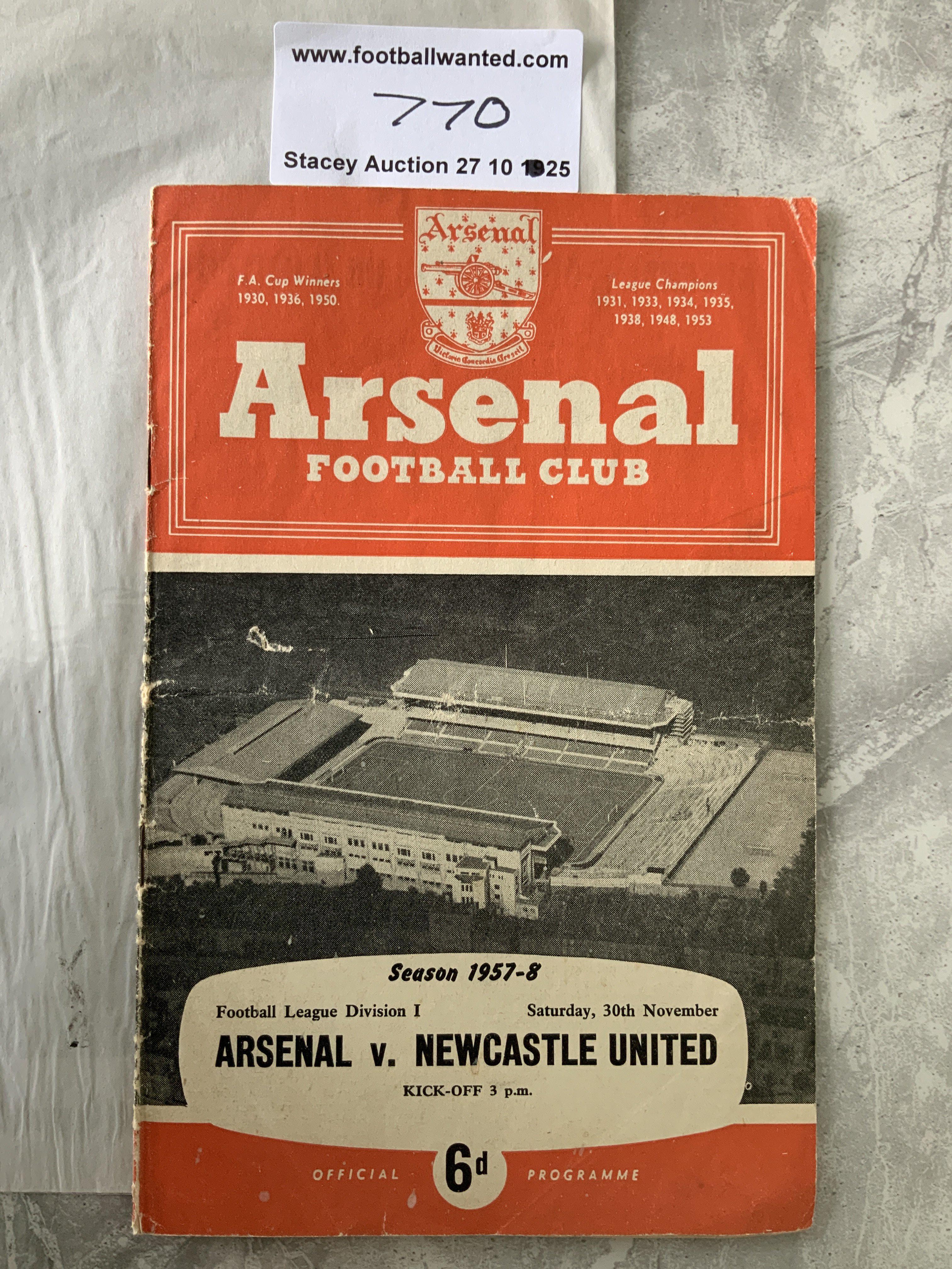 57/58 Arsenal Signed Football Programme: Fully signed on team page by 12 for the match v Newcastle. Collected by Manchester United fan as this is the team that faced the ill fated Busby Babes a few months later in their last match in England.