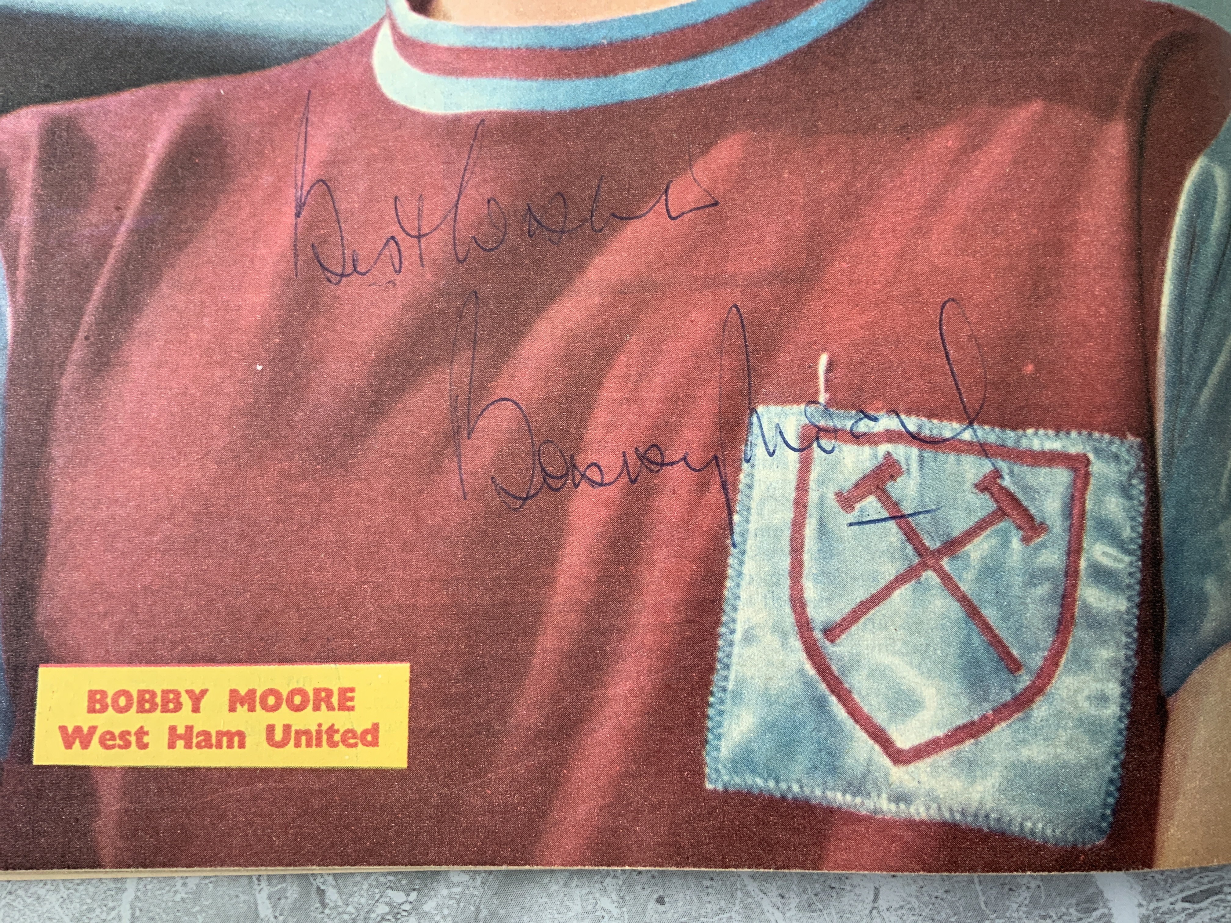 Bobby More West Ham Signed Football Picture: Fully size magazine picture still in July 1961 Charles Buchan Monthly. Hand signed in blue biro best wishes without dedication.