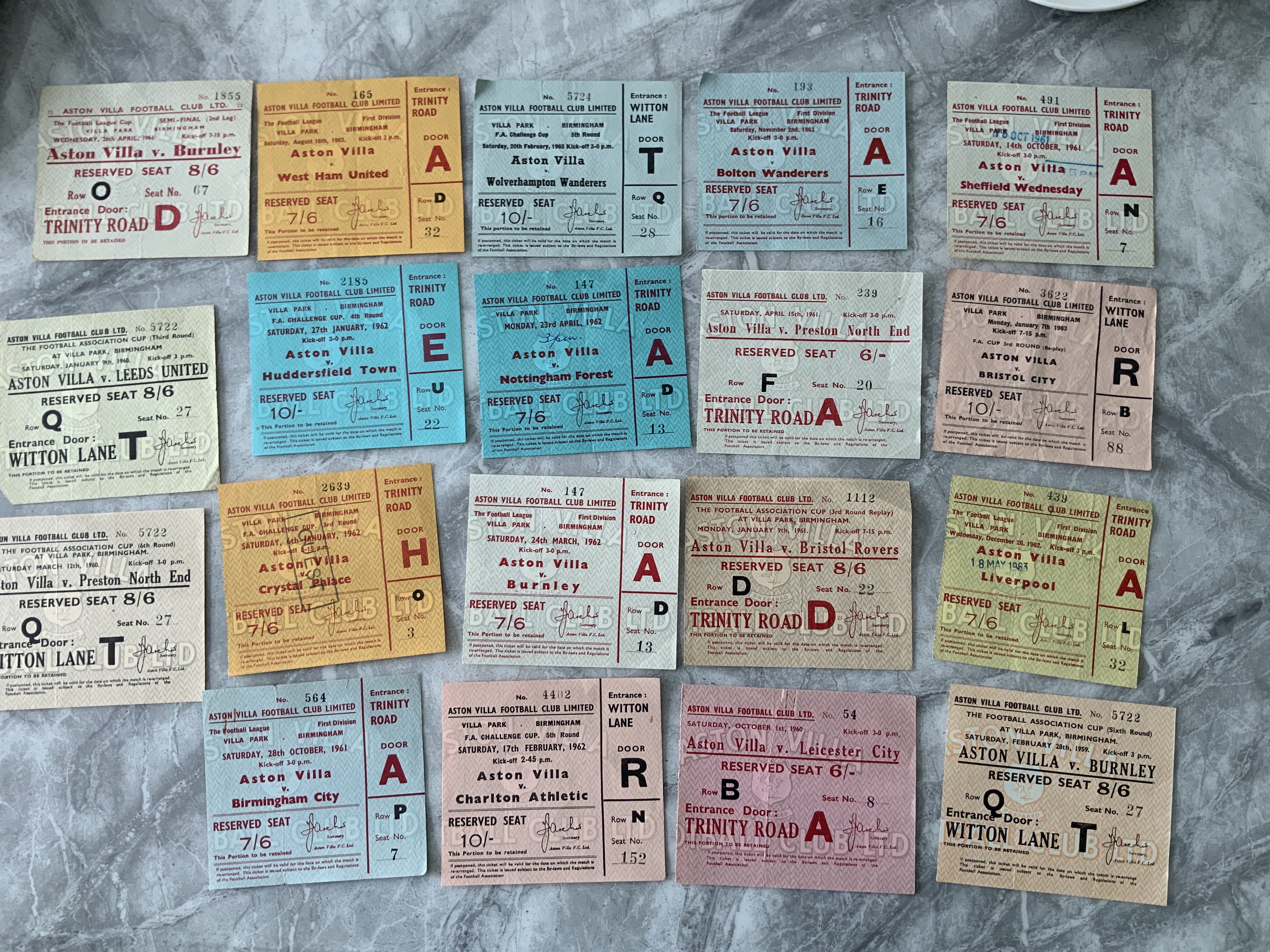 Aston Villa Home Football Tickets 58/59 - 64-65: Includes rare 60/61 League Cup Semi Final v Burnley. Many other FA Cup matches including 59/60 Leeds, Preston and league matches in 62/63 v West Ham and Liverpool. Excellent. (19)