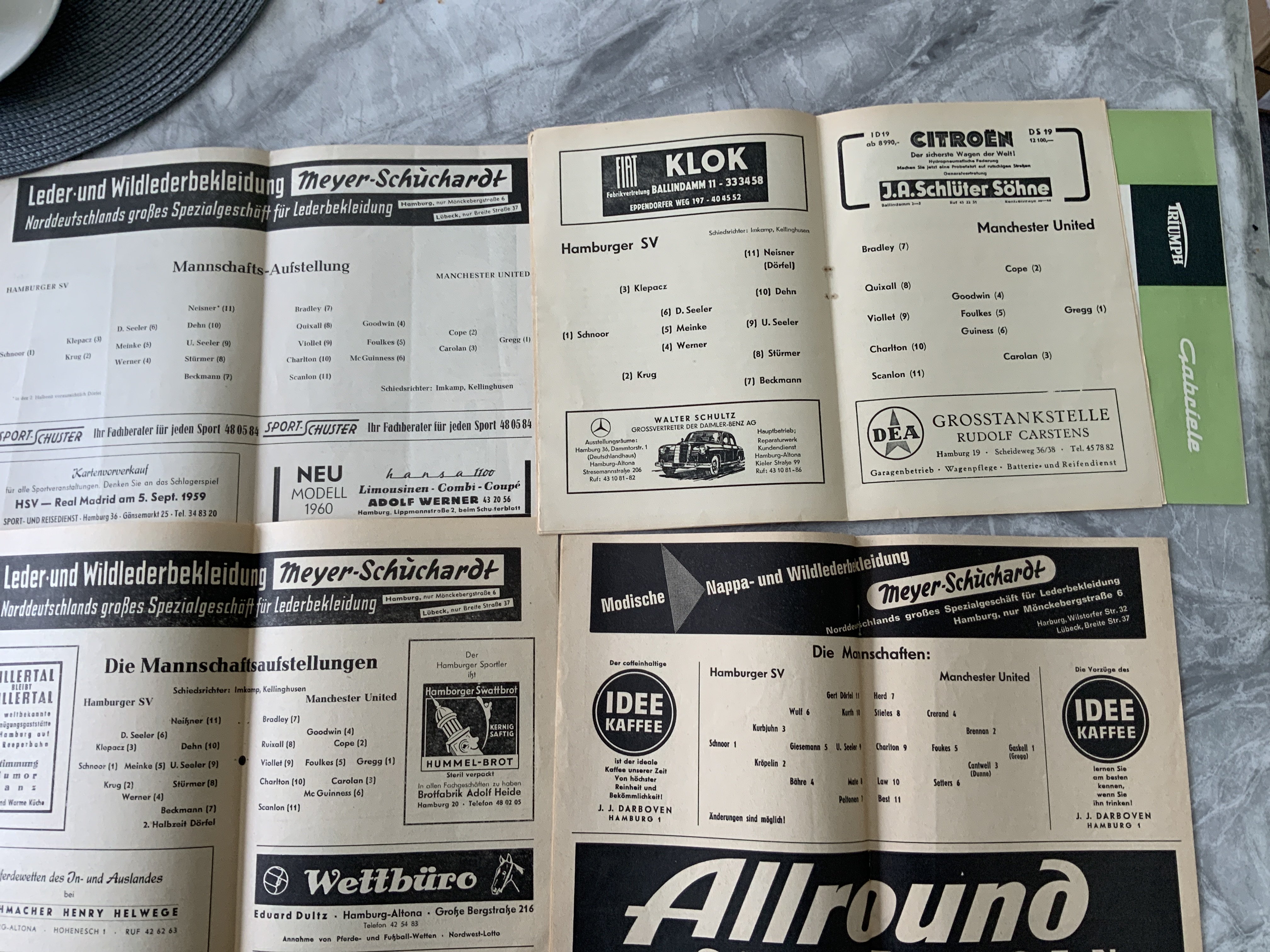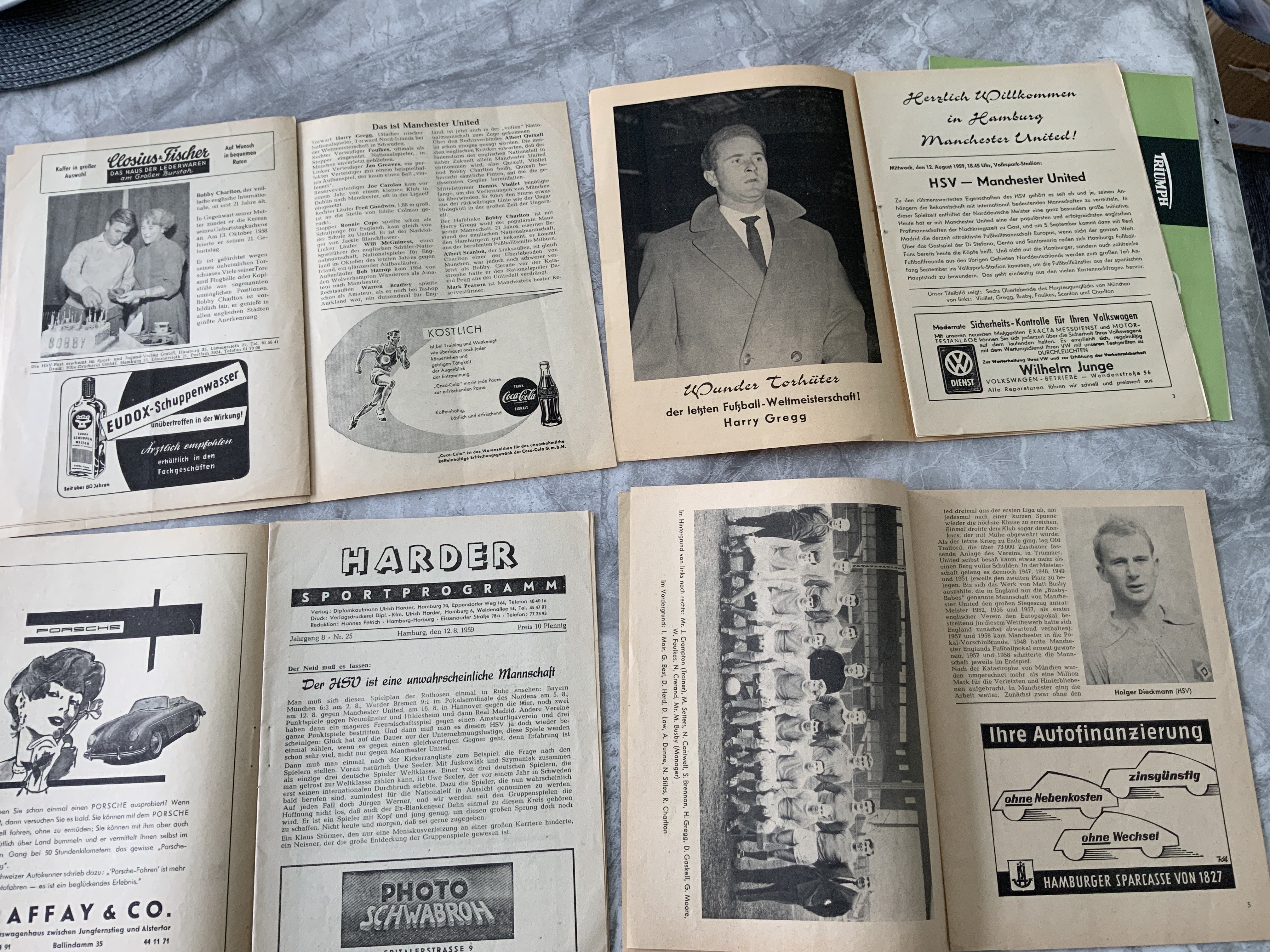 1959:Hamburg v Manchester United Football Programmes: 3 versions of the match dated 12 8 1959. Lipphardts Sport version plus the aptly named Harder version Sportprogramm. C/W HSV Post version. Also the HSV version for the match on 12 8 1964. Excellent. (4)