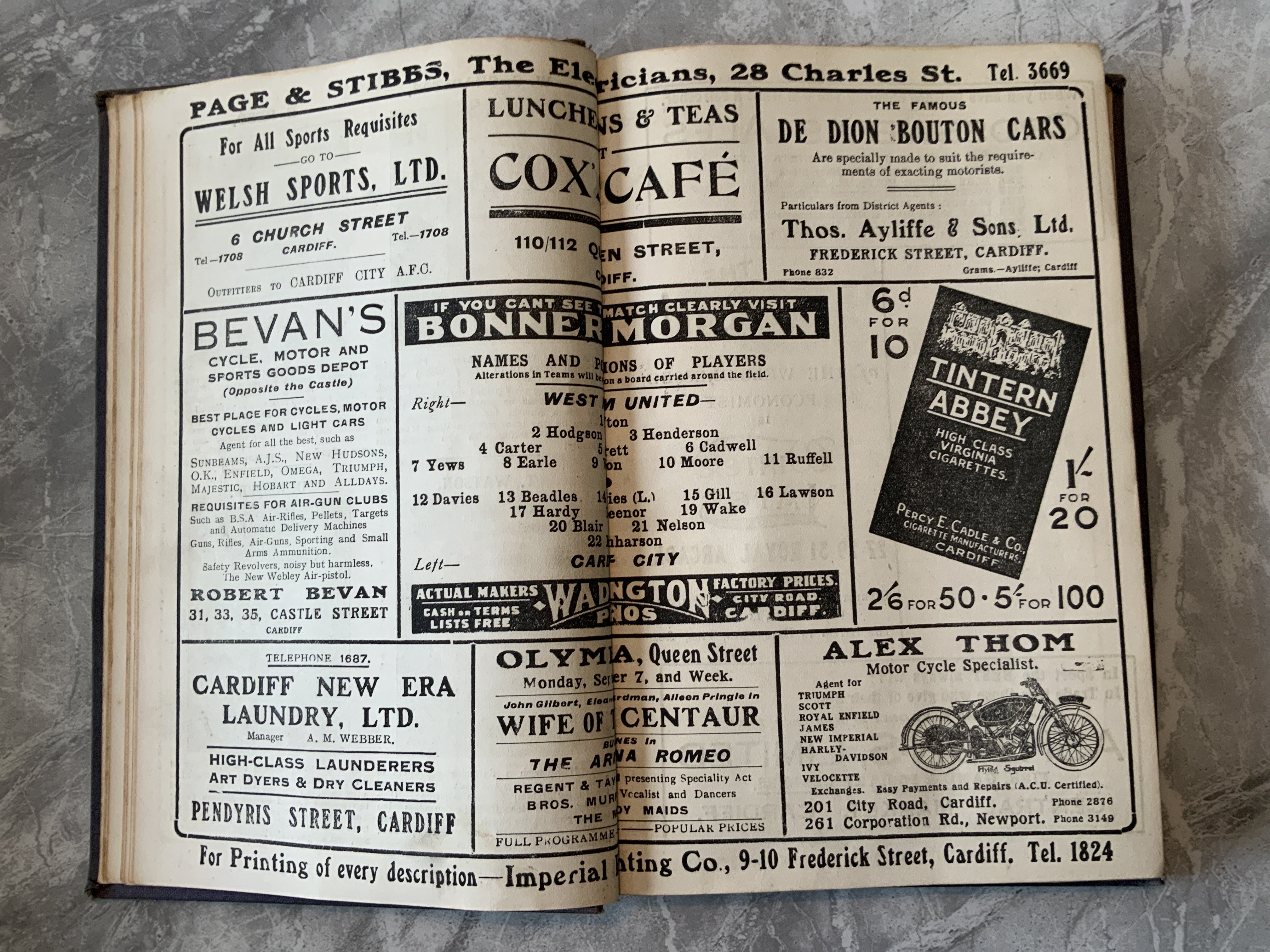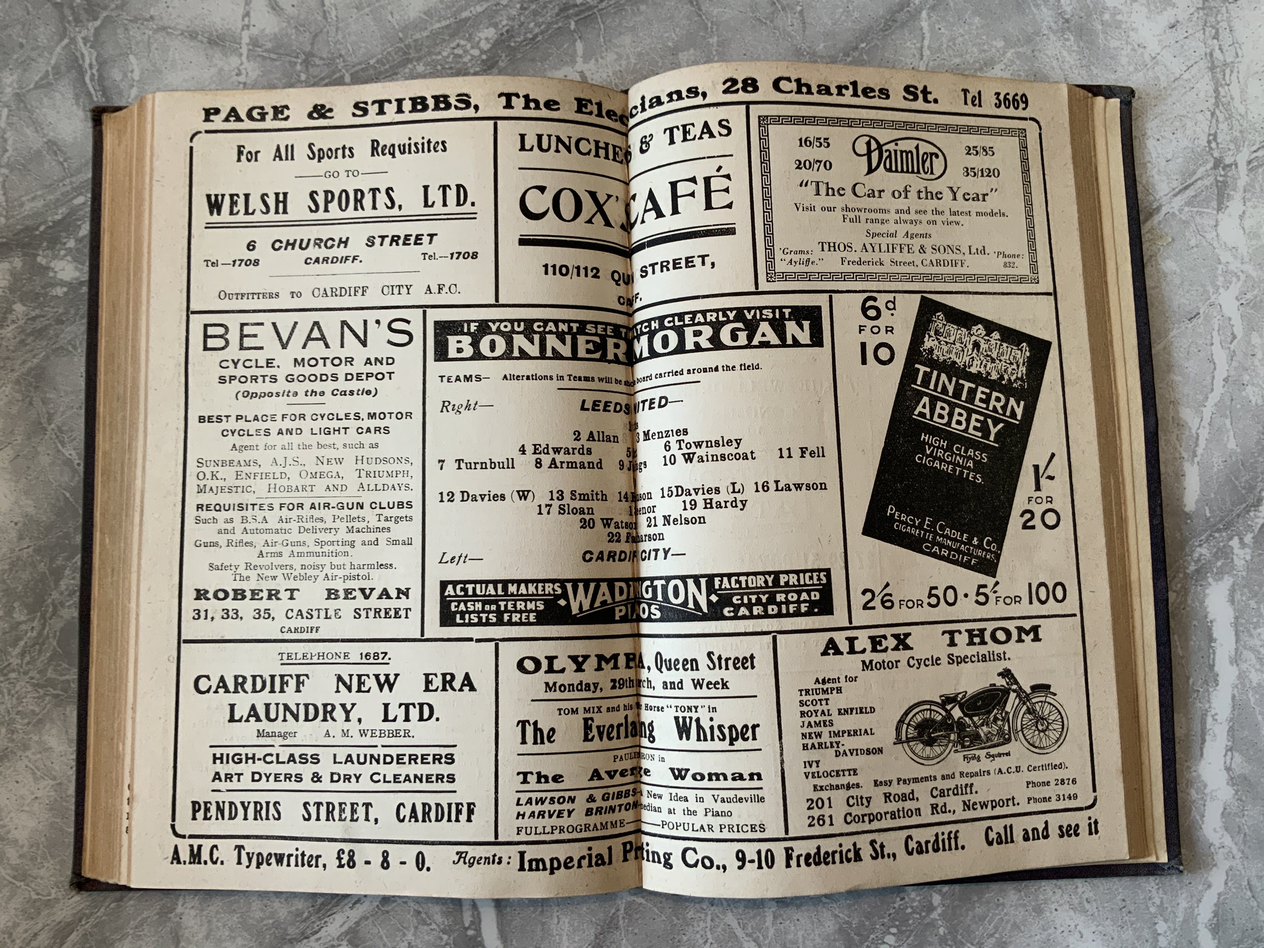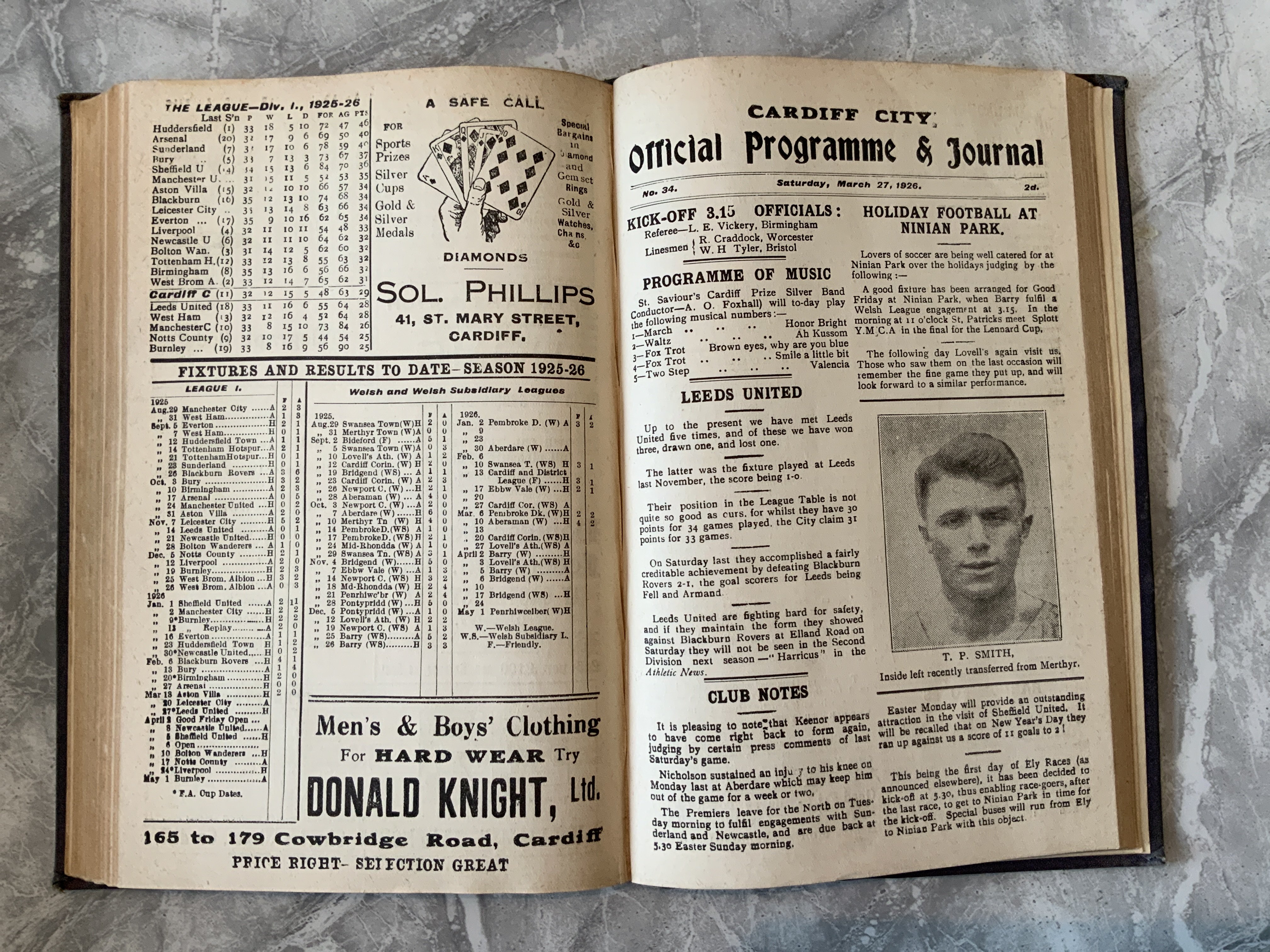 1925 - 1926 Cardiff City Bound Volume Of Football Programmes: 8 page programmes of first team division 1, reserves Welsh League and A team matches. First team includes Manchester United Arsenal West Ham Leeds and Tottenham. Covers missing.