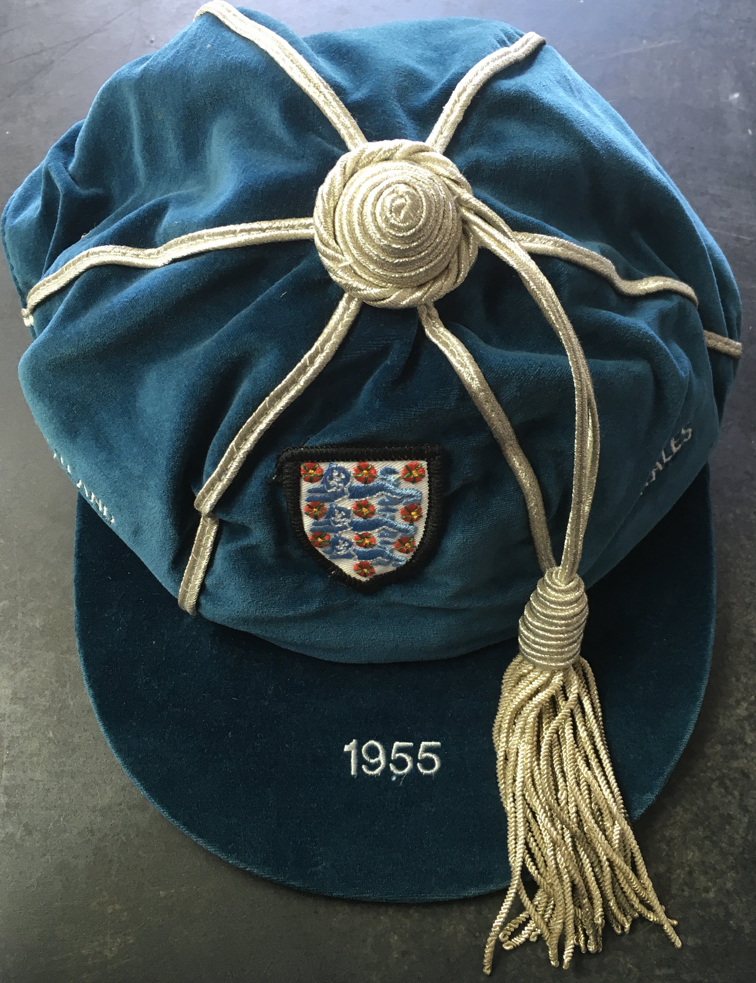 Frank Blunstone Chelsea Footballer 54/55 England International Cap: Full blue International cap with 3 Lions to front and tassel. Peak reads 1955 with the words Wales and Scotland sewn into cap. This was awarded for the two home nations matches played in his 1st division winning season versus mentioned opponents with Wales being his debut. Please note this cap was re issued by the FA later as a replacement as differs to the original 1950s caps. Very good. Made by Toye Kenning and Spencer Ltd.