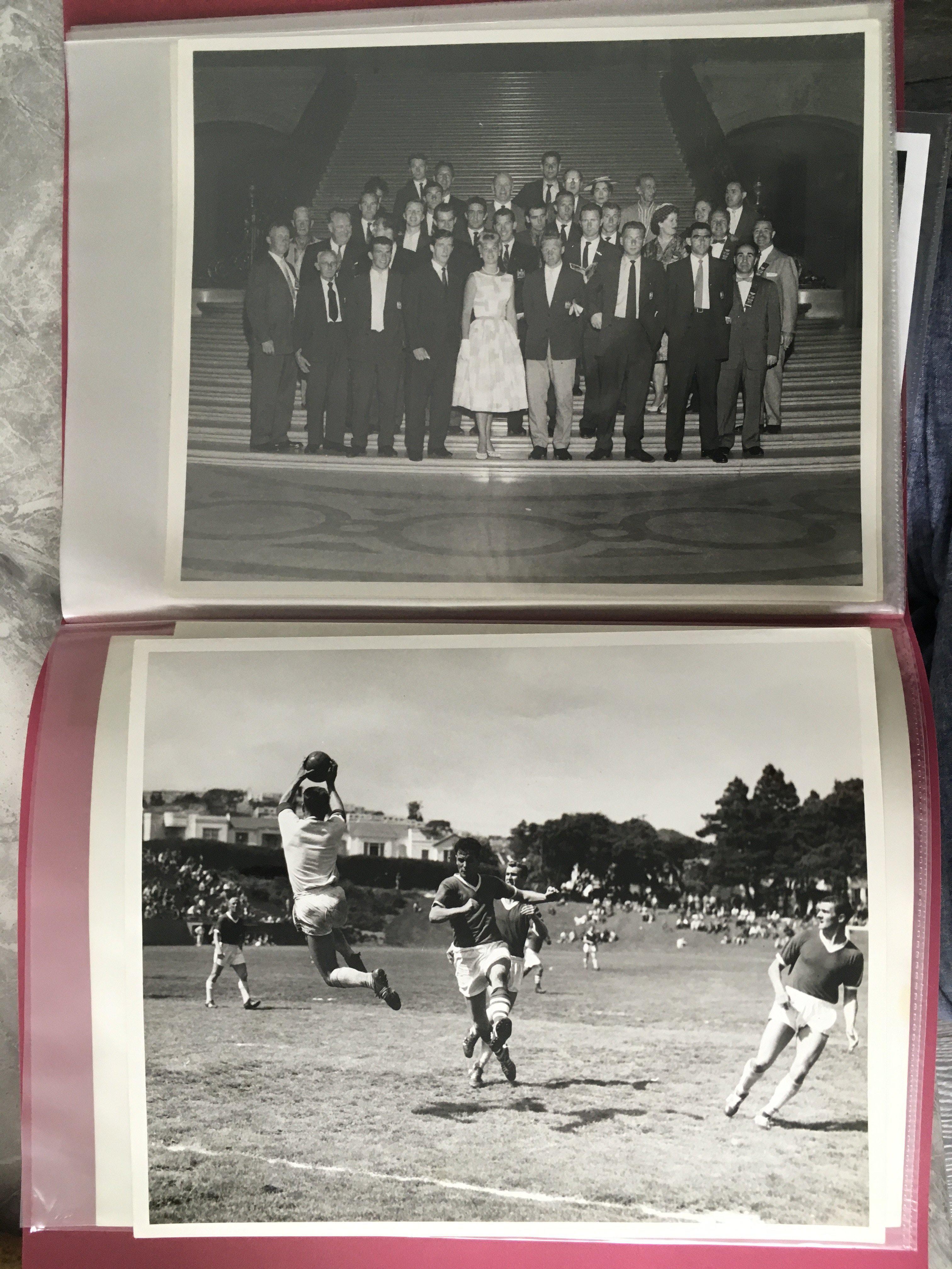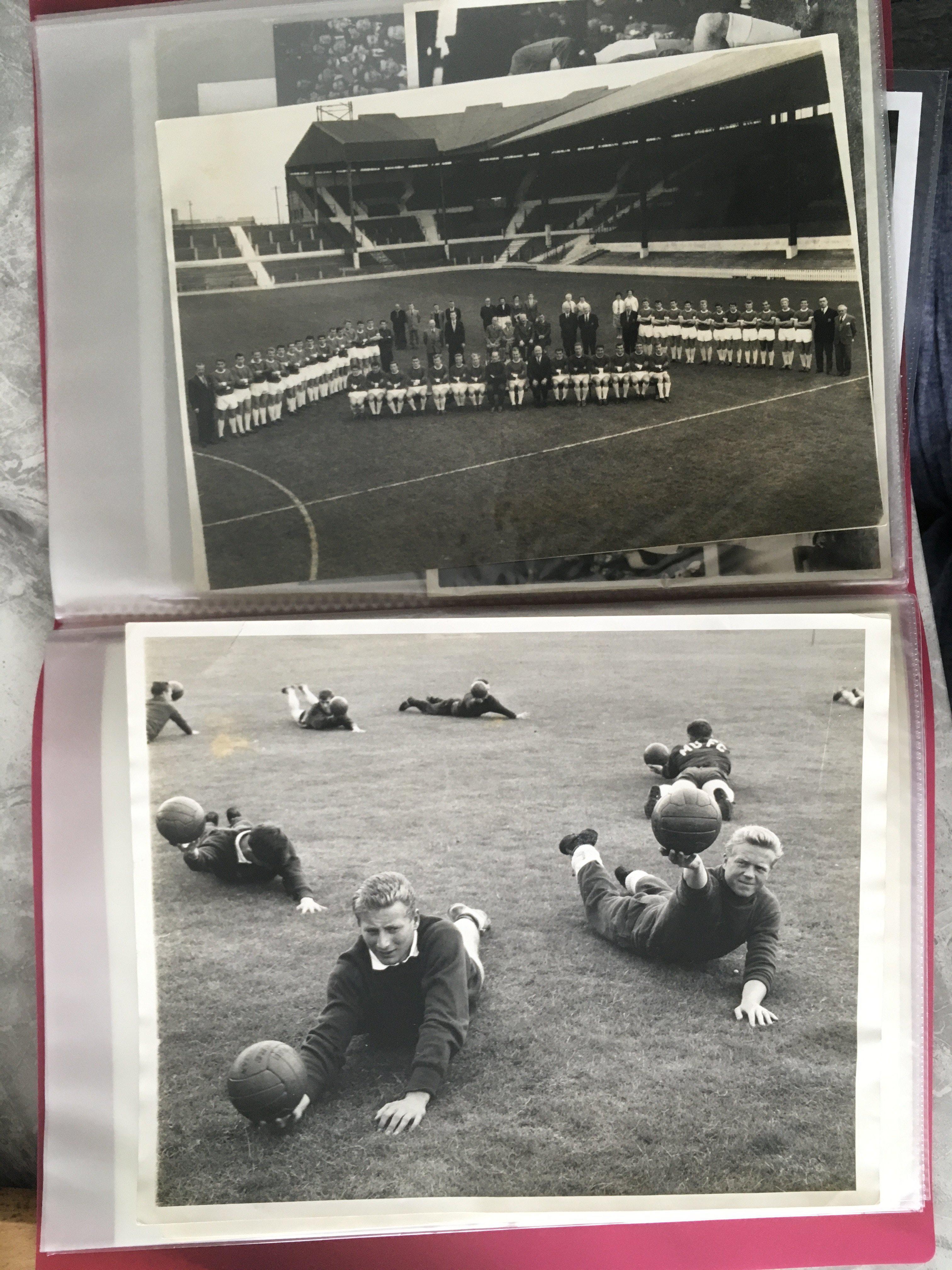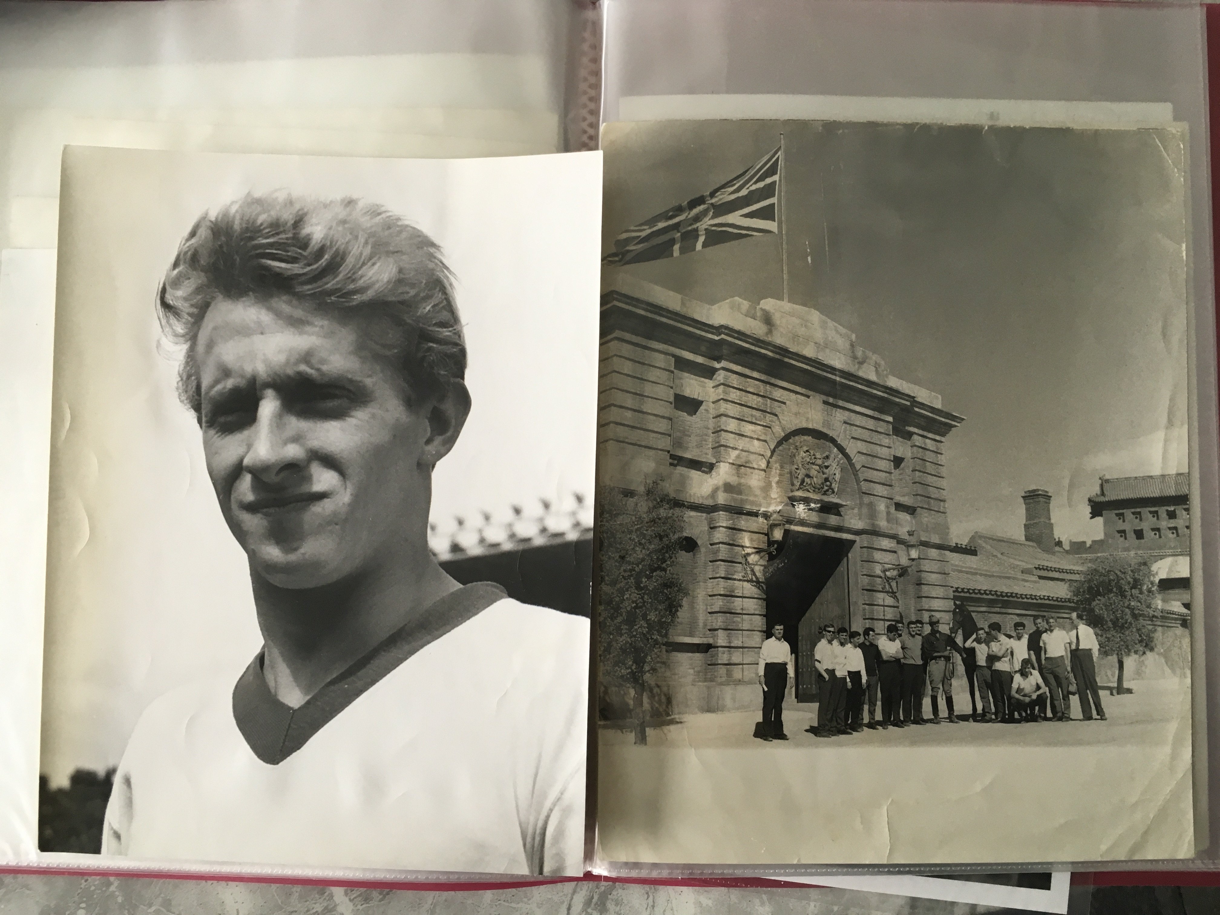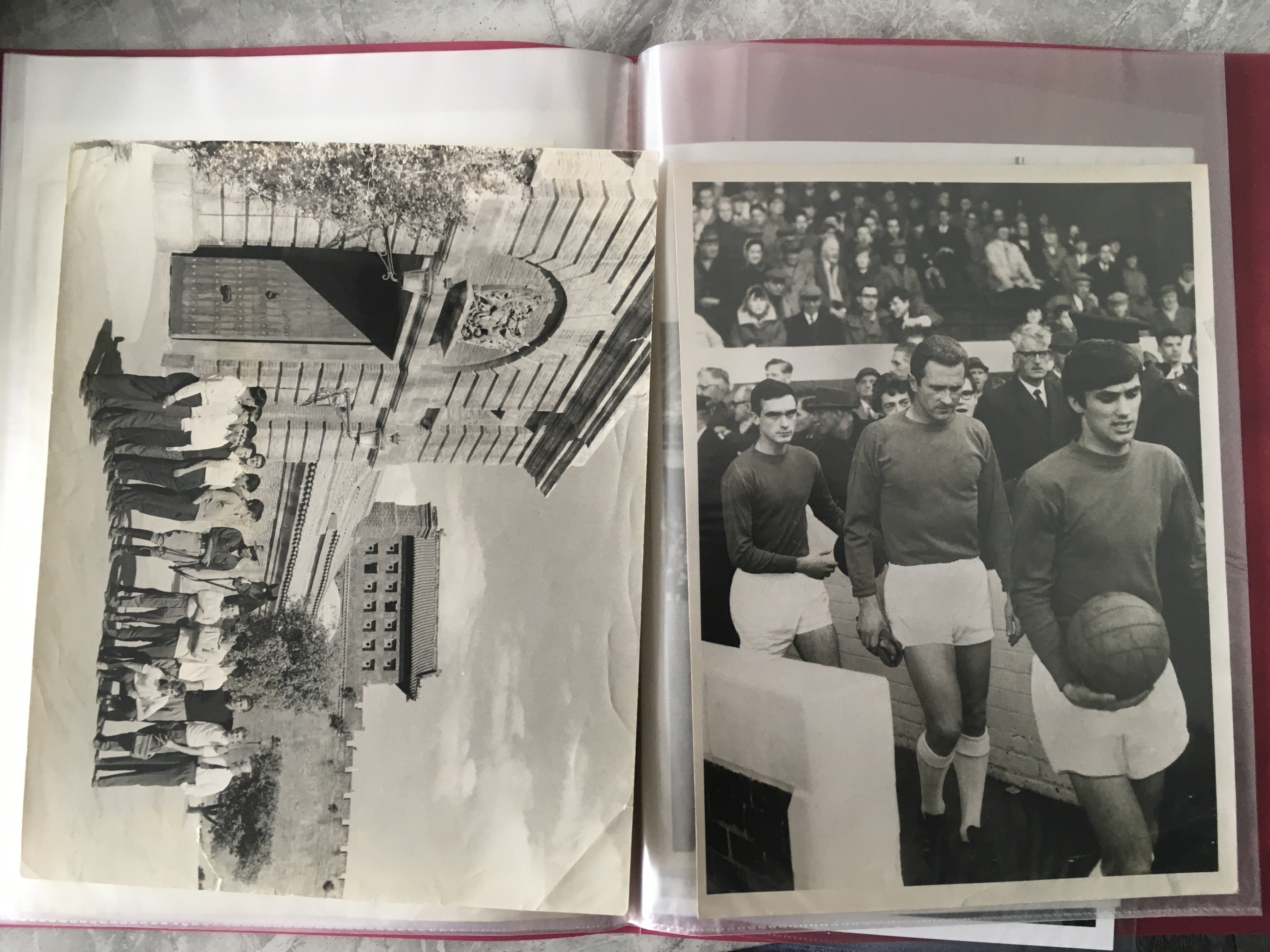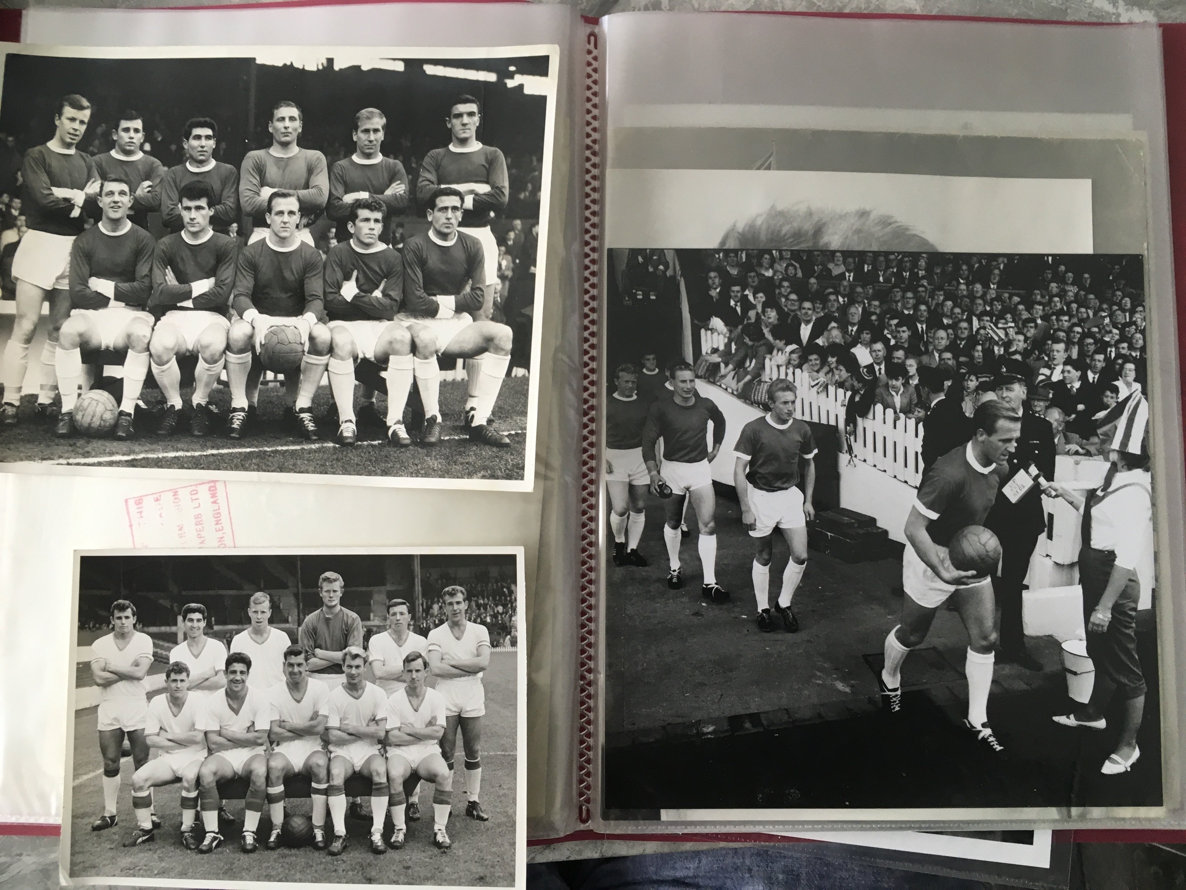 Manchester United 1960s Football Press Photos: Match action on a foreign tour possibly to Bilbao x 3, travelling party at a function, being greeted on the runway and Matt Busby mainly with Valencia press stamps. Additionally there are team groups, individual pictures and casual team line ups in Spain when they were visiting the filming of 55 Days In Peking. Large black and white photos are all from the press with only a couple not having stamps to rear. (18)