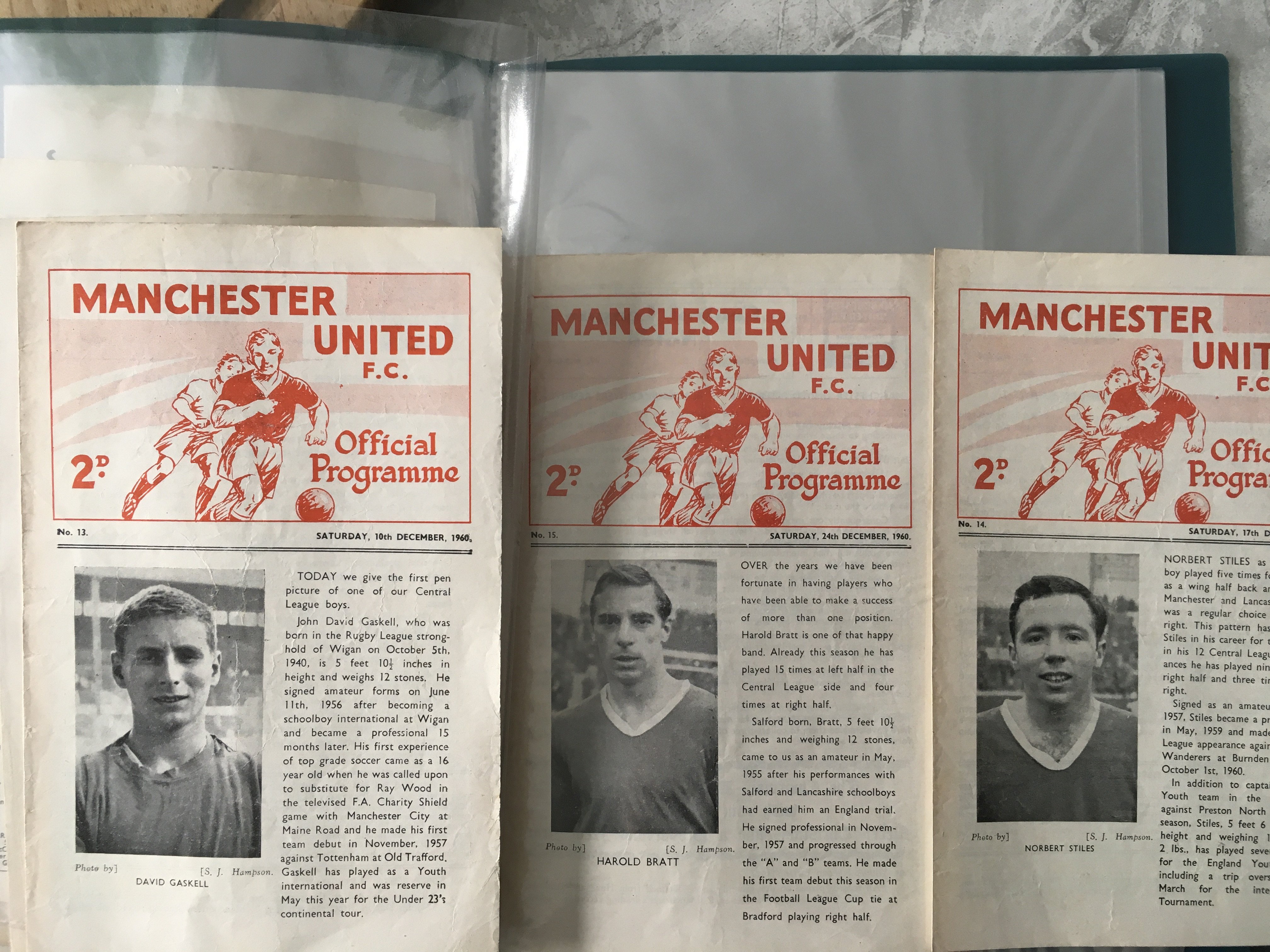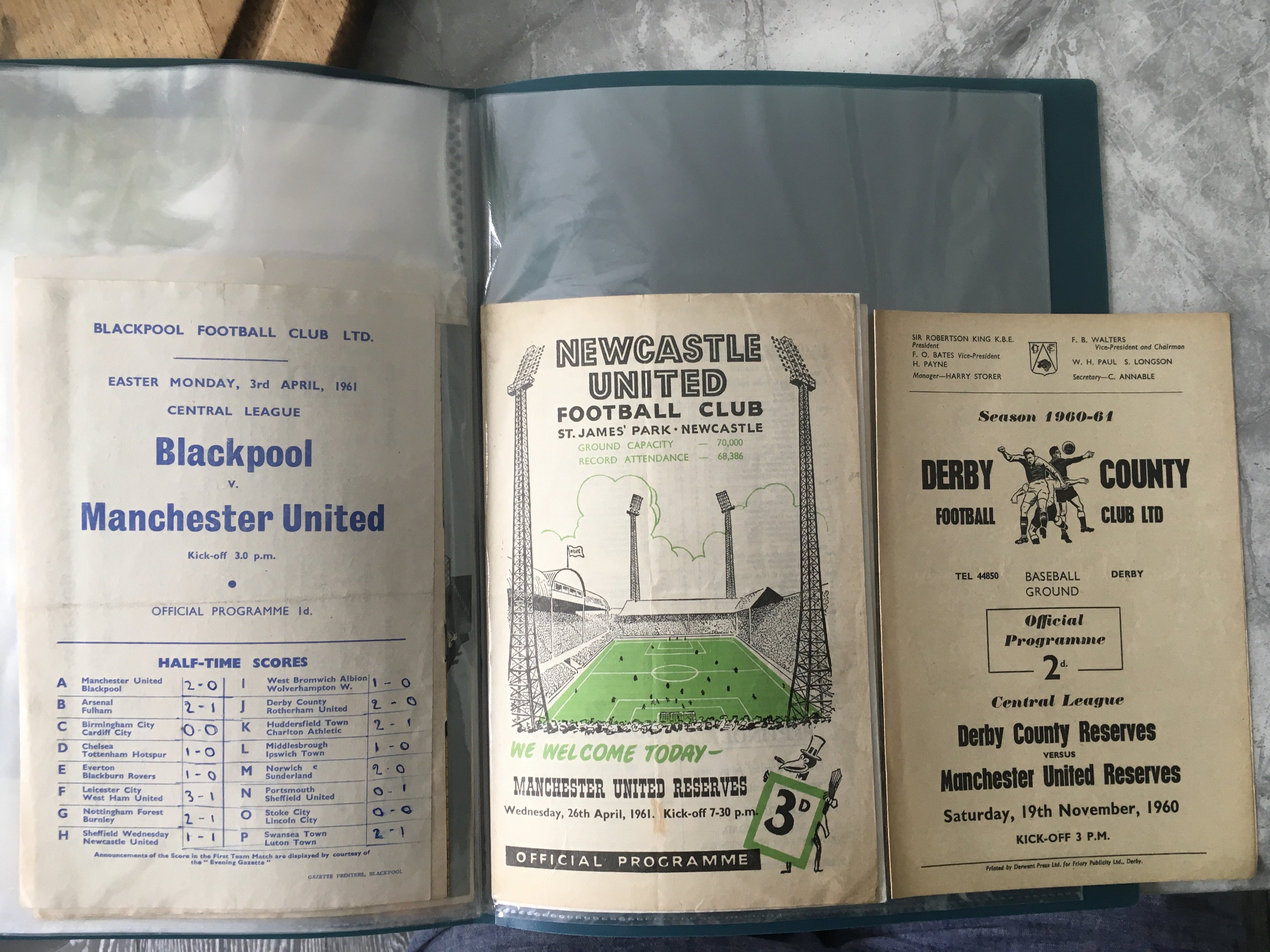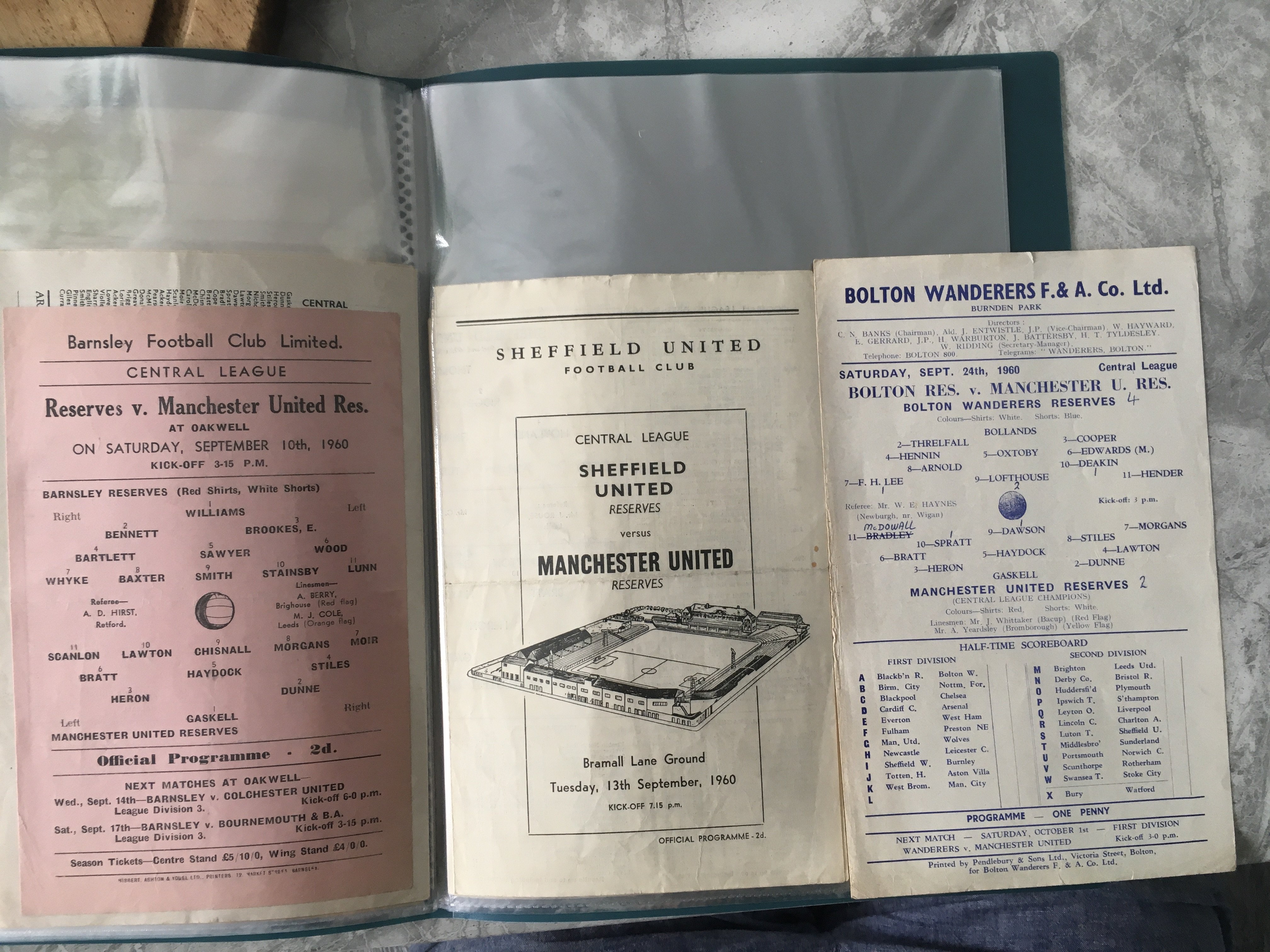 60/61 Manchester United Reserve Football Programmes: probably complete at home (26). Aways in the Central League include Barnsley Sheffield United Bolton West Brom Aston Villa Wolves Blackpool Newcastle Huddersfield Man City and Derby. Excellent condition with no tokens missing but some having team changes. (37)