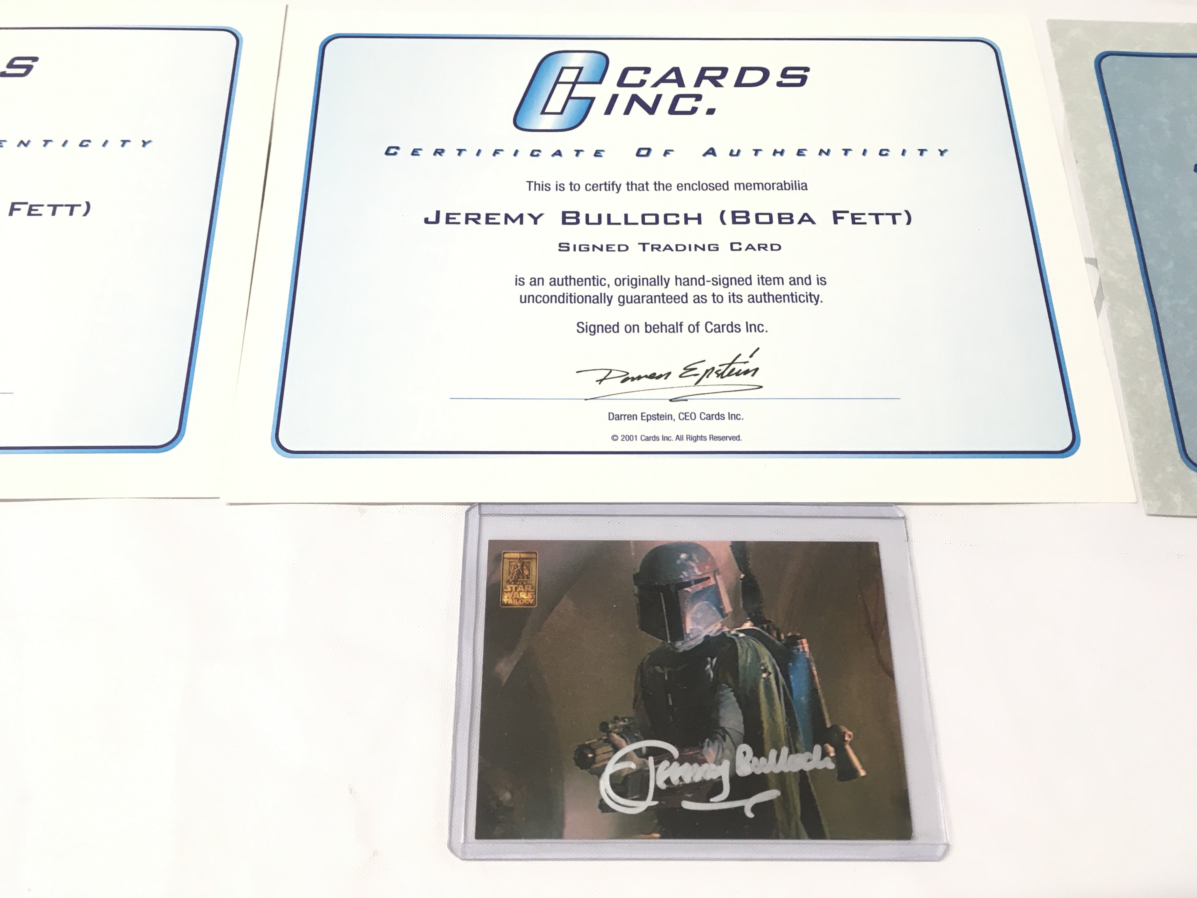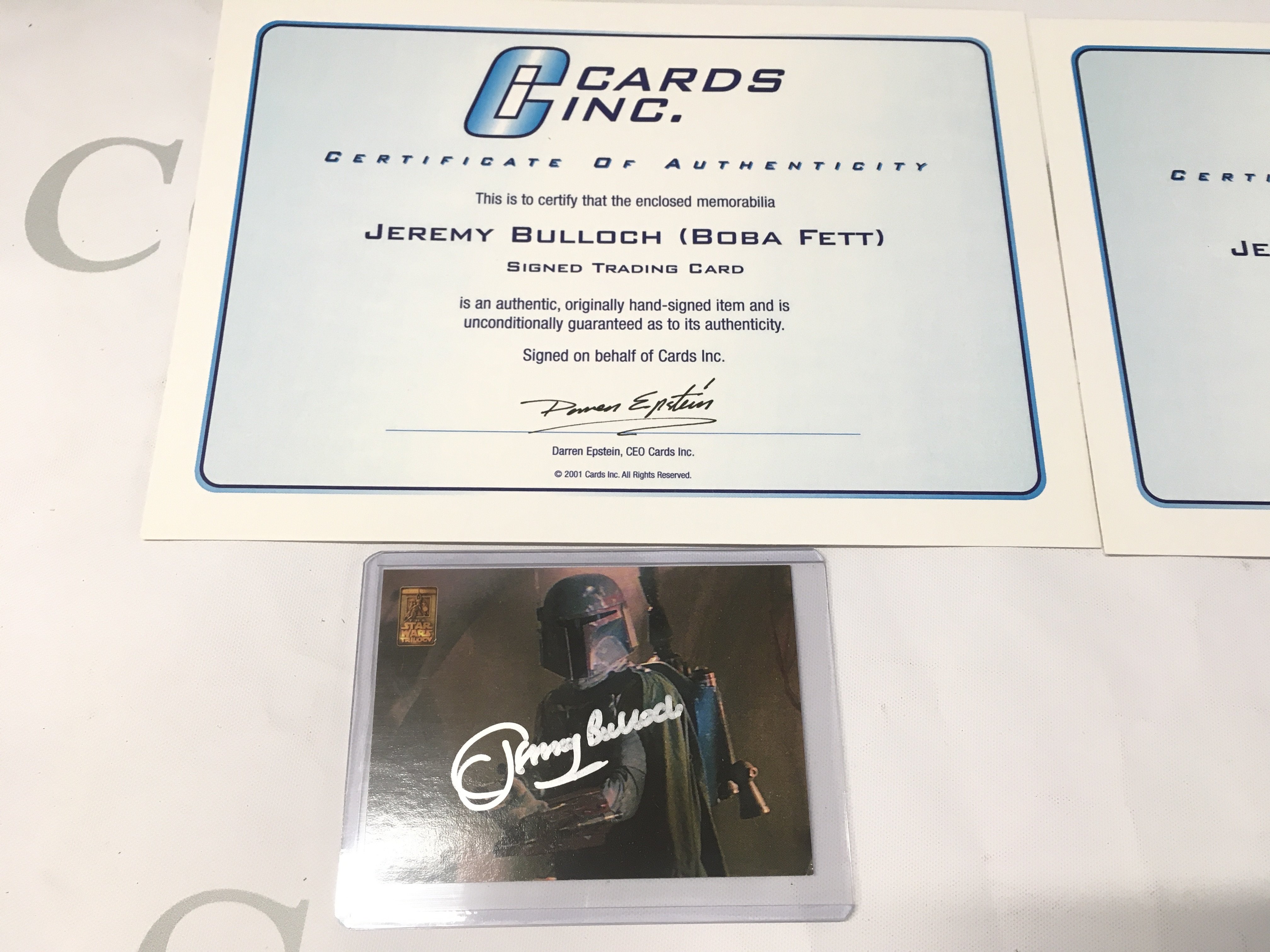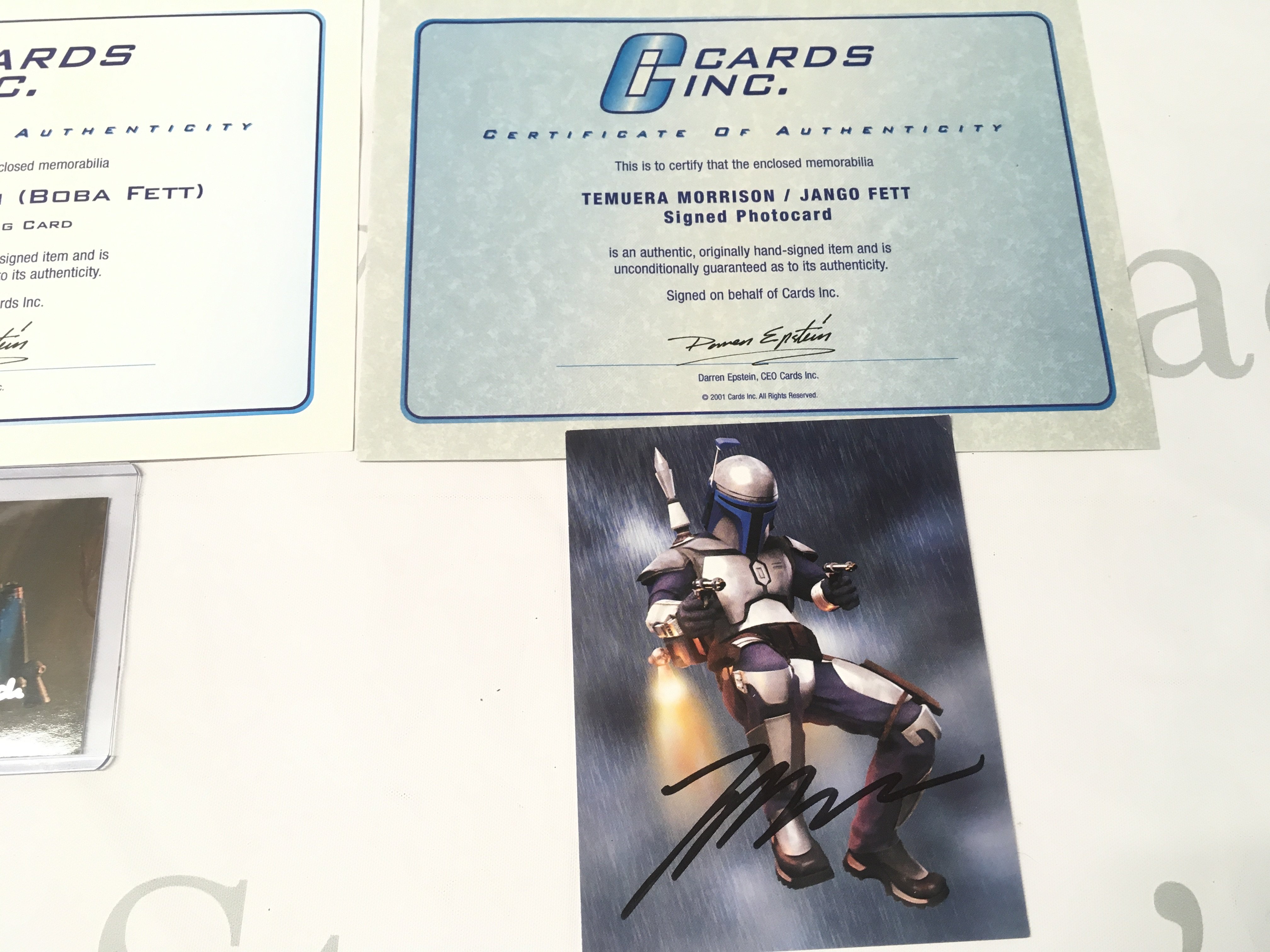 2X Signed Star Wars Jeremy Bulloch (Boba Fett) Merlin Trading Cards and a Temuera Morrison (Jango Fett) photo Card. With Certificates.