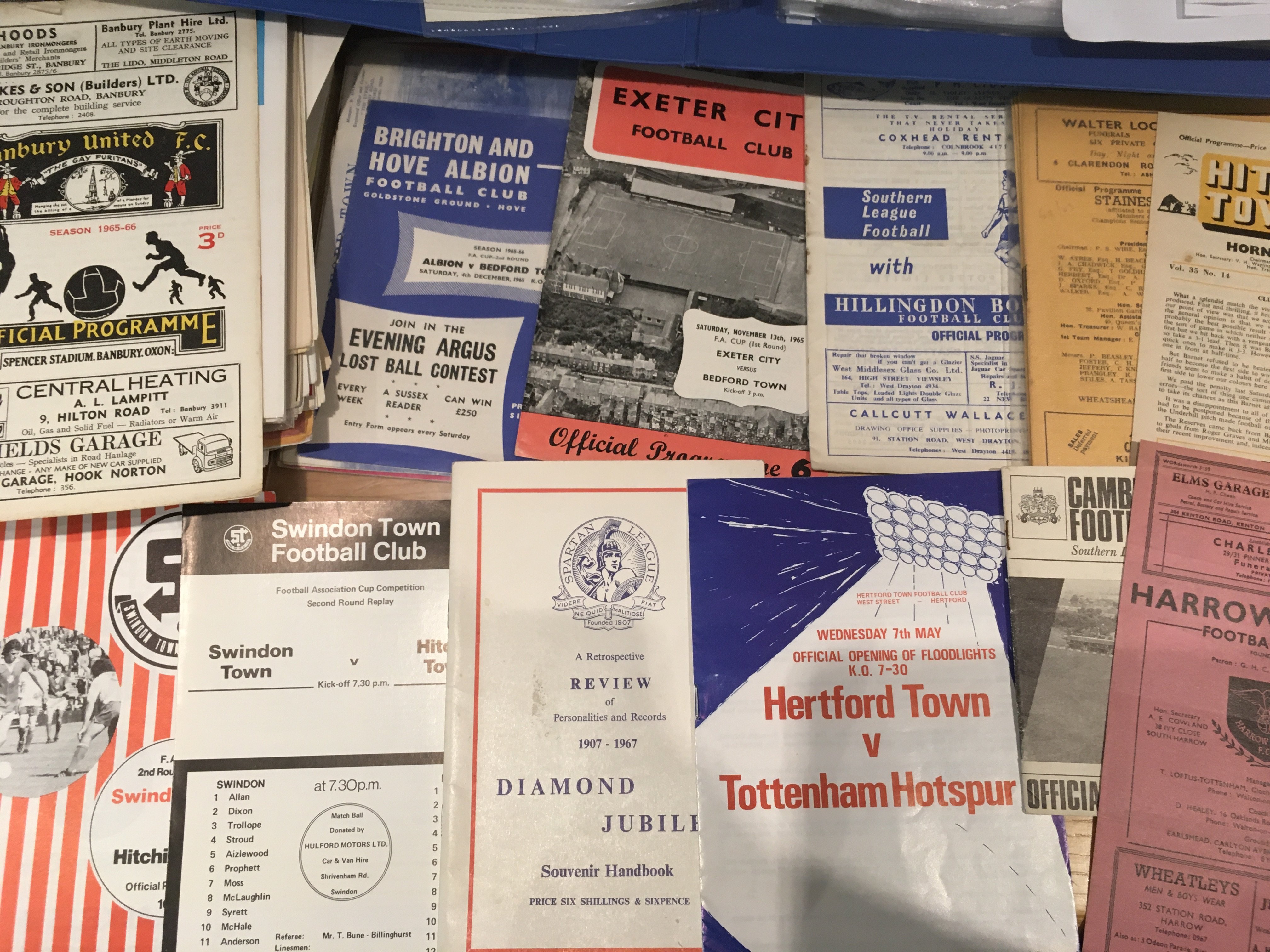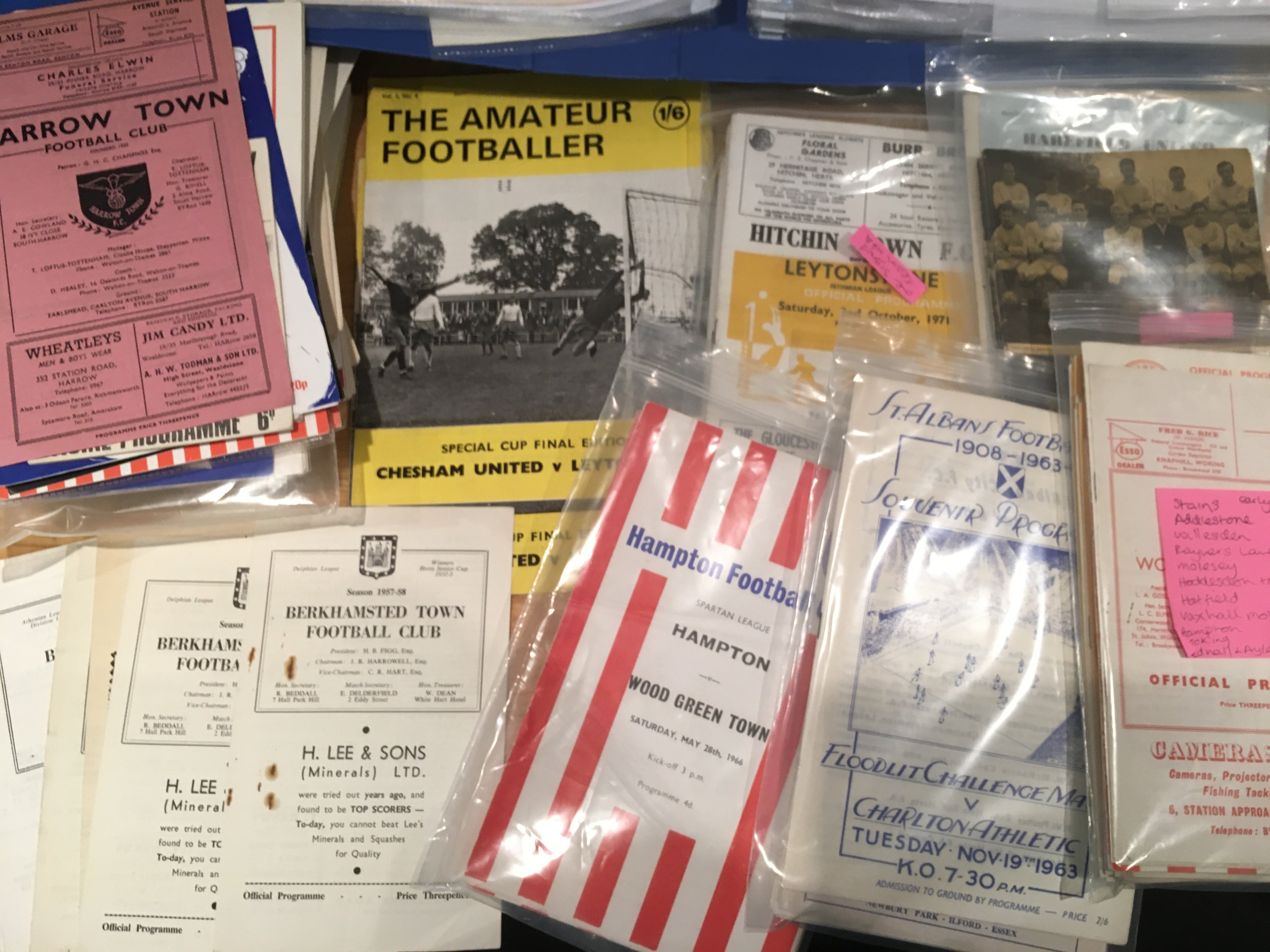 Non League Football Programmes: Must view private collection in excellent condition the majority 60s but some earlier and later. Packets of homes for St Albans, Woking, Banstead, Hampton, Berkhamsted 50s, Boreham Wood, Hitchin including 62/63 Arsenal, Chesham, Chalfont St Peter including 60/61 v Arsenal, Wood Green, Aylesbury, Barnet, Bedford and lots more.There is a selection of League v Non League in the FA Cup. With many 50s do not miss this. Many hundreds.