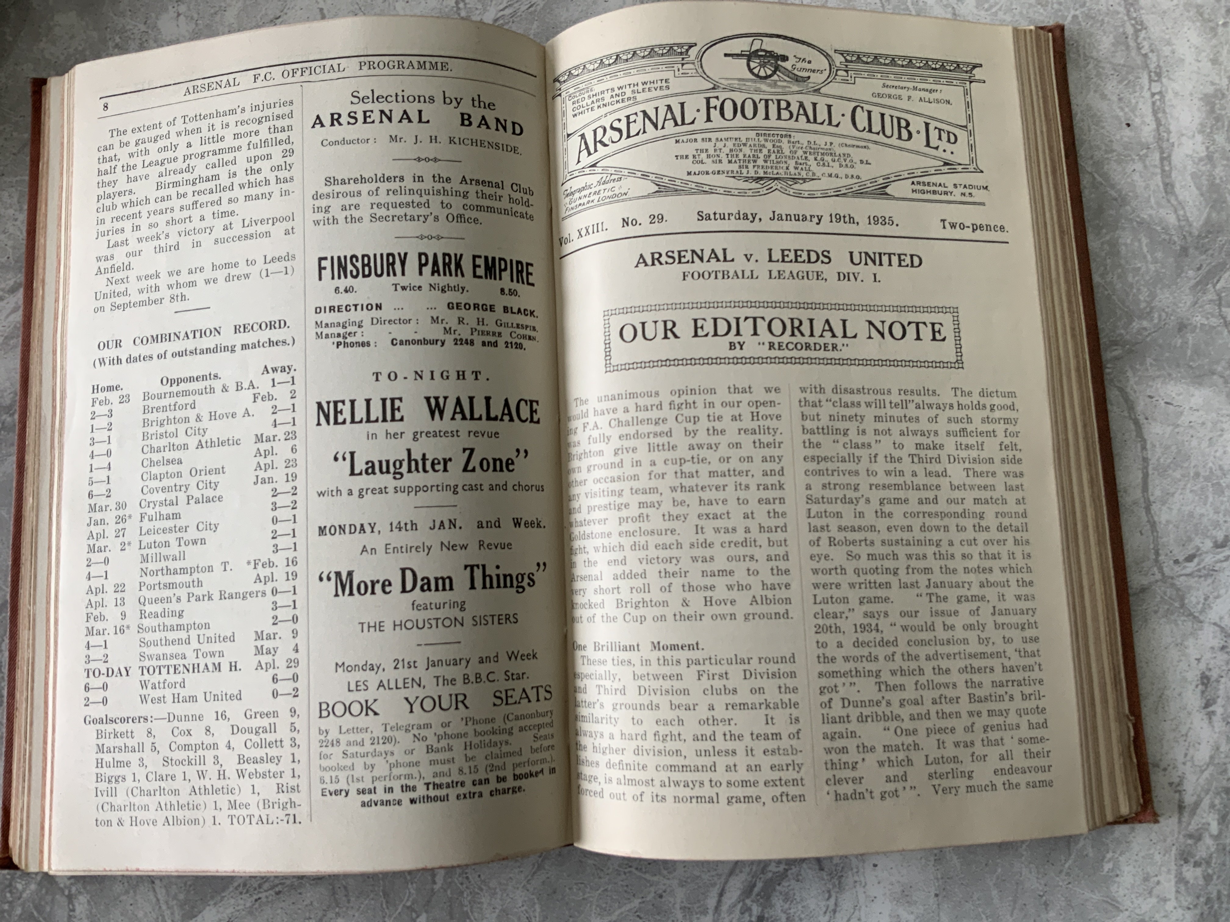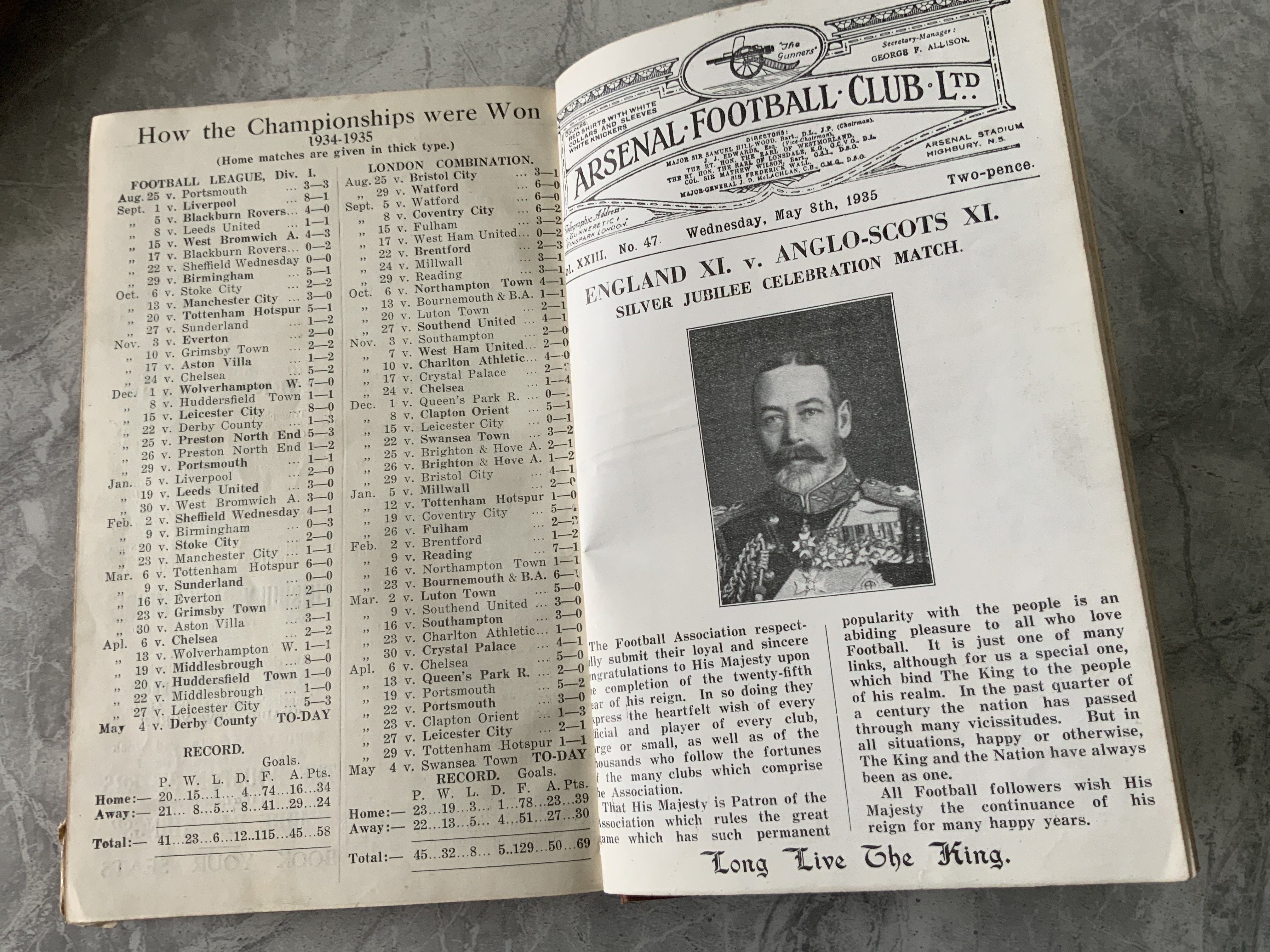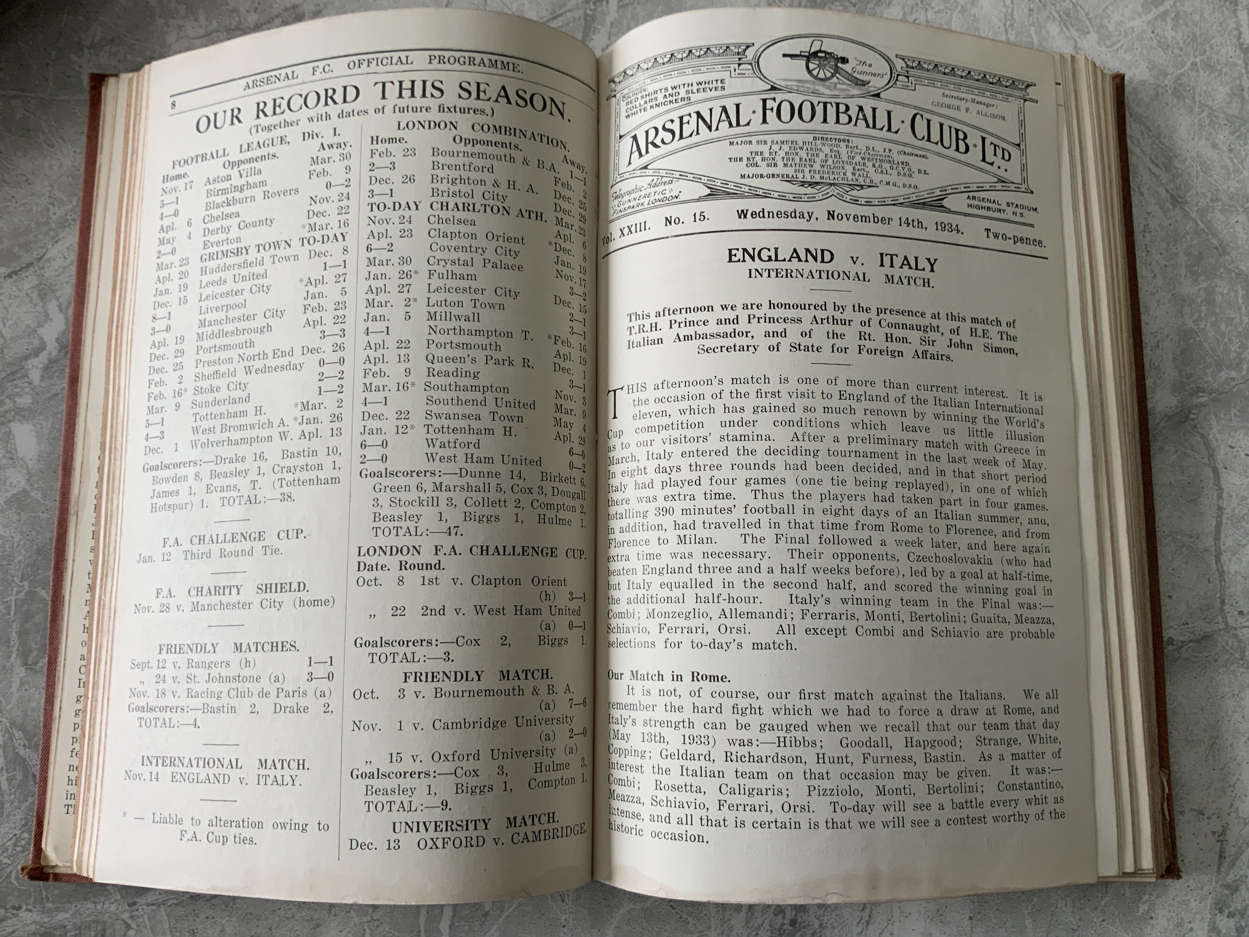 Arsenal 34/35 Bound Volume Of Football Programmes: Complete of all first team and reserves without covers. Additionally Arsenal v Rangers, England X1 v Anglo Scots X1, England v Italy and Oxford v Cambridge. Boards a bid faded with spine stating Programmes 1934/35. Programmes excellent. Arsenal won the championship this season.