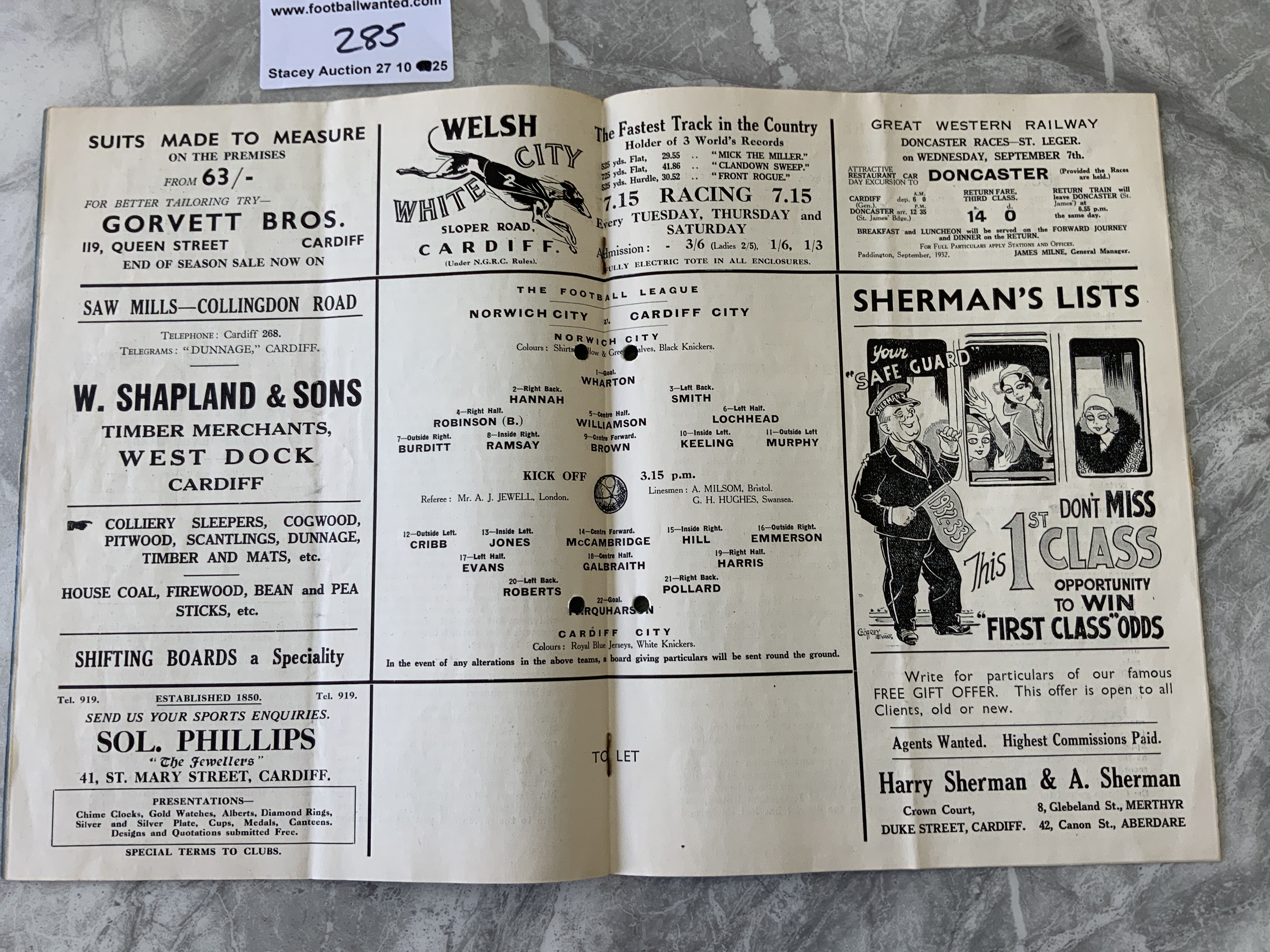 32/33 Cardiff City v Norwich City Football Programme: Excellent condition except for two punch holes. No team changes.