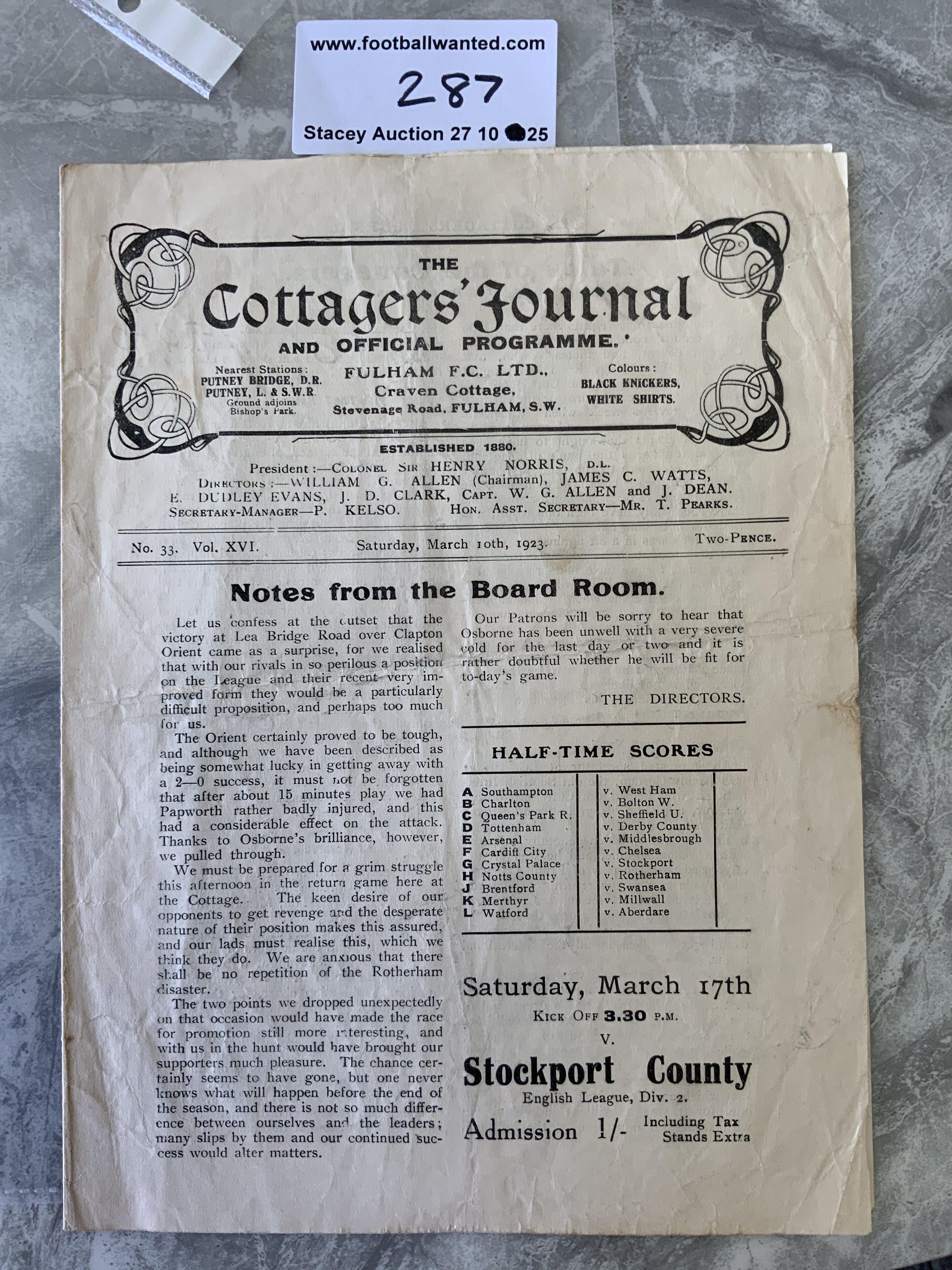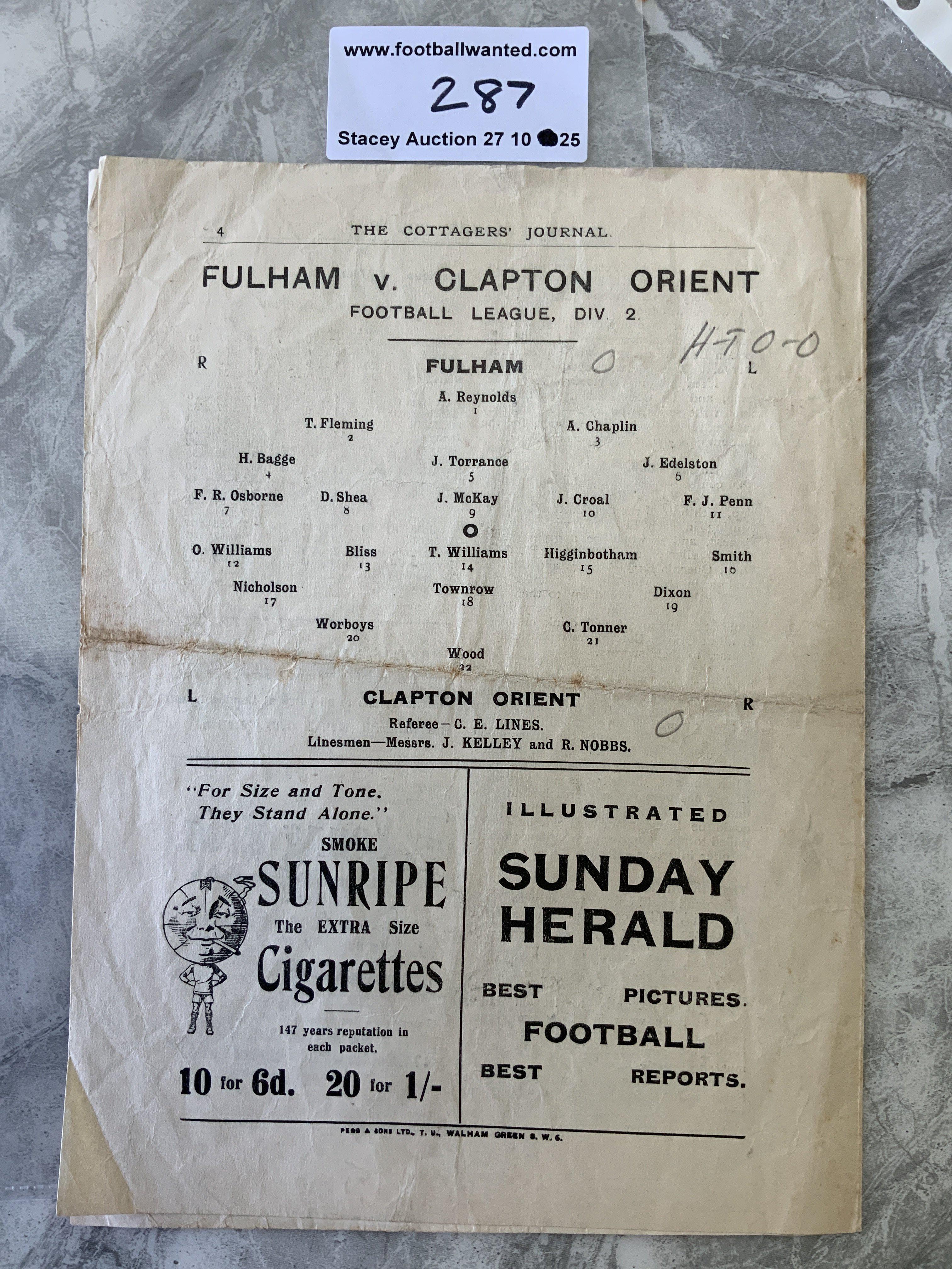 1922 - 1923 Fulham v Orient Football Programme: Excellent condition division two programme with no team changes. Fold and pencilled score.