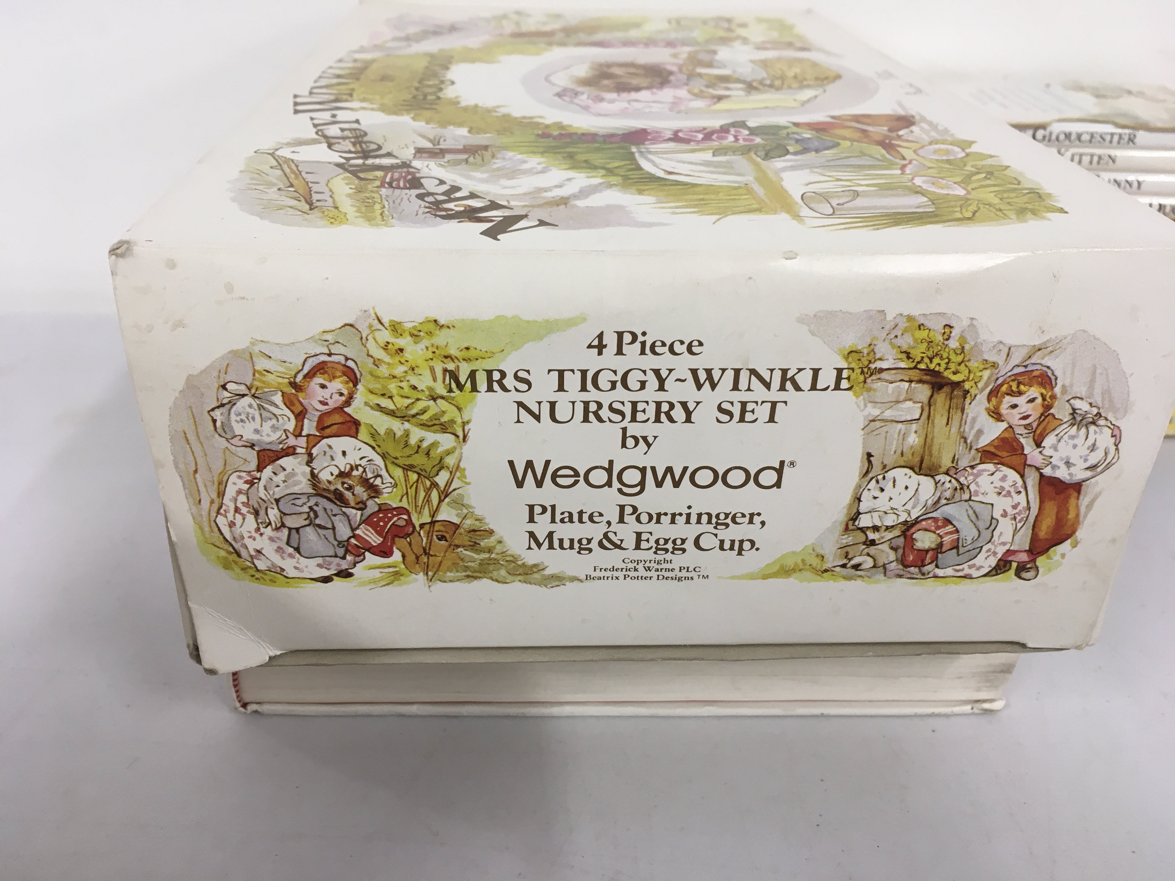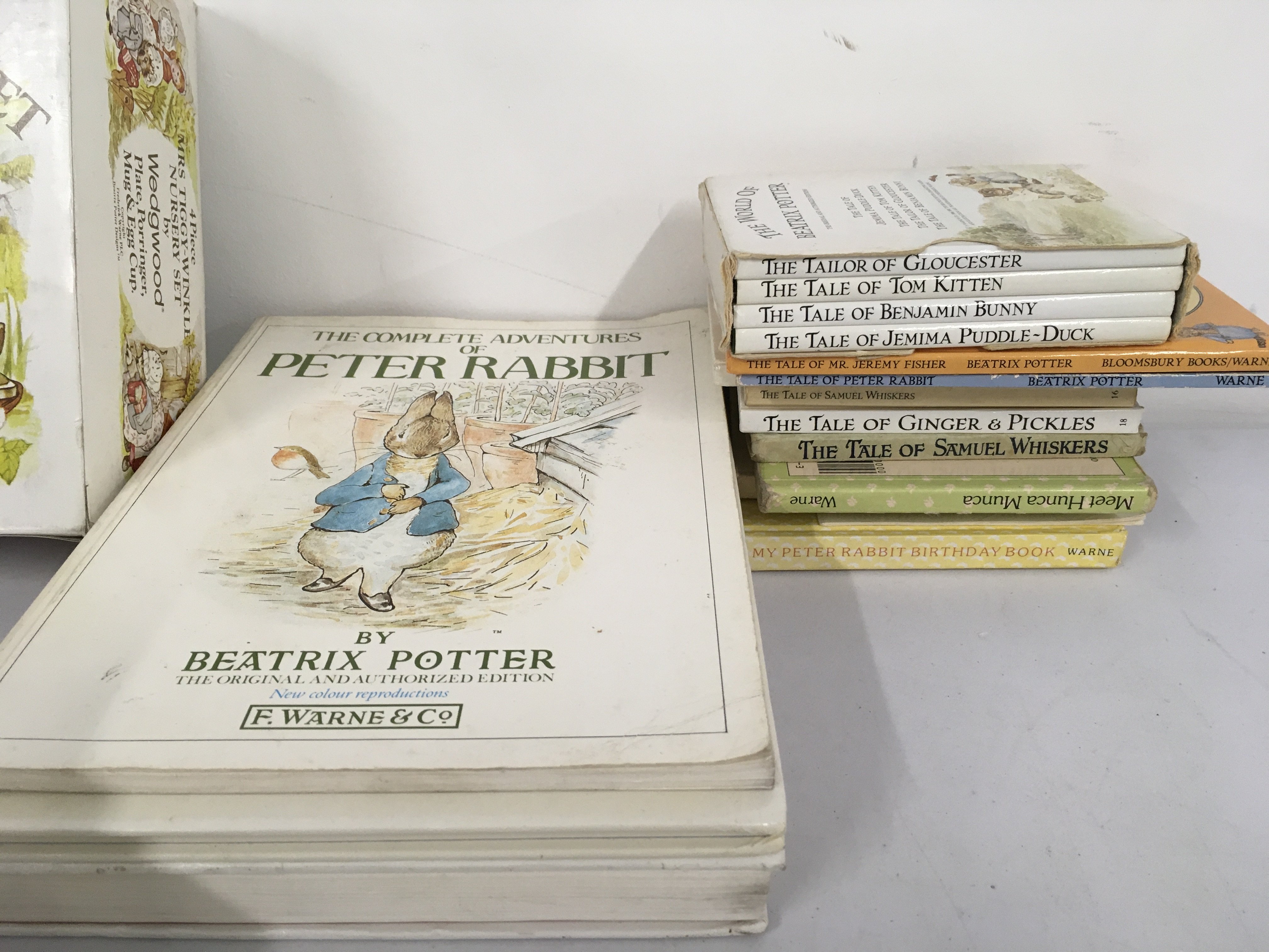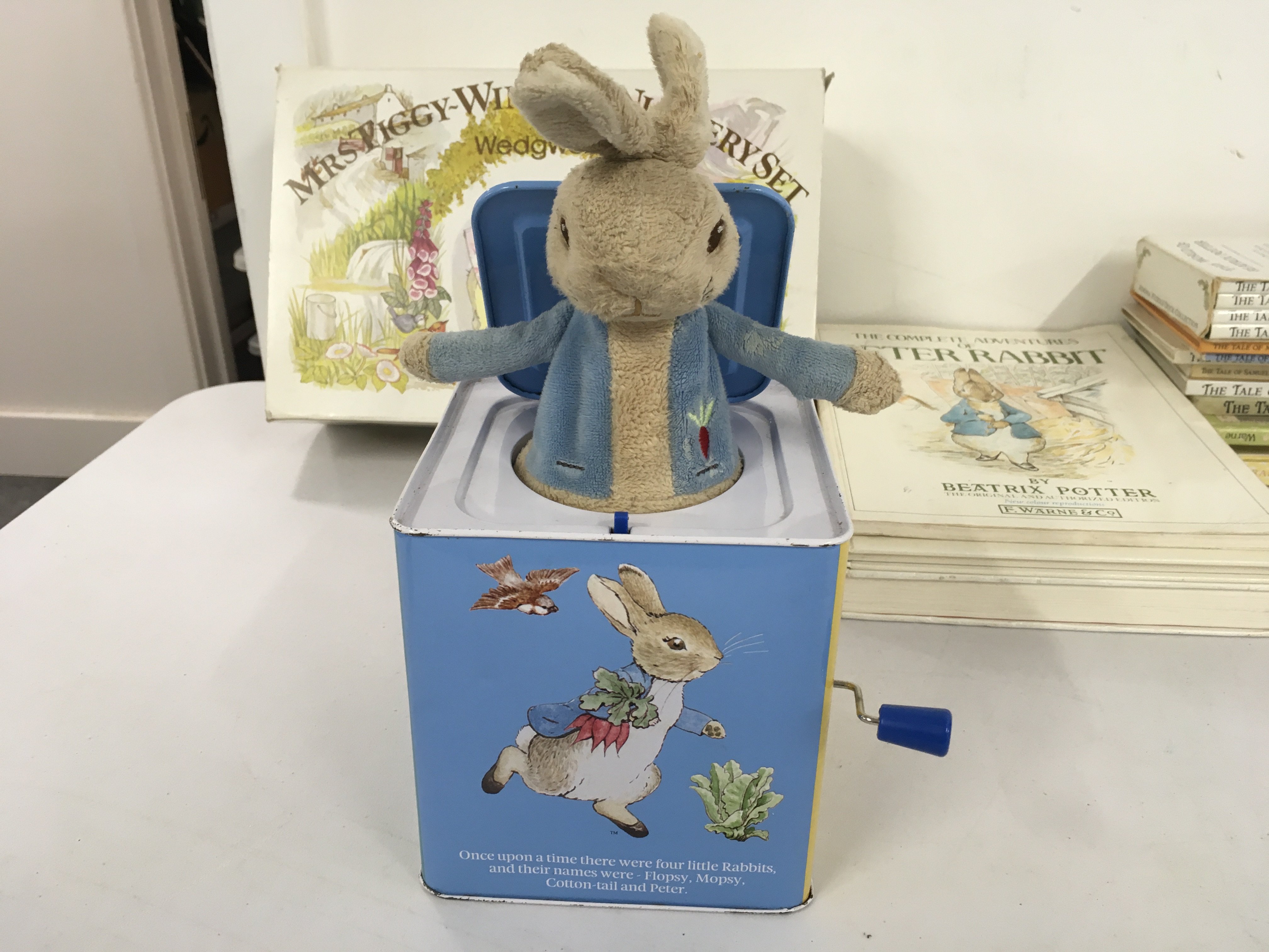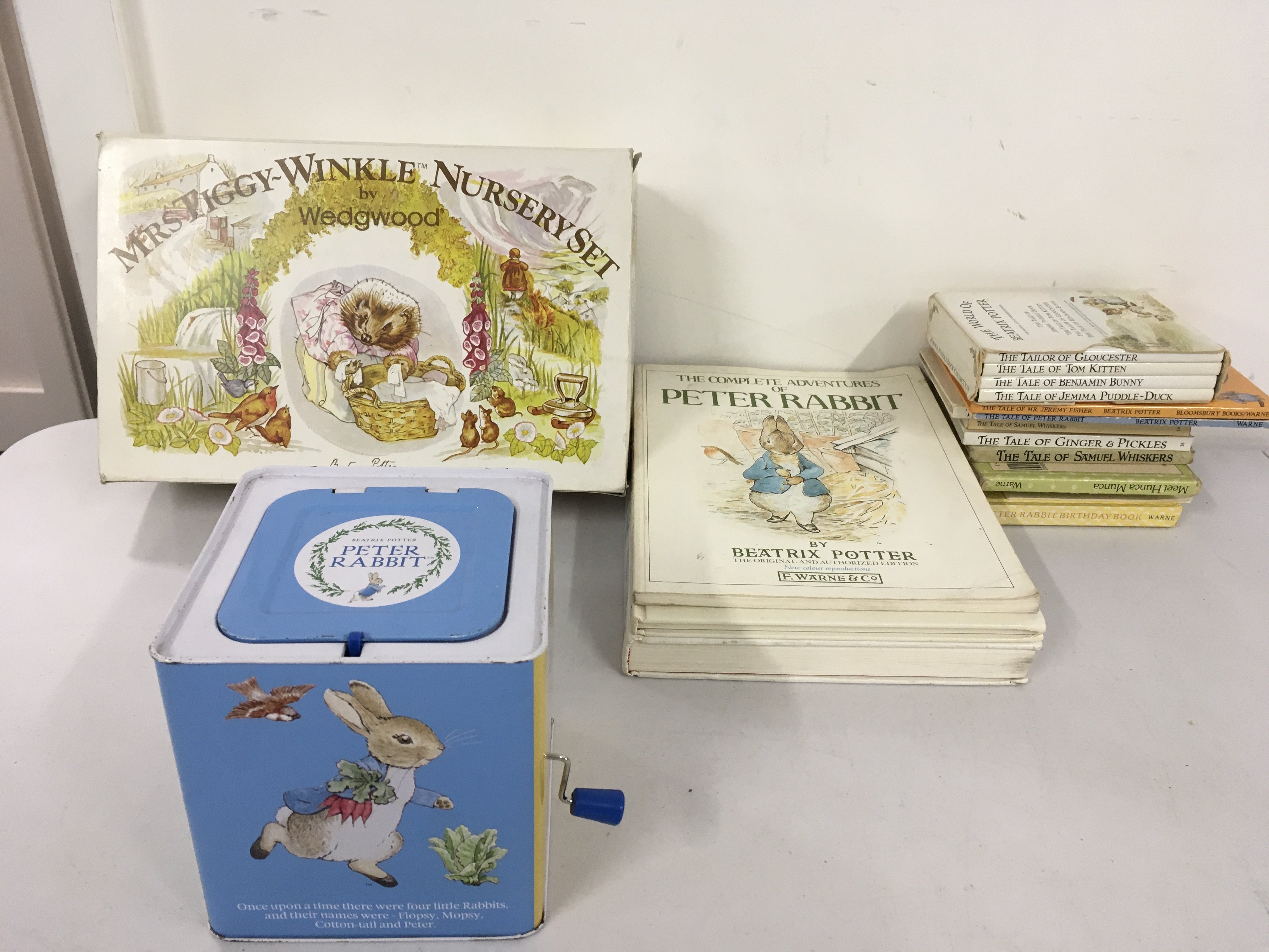A collection of Peter Rabbit books together with jack in the box and a Mrs Tiggy Winkle breakfast set. No reserve.