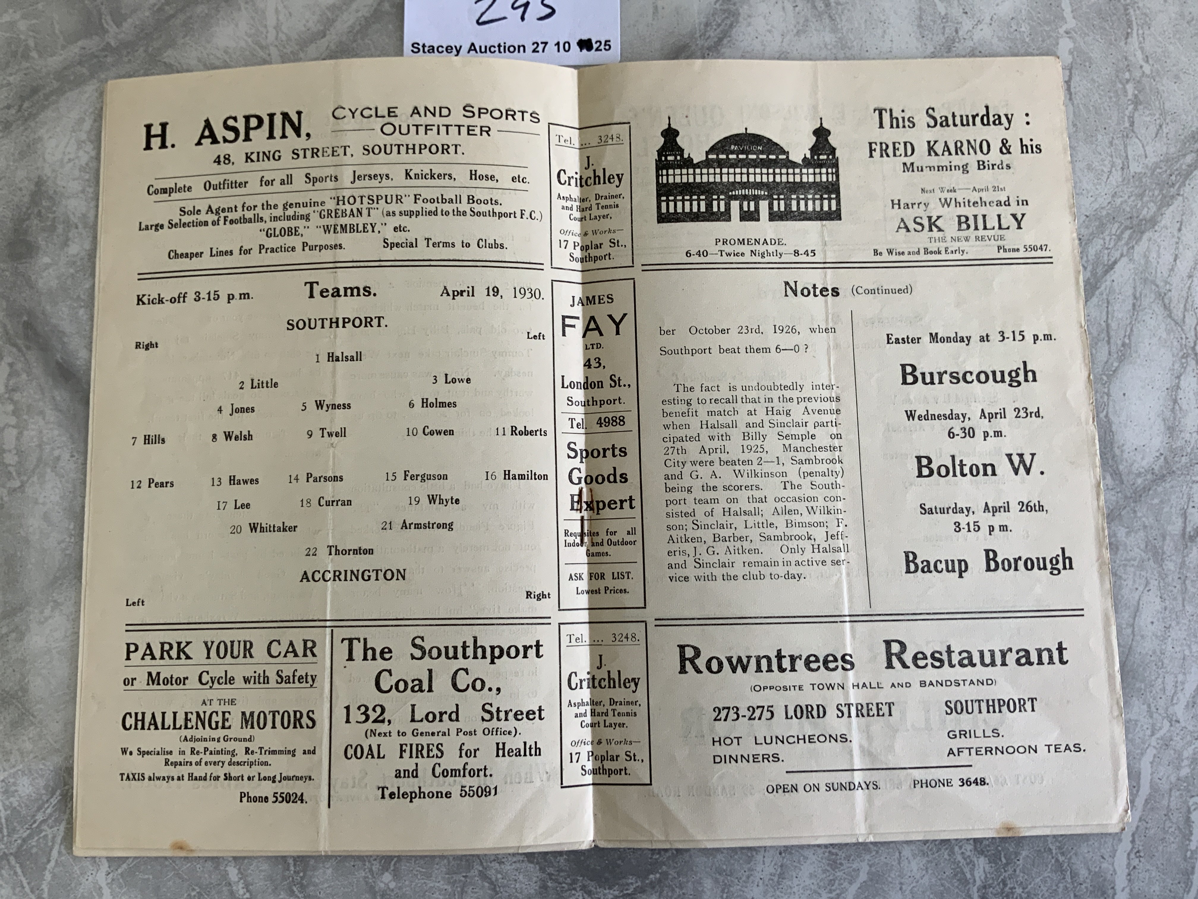 29/30 Southport v Accrington Stanley Football Programme: Good condition league programme with no team changes.Fold.