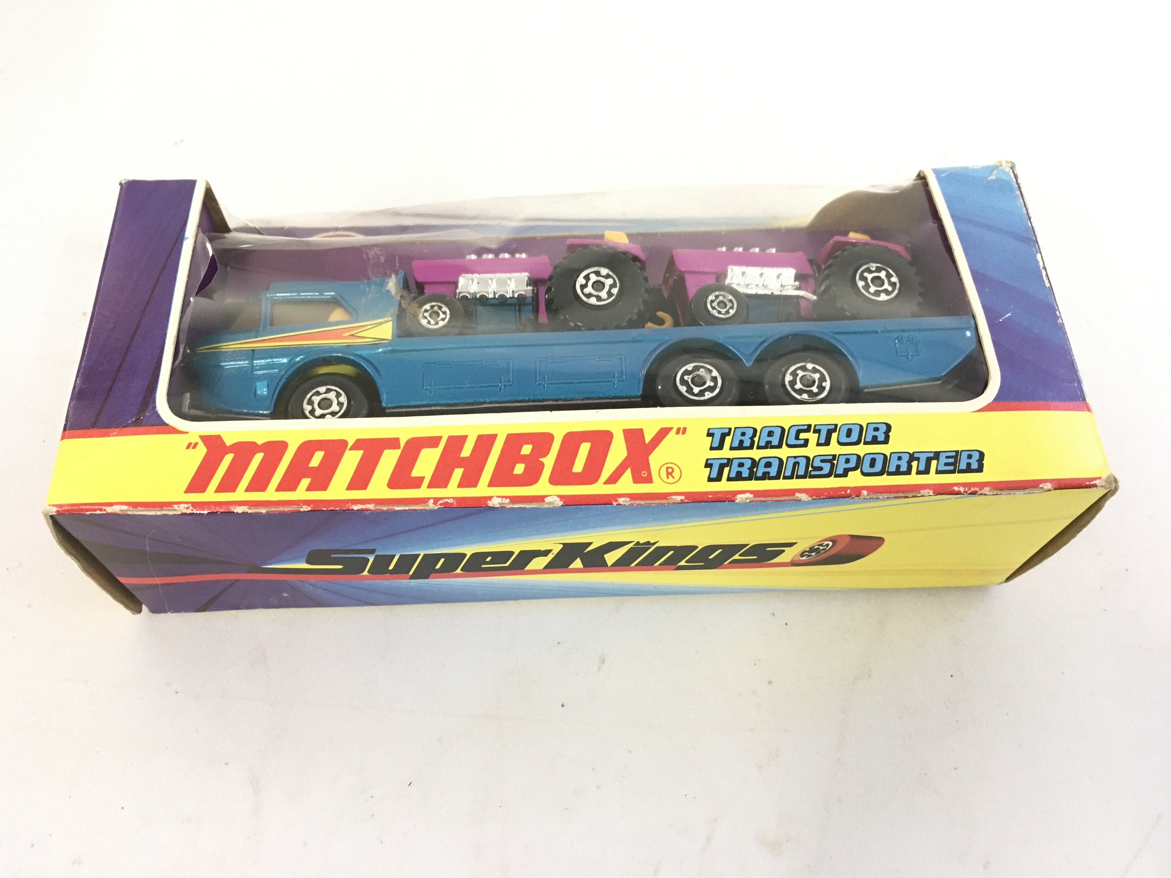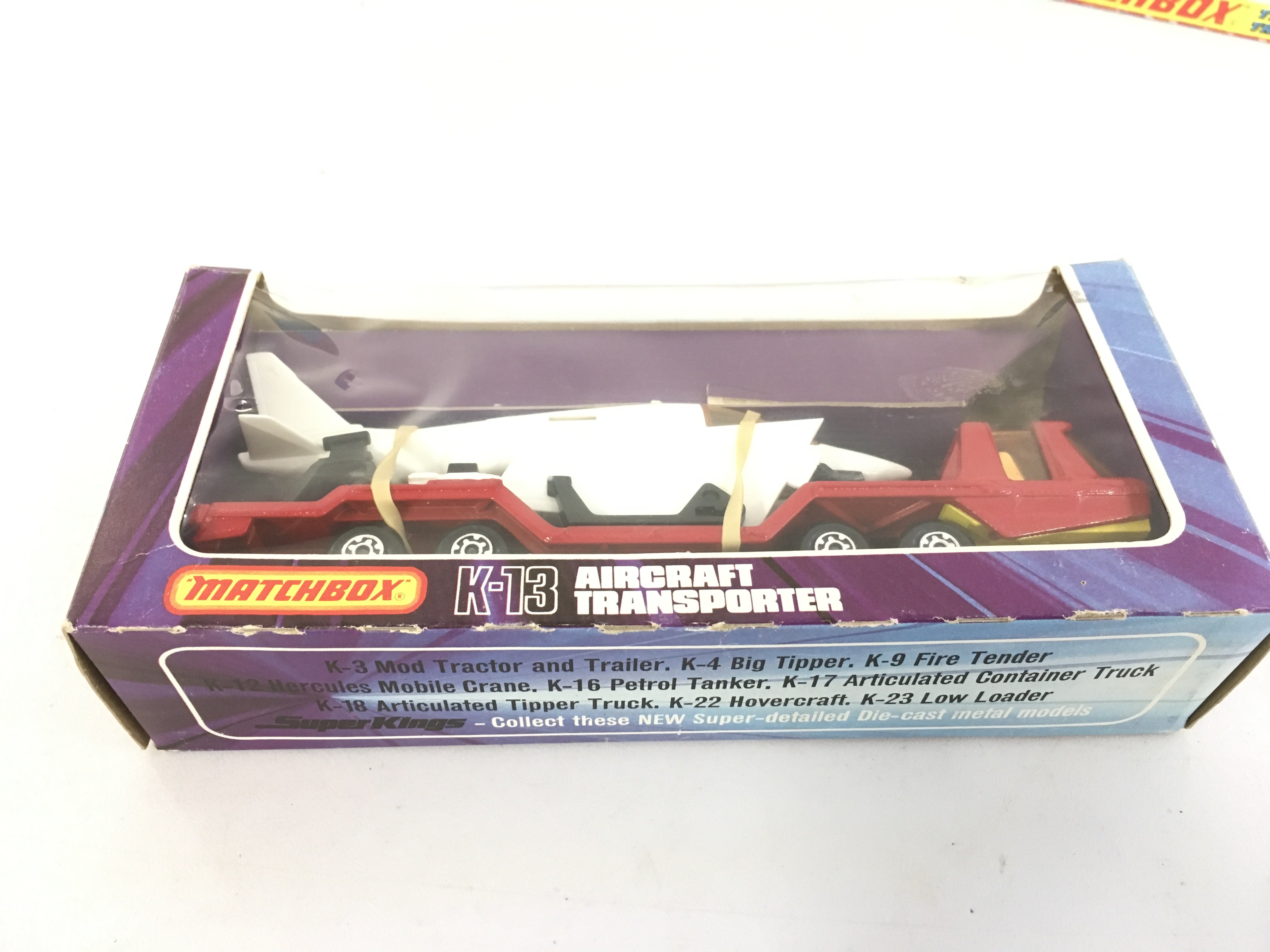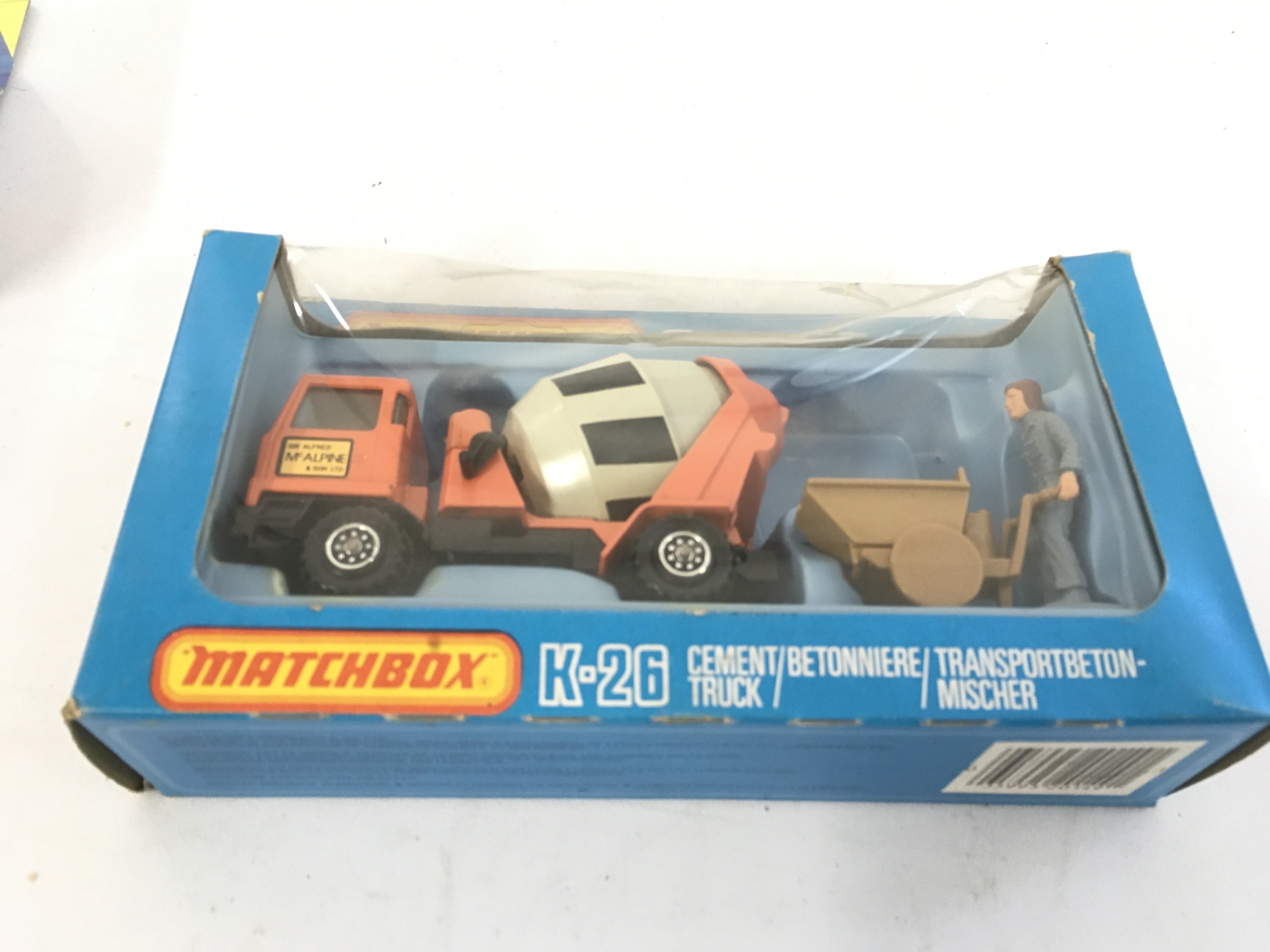 3 boxed Matchbox Superkings no. K13 aircraft transporter..K21 tractor transporter..K26 cement truck. No reserve