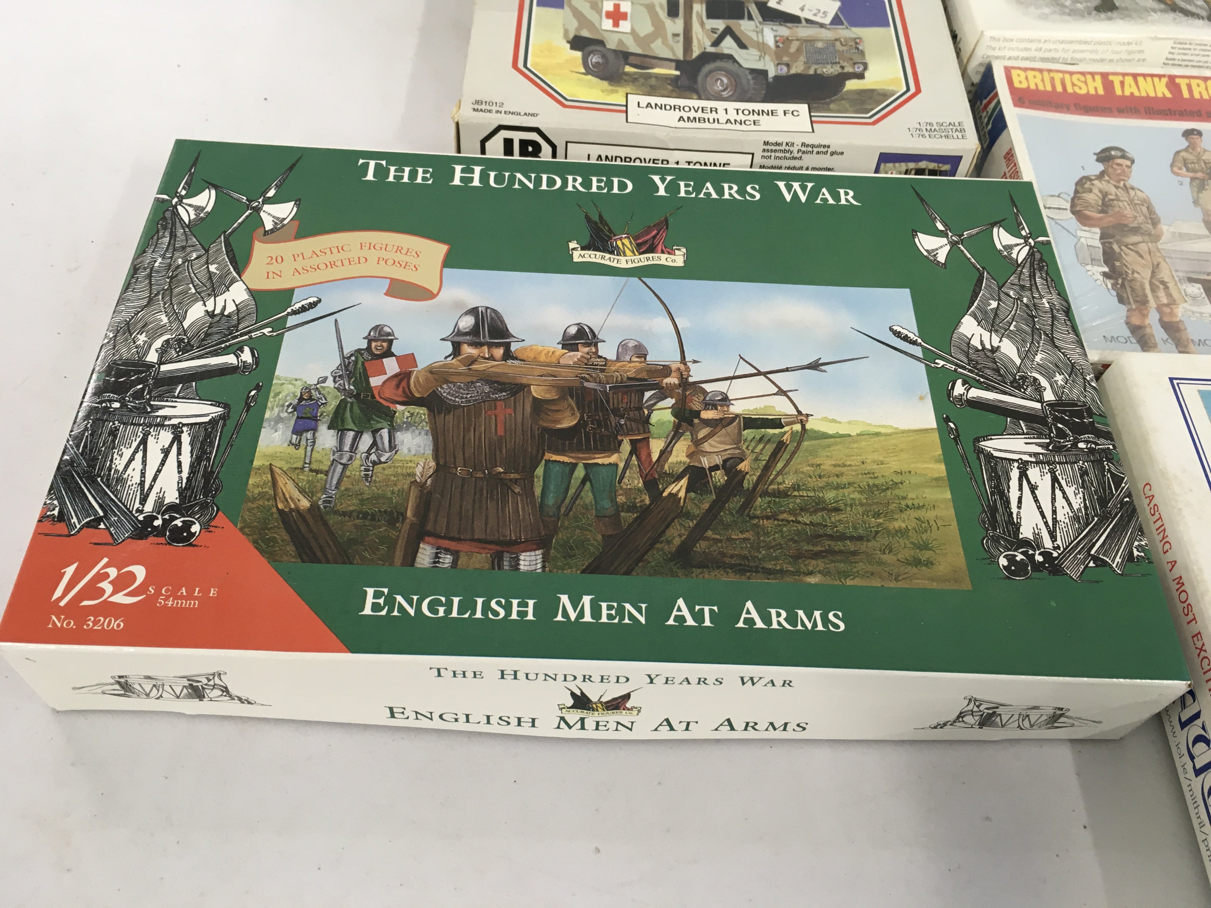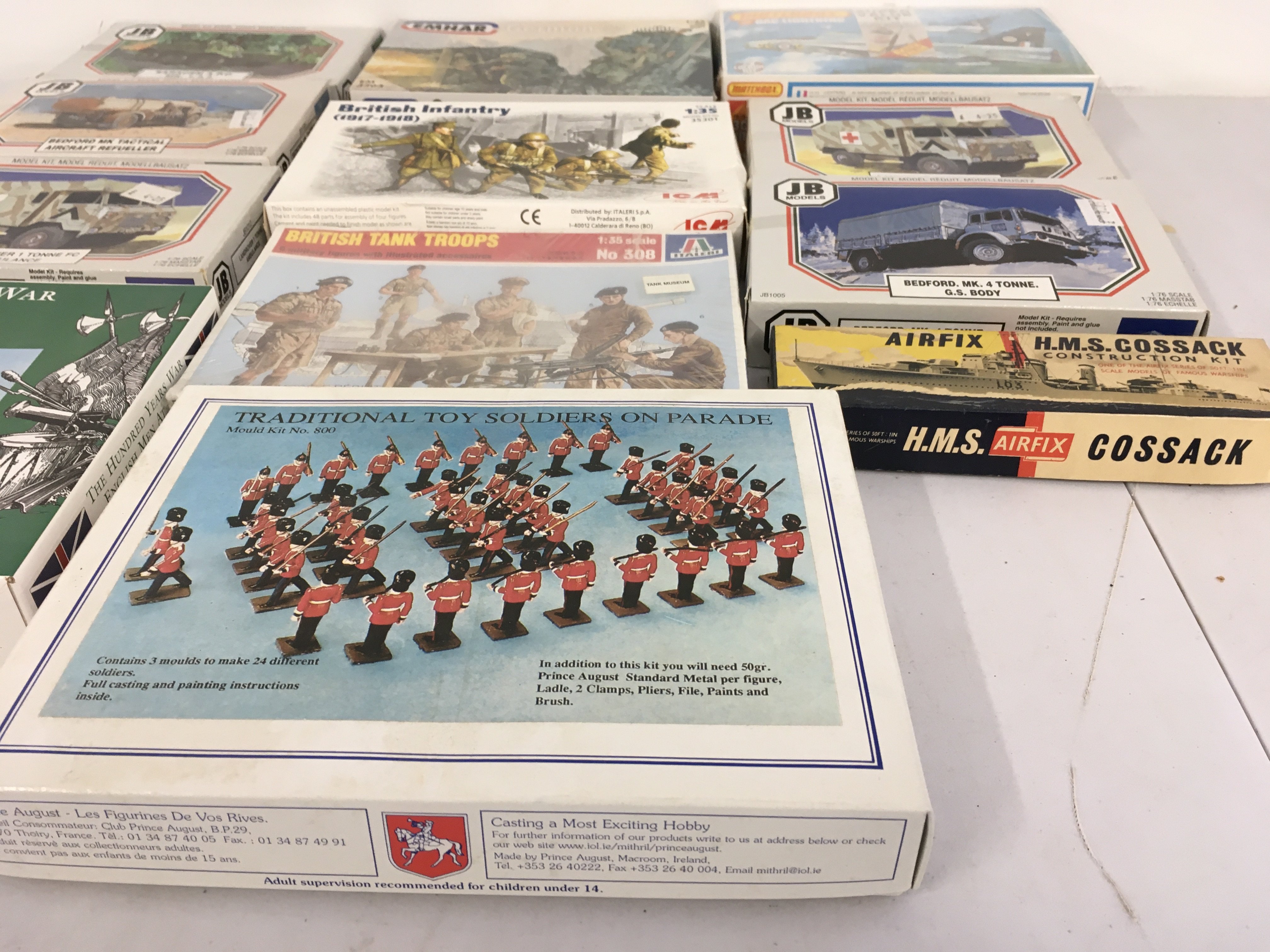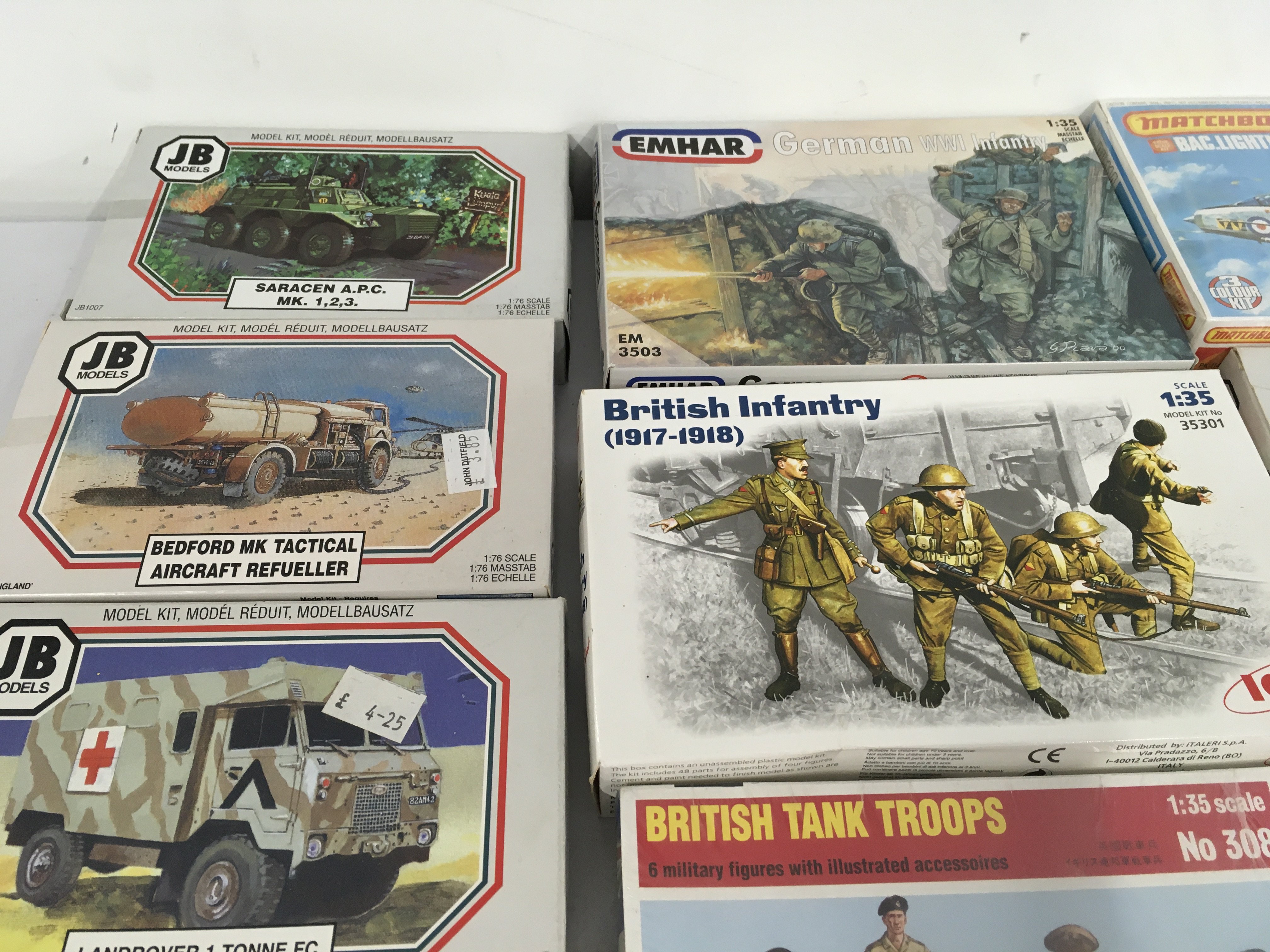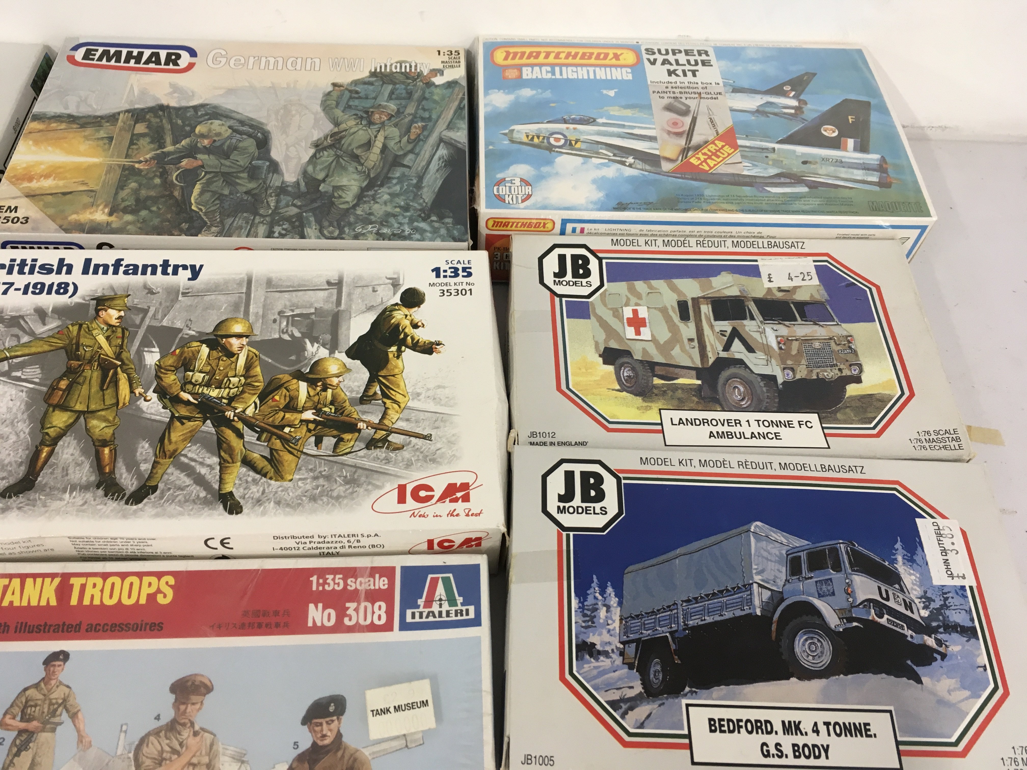 An assorted collection of military modelling kits featuring soldiers and vehicles by JB..Matchbox..Italeri etc. no reserve