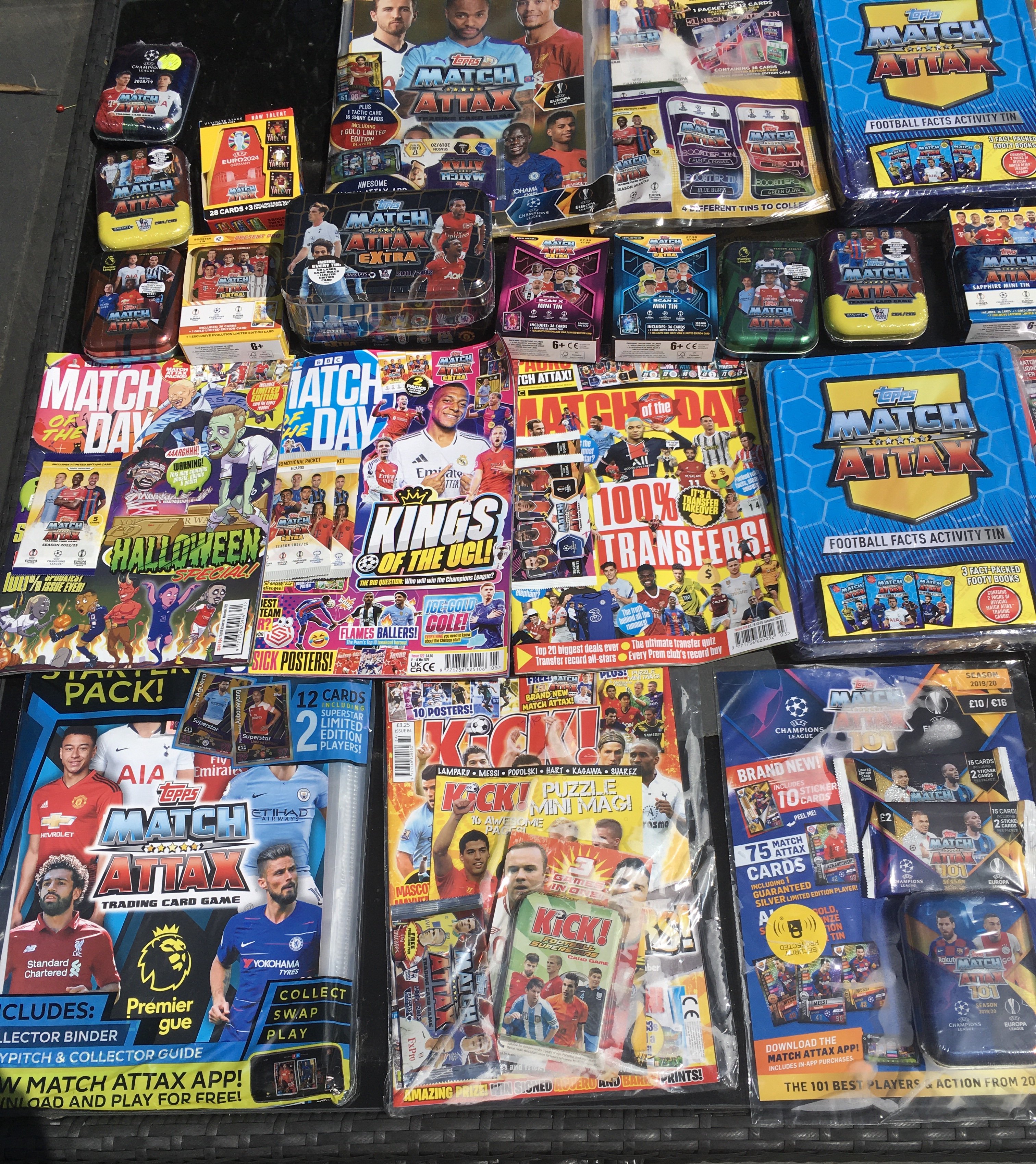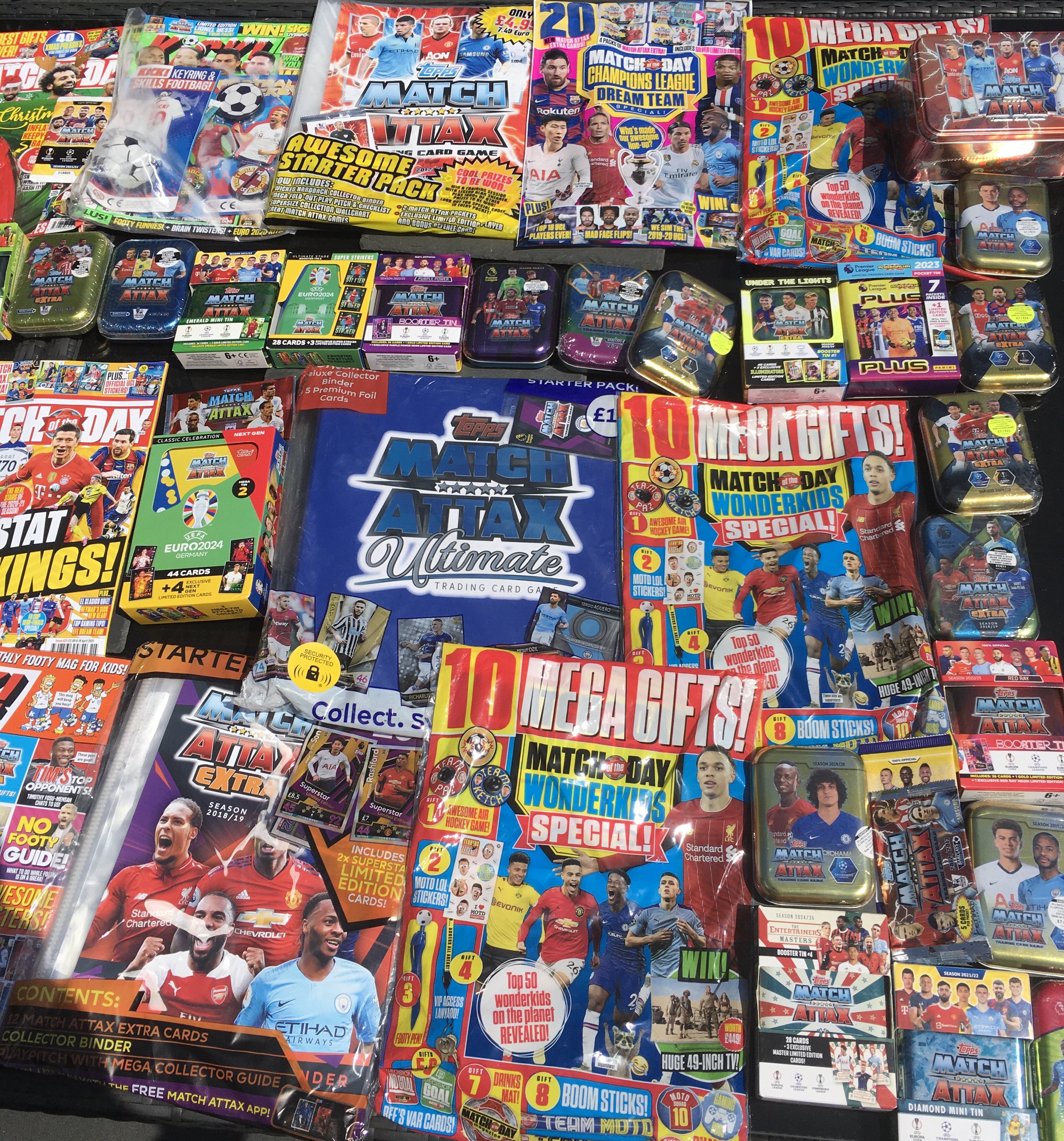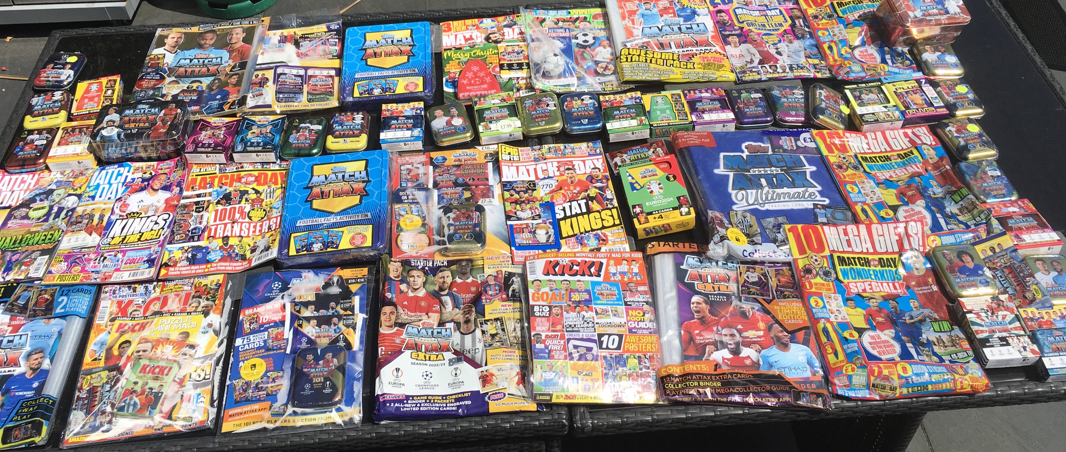 Match Attax Sealed Football Card Collection: Around 40 sealed metal tins or sealed packs housed in cardboard from a modern era with a minimum of 7 pounds paid each per pack. Numerous magazines with free packs to encourage collecting plus some sealed empty albums and packs. Very large quantity which must have cost nearly 500 pounds when new.
