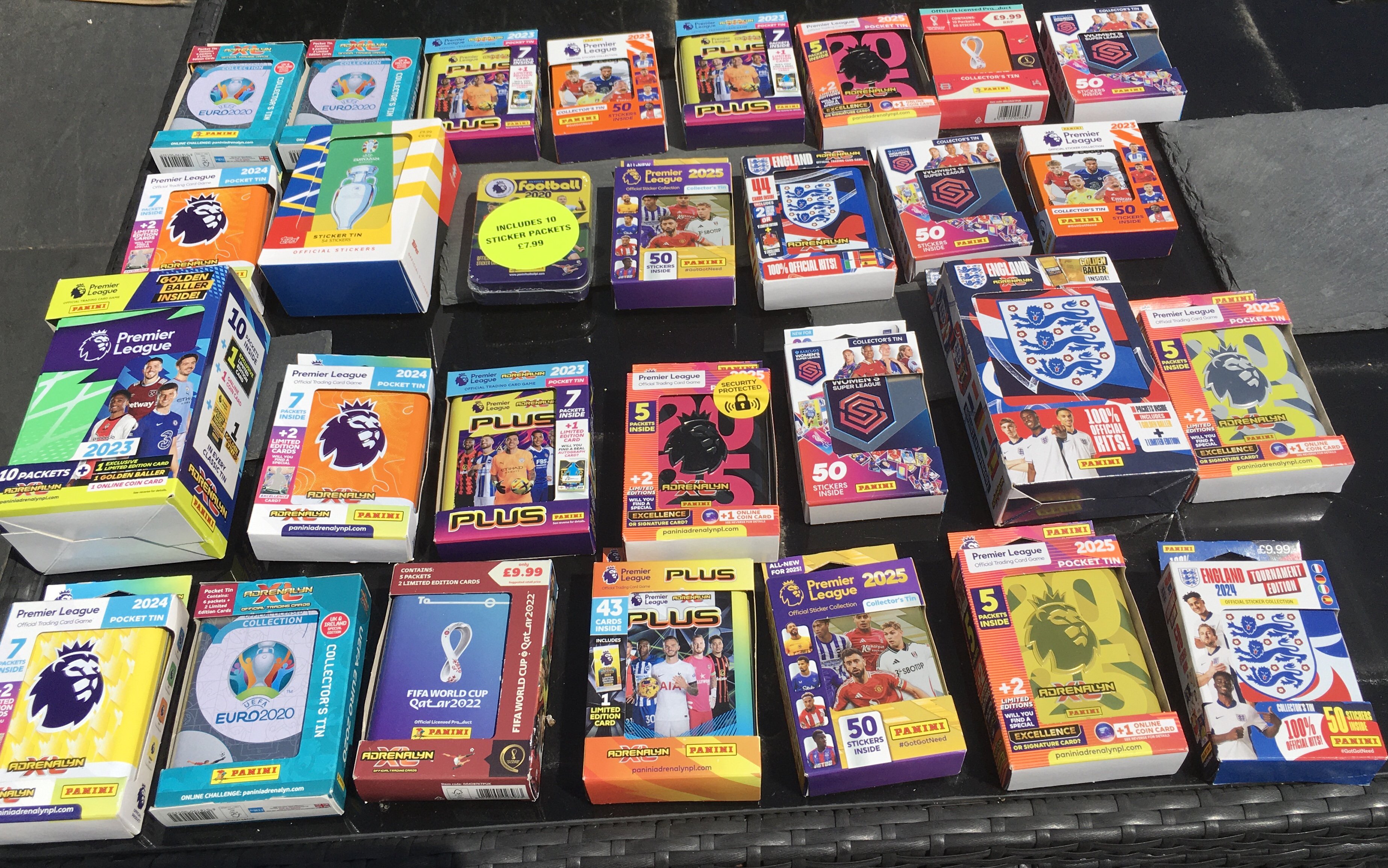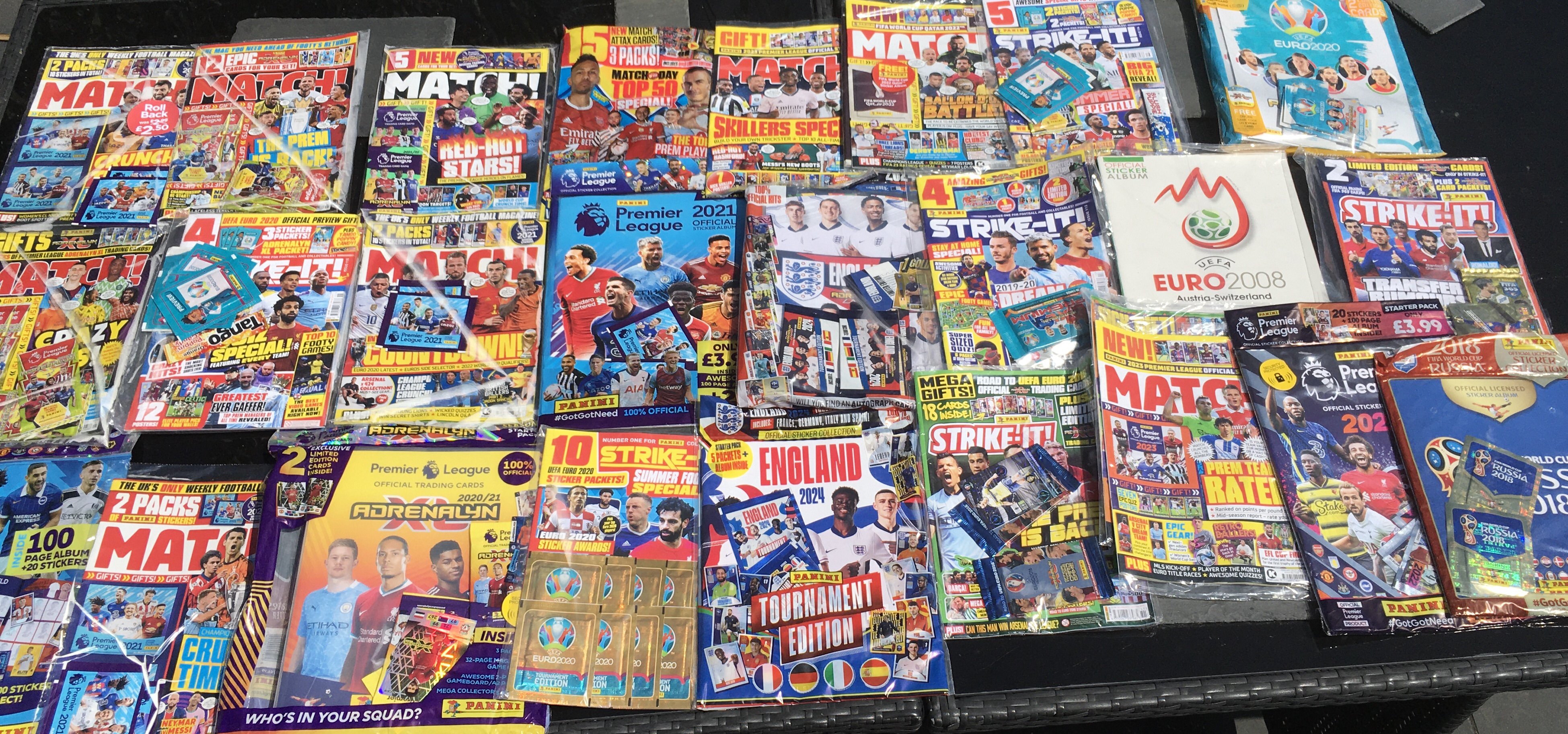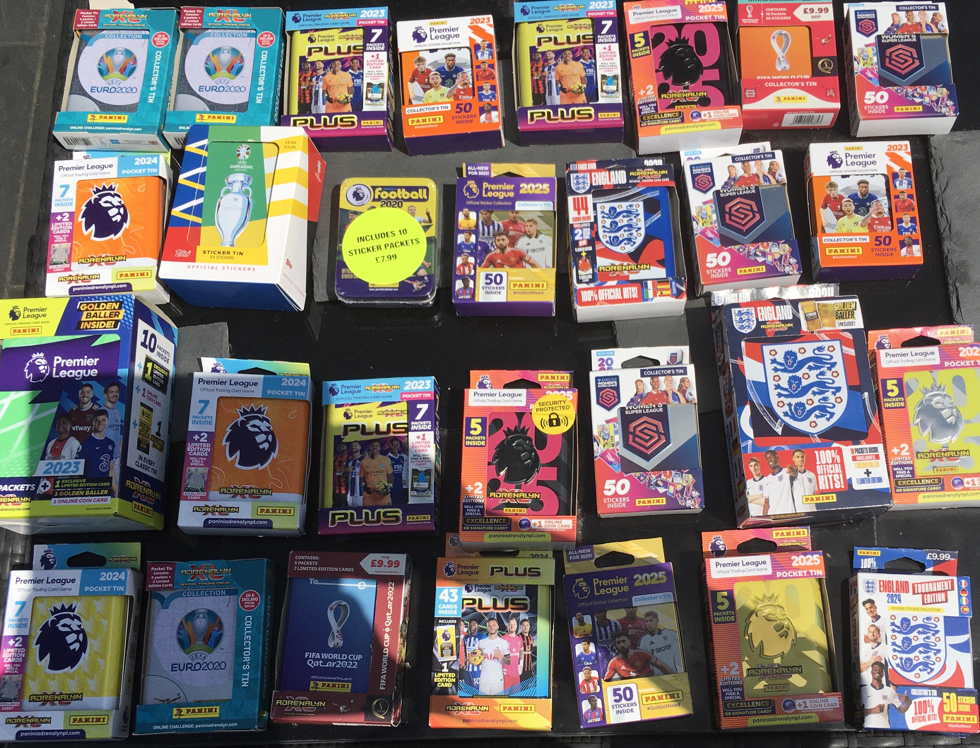 Panini Sealed Football Card Collection: Around 30 sealed metal tins or sealed packs housed in cardboard from a modern era with a minimum of 8 pounds paid each per pack. Numerous magazines with free packs to encourage collecting plus some sealed empty albums and packs. Very large quantity which must have cost around 400 pounds when new.