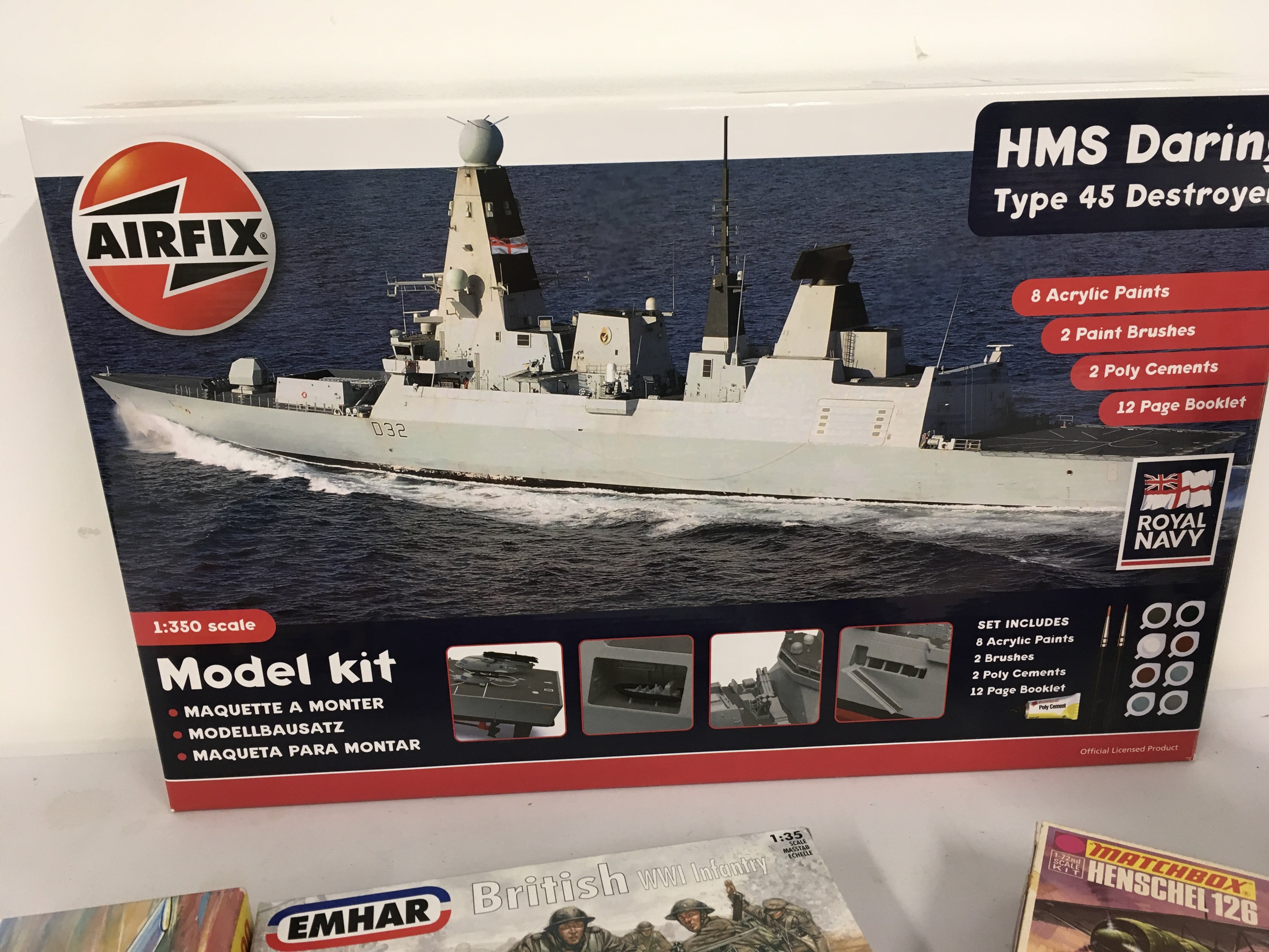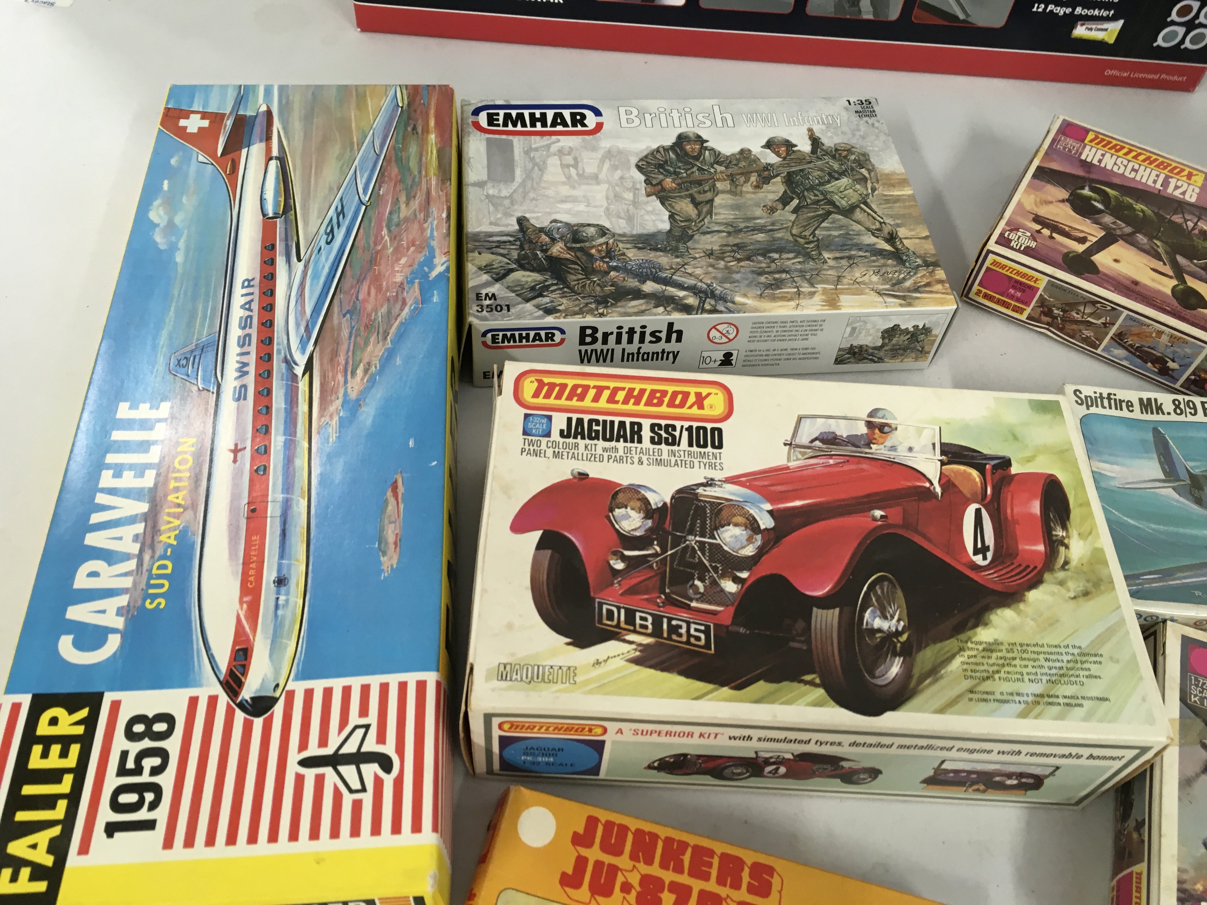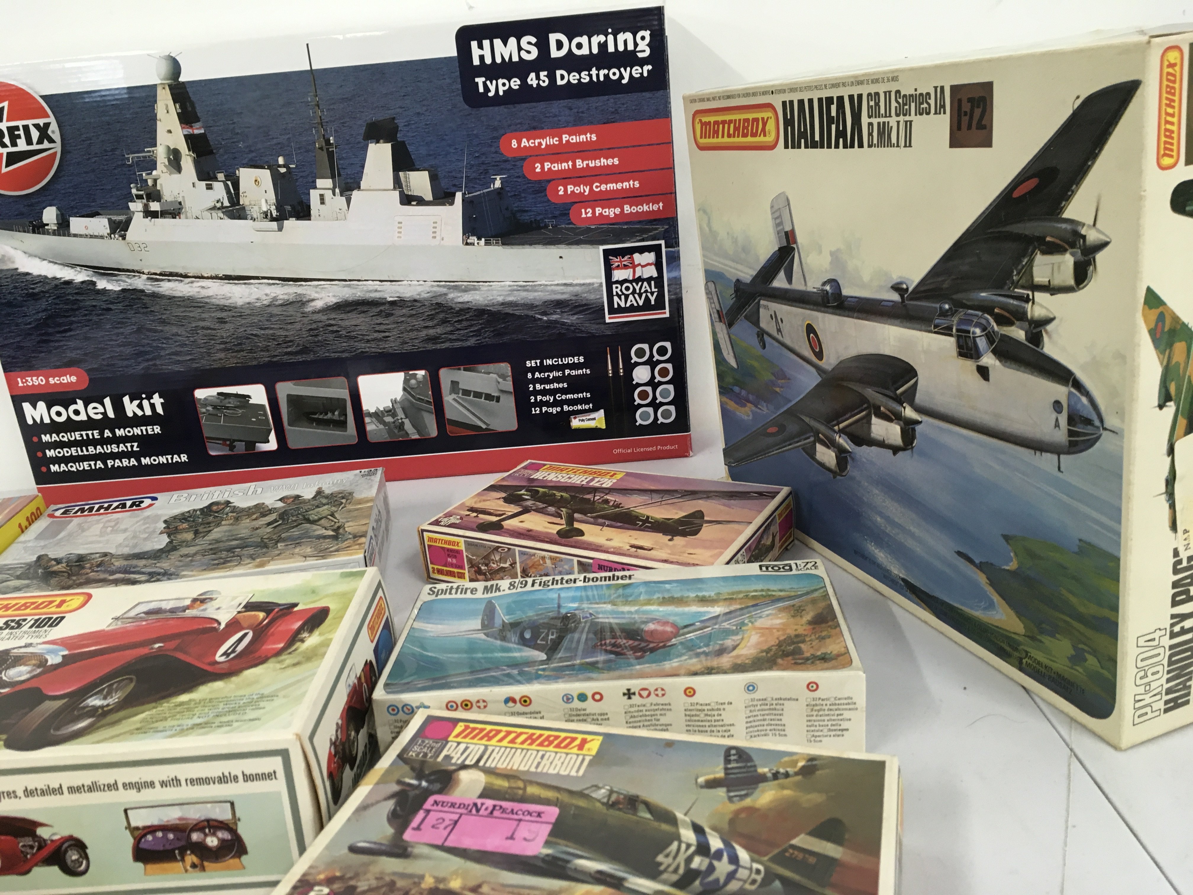 An assorted collection of model kits by Airfix..Matchbox..Faller etc. featuring aircraft, a warship and a car. No reserve.