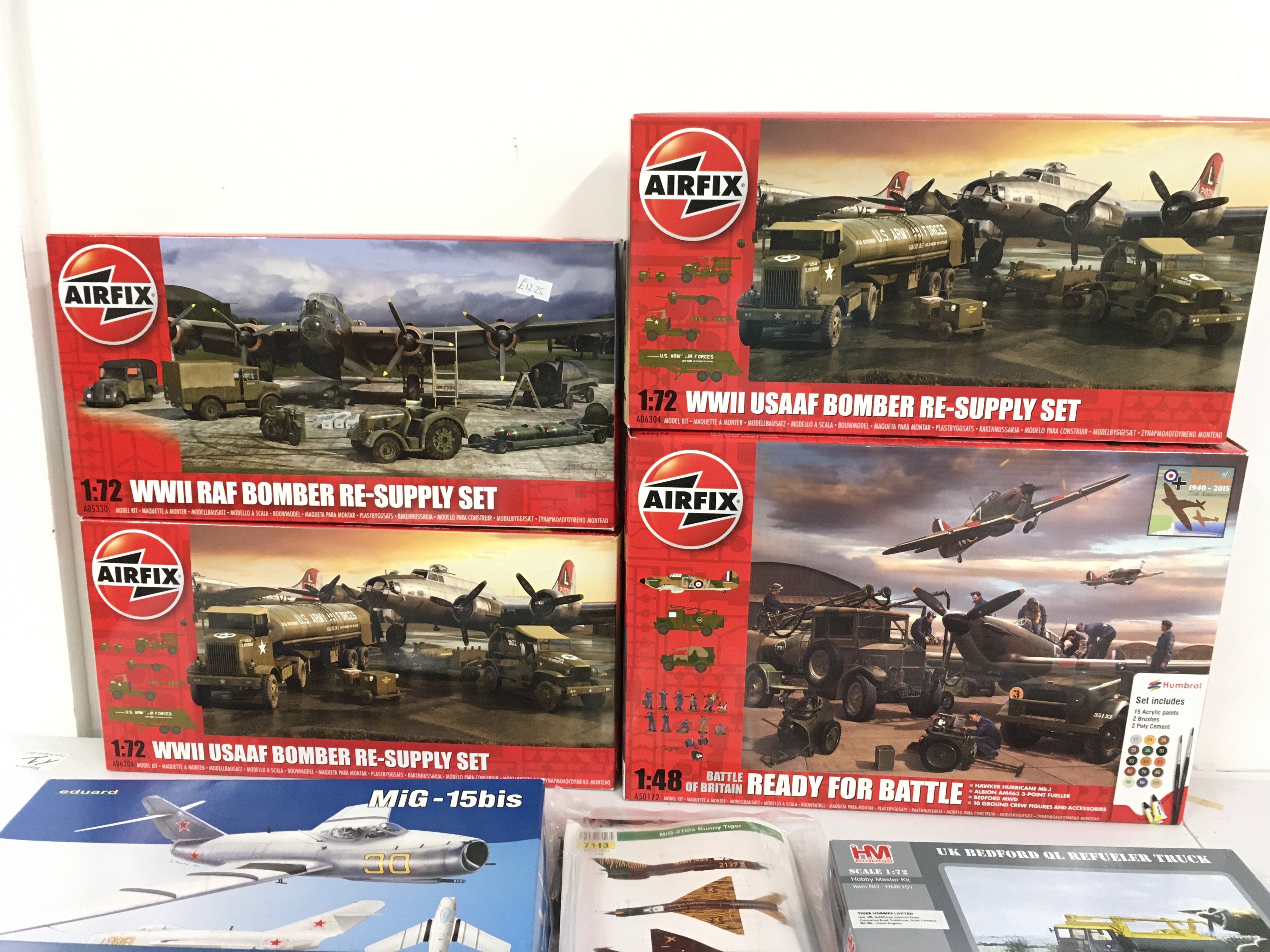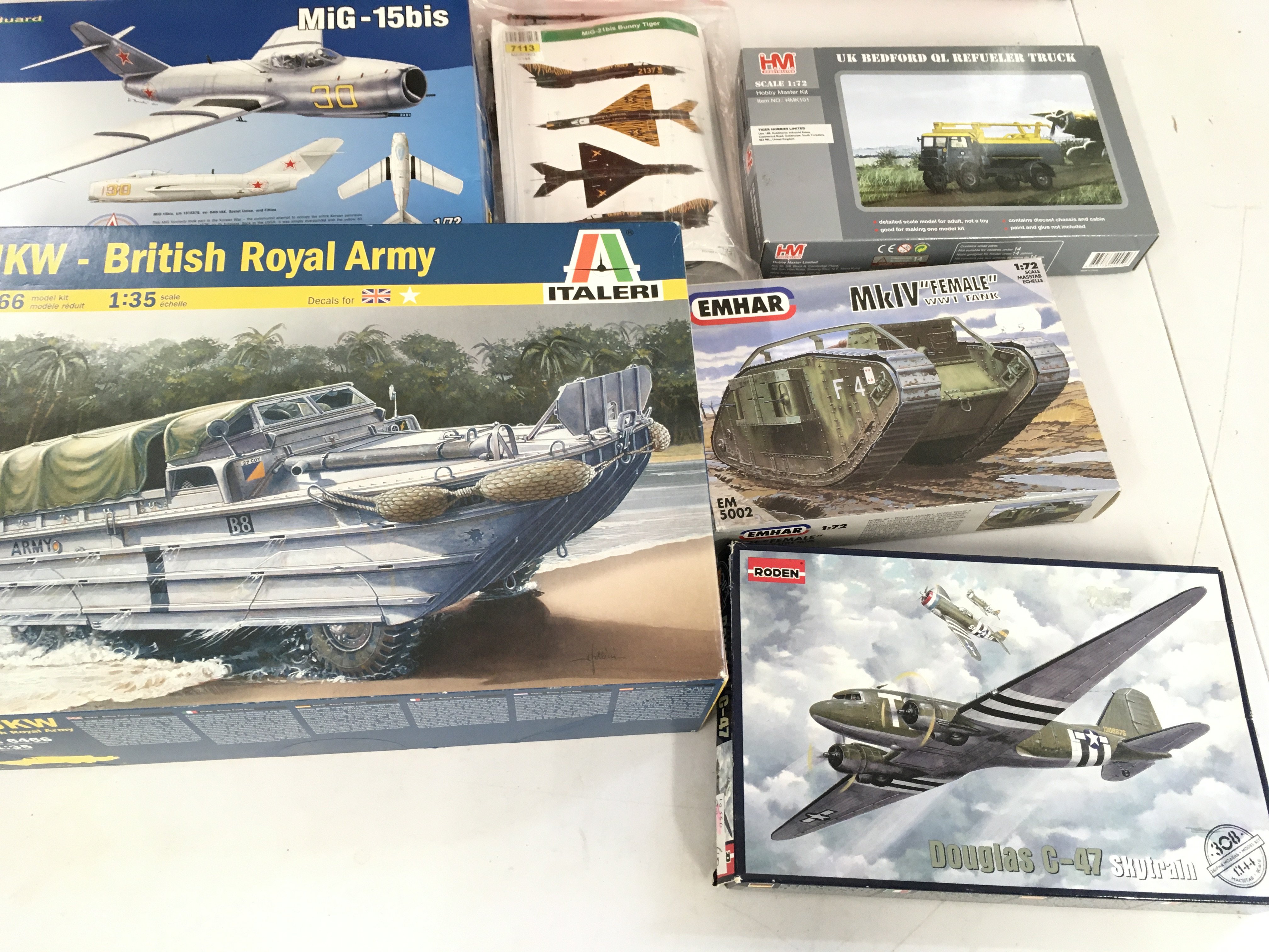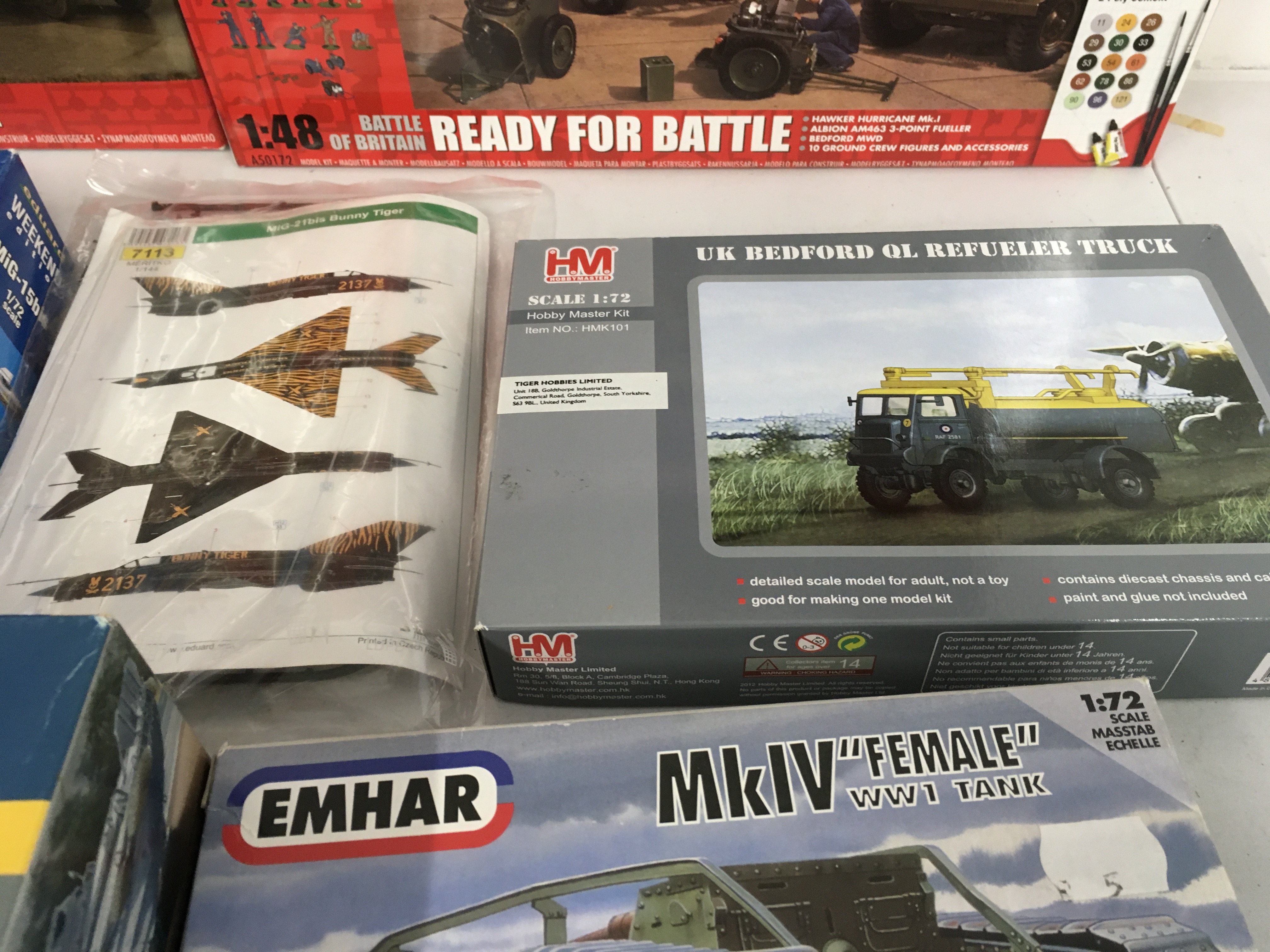 A collection of unstarted boxed plastic model kits by Airfix..Italeri..Emhar etc. features military aircraft and vehicles. No reserve