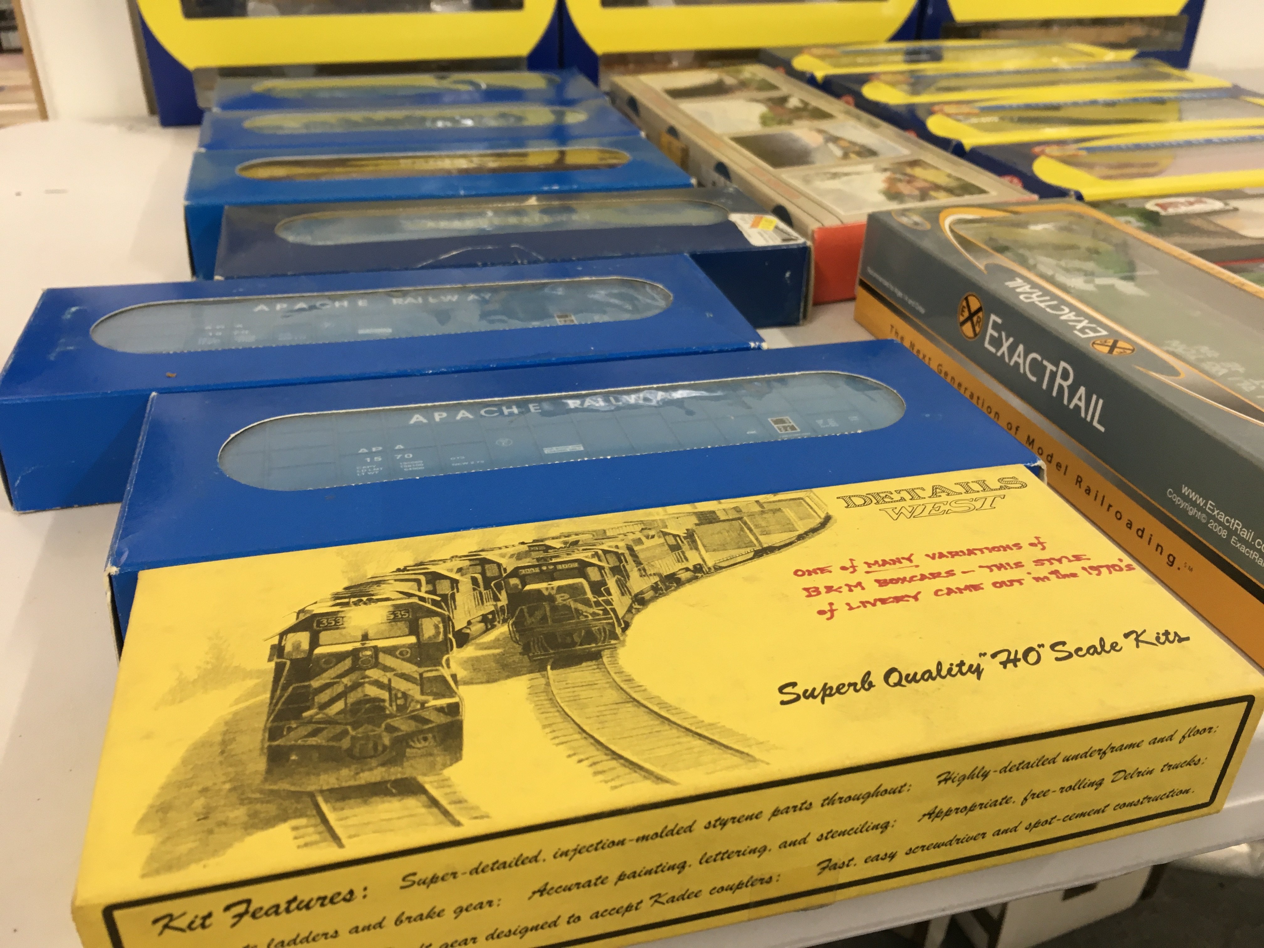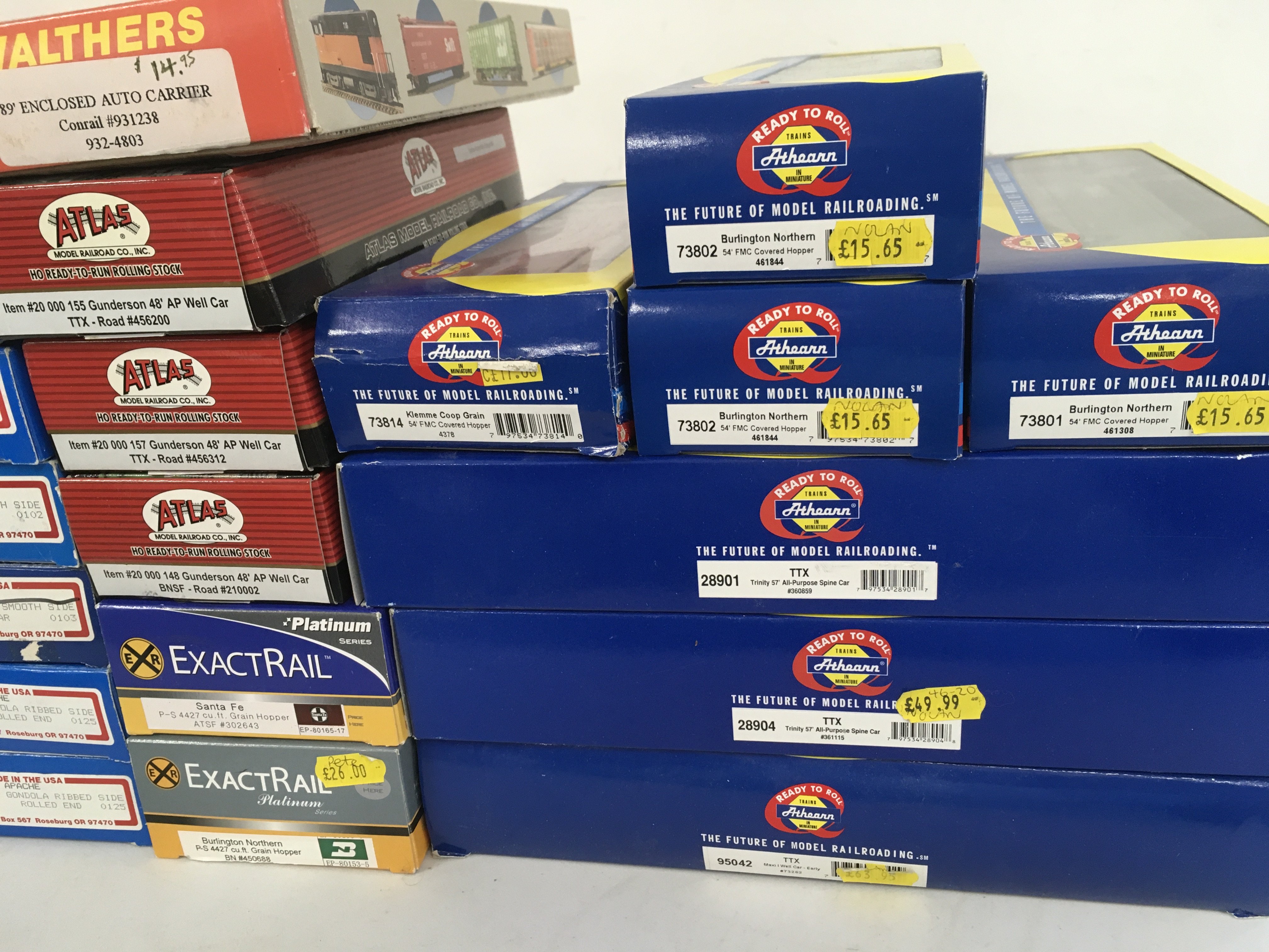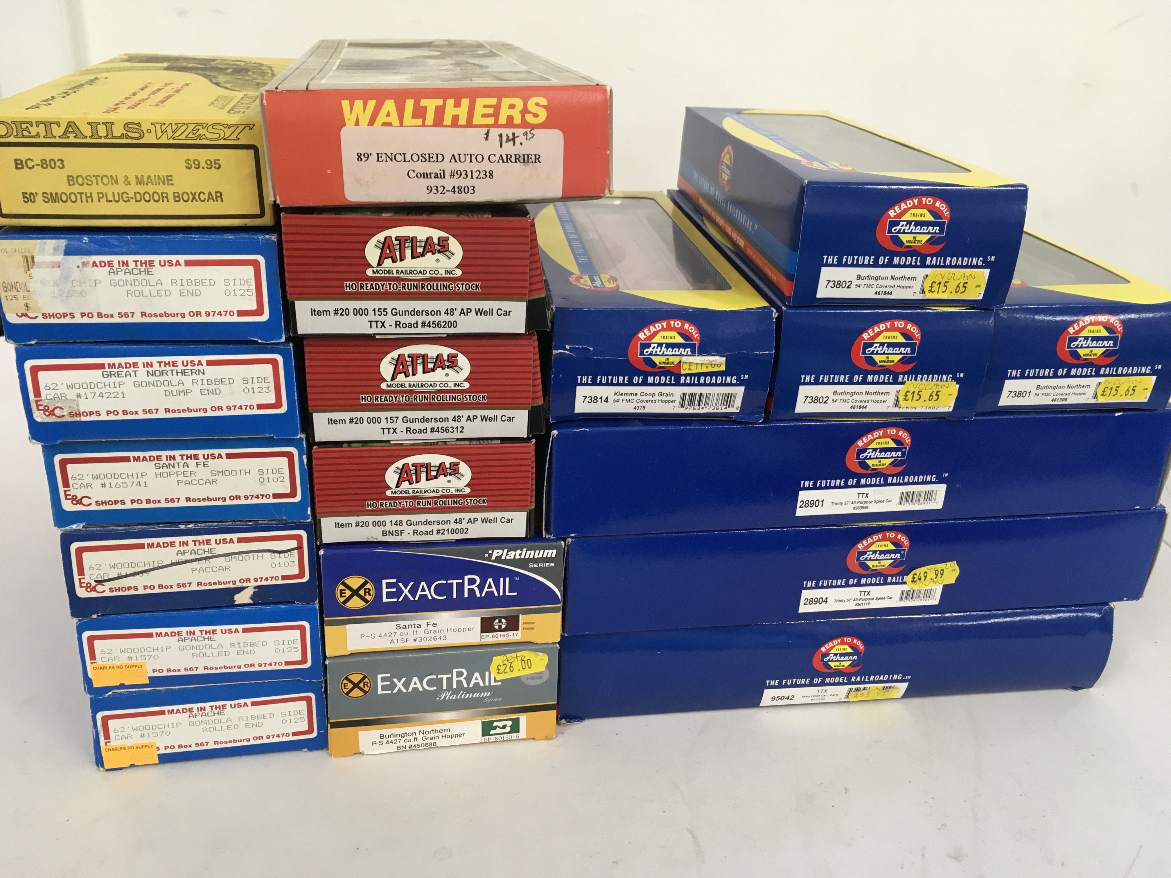 Collection of boxed HO gauge model railway model kits and ready to run rolling stock. Manufacturers include Atlas..Athearn..EC..Walthers etc. no reserve