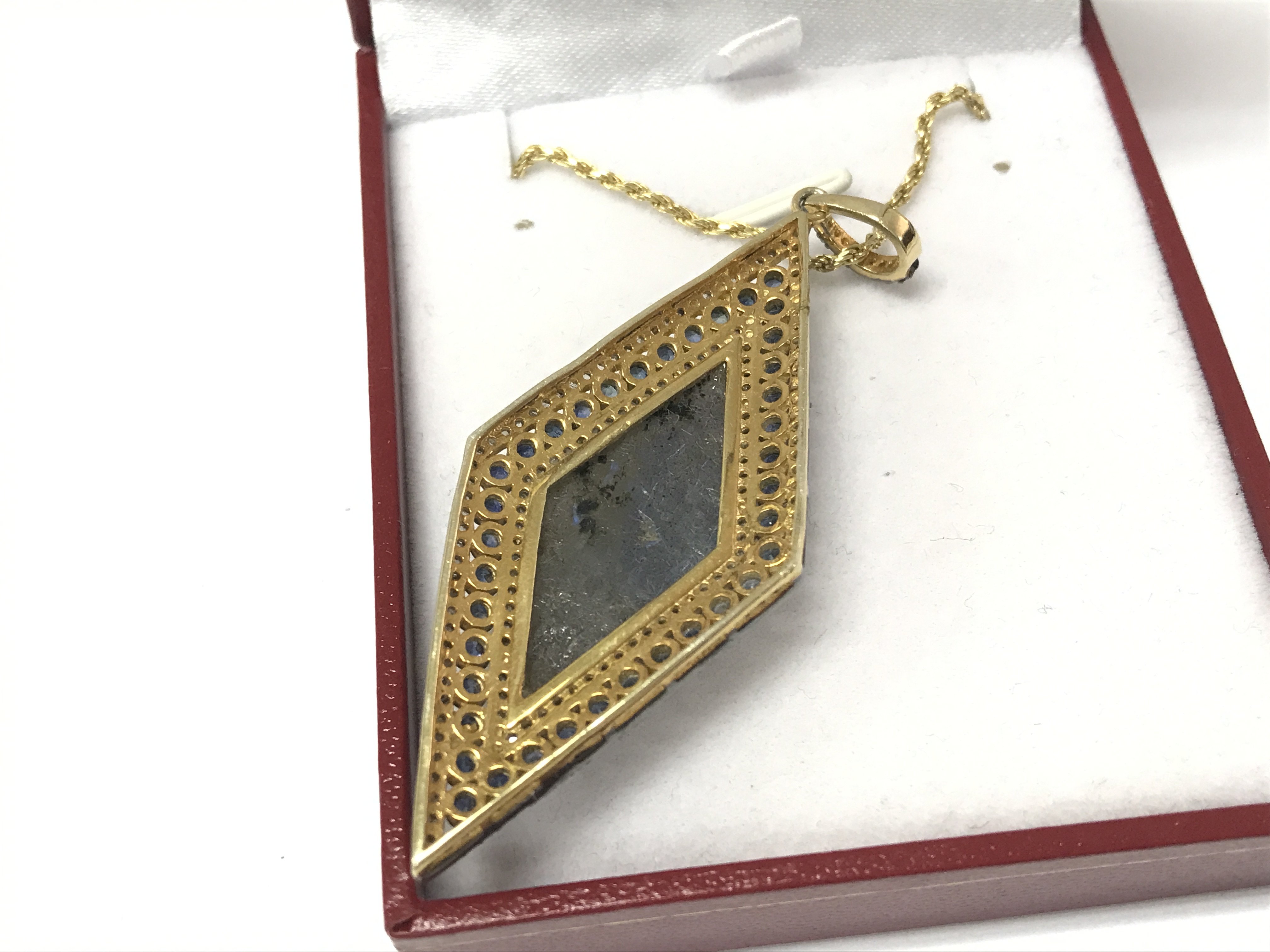 A large rhomboid pendant in yellow metal set with an oval cabochon labradorite surrounded by sapphires and diamonds on a gold plated silver chain. Labradorite 17.33ct sapphires 2.50ct and diamonds 1.25ct approximately.