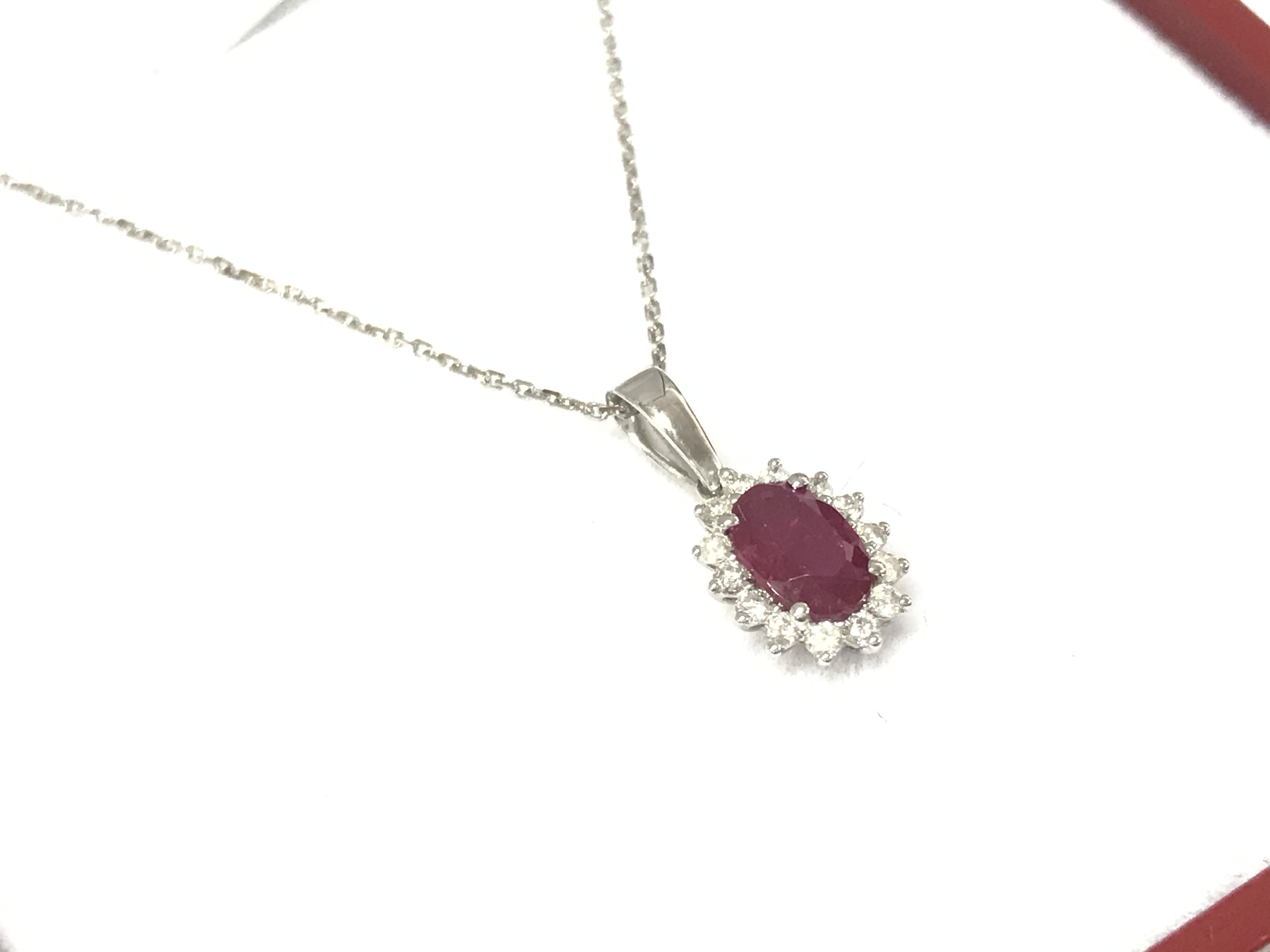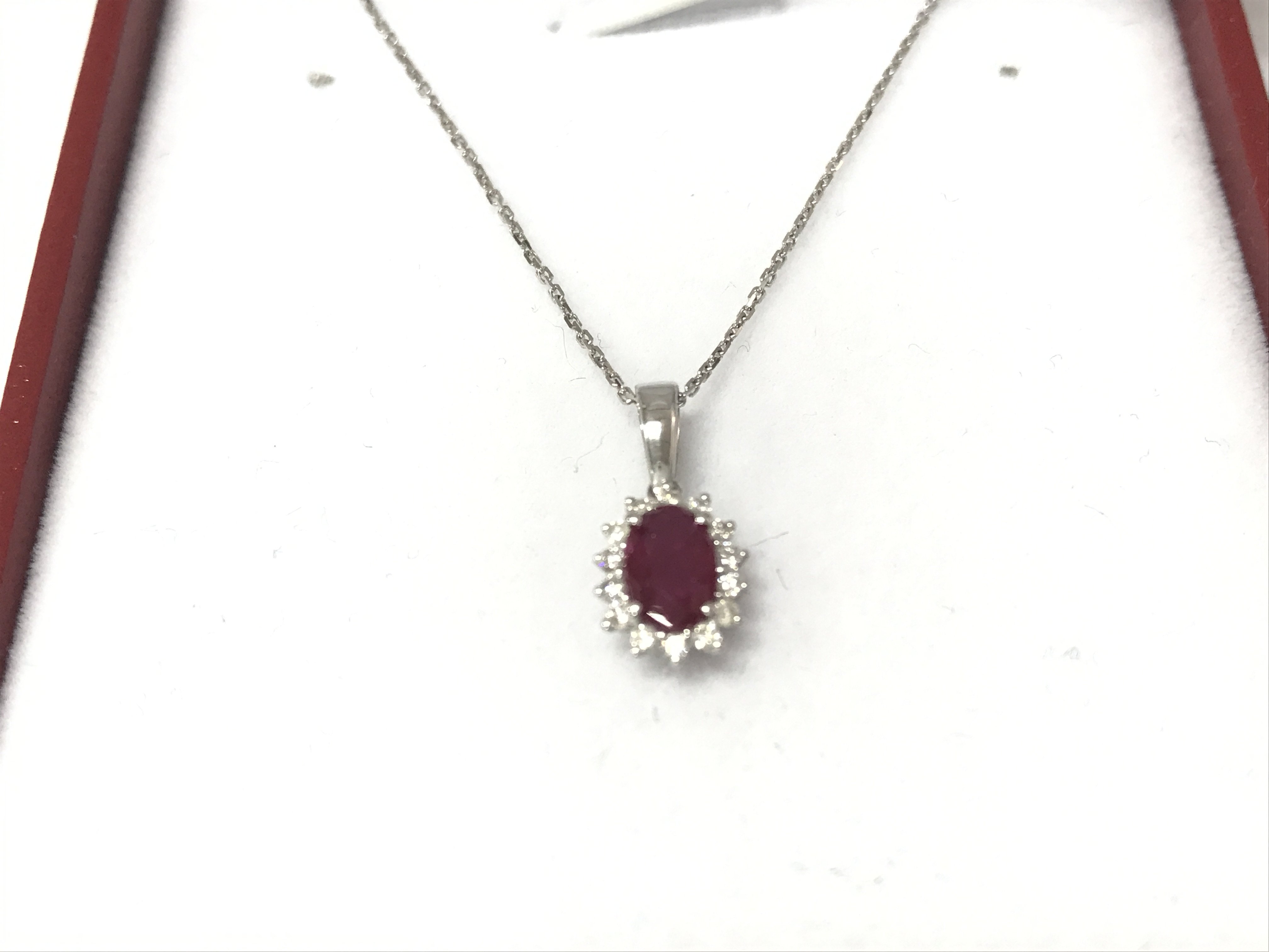 A 9ct white gold oval Ruby and diamond cluster pendant on a 9ct white gold chain. Ruby 0.53ct and diamonds 0.13ct. Postage B