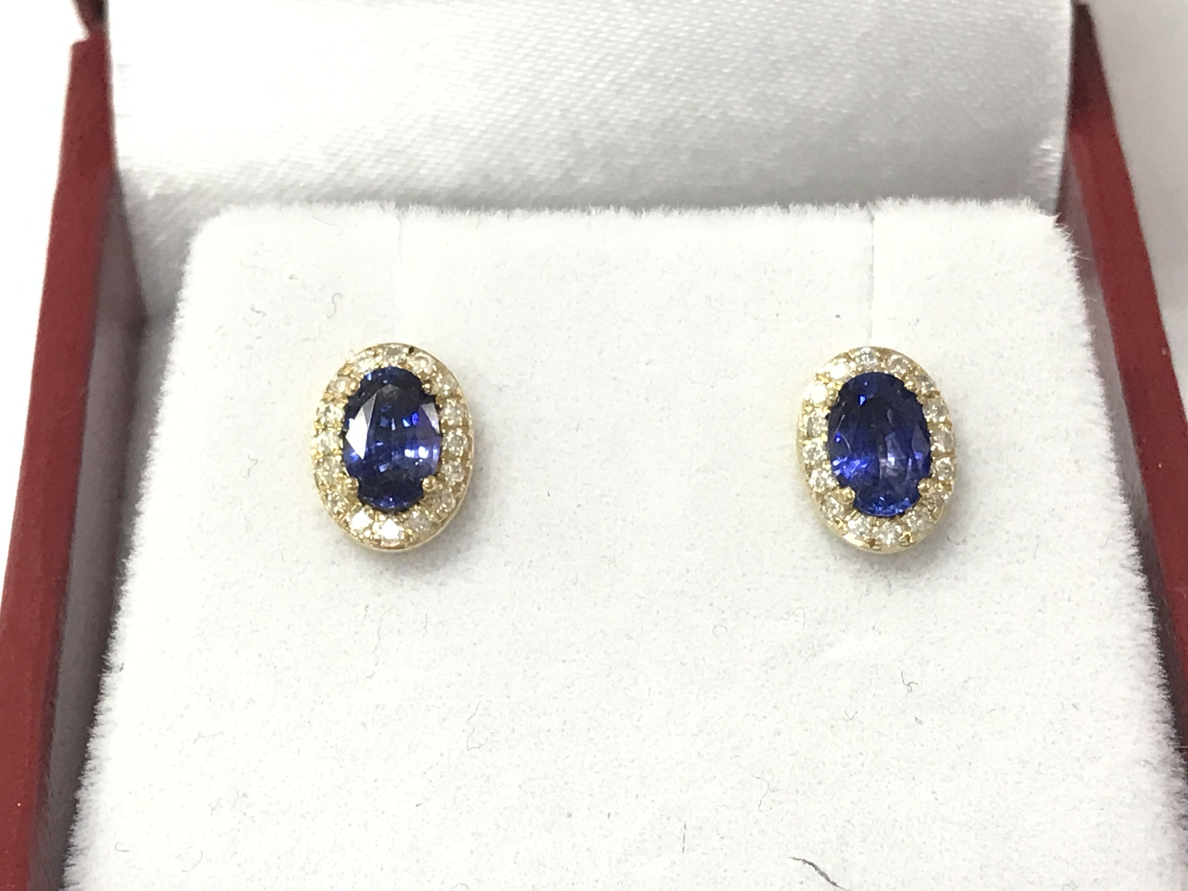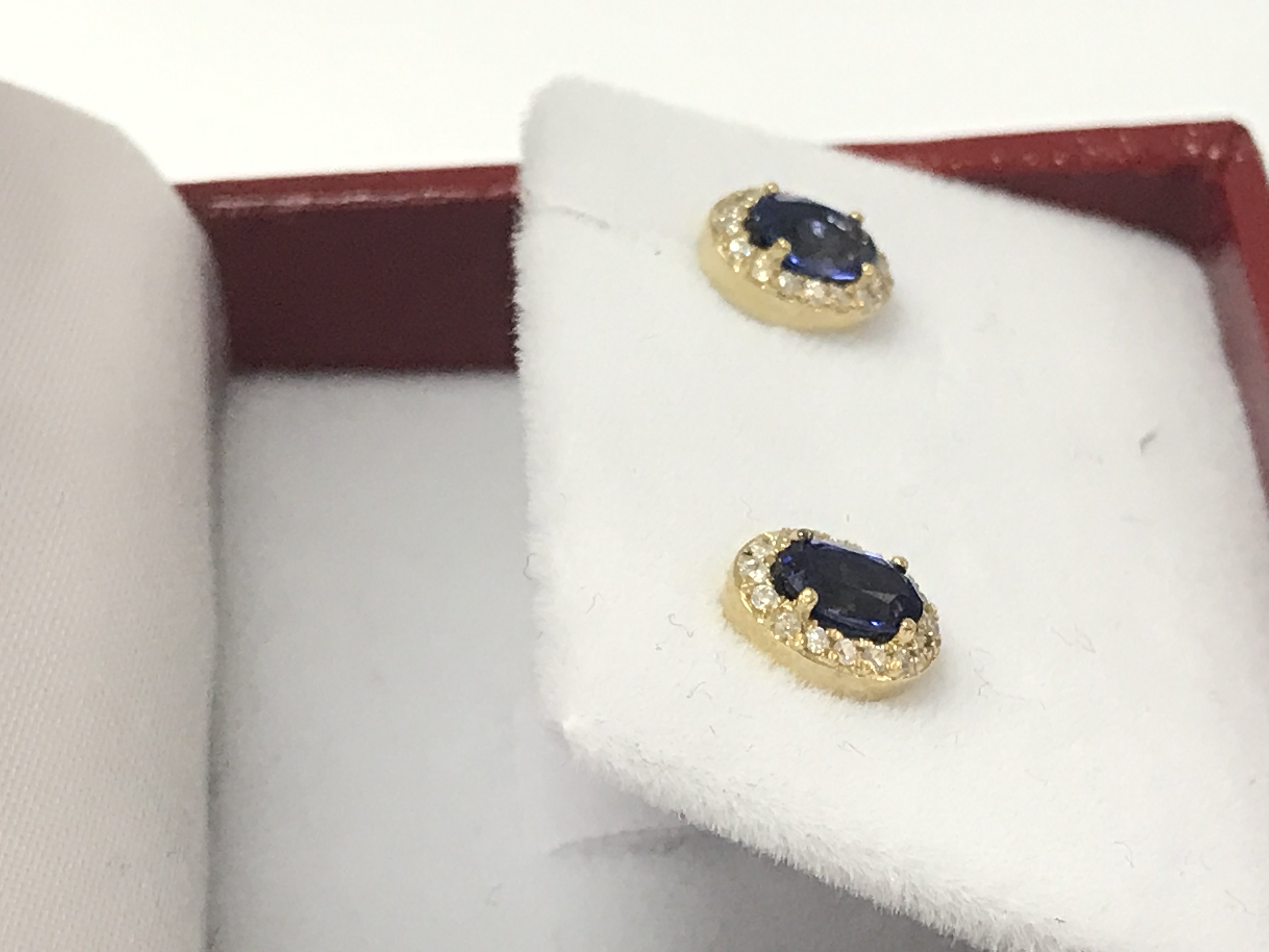A pair of 9ct gold oval sapphire and diamond cluster studs. Sapphires 0.76ct and diamonds 0.12ct. Postage B